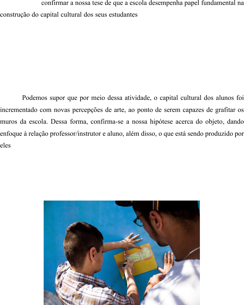 Camila Paiva (13636827) - Cauan da Silva Rabello (13837025) - Daniela Andressa Baez Garcia de Oliveira (13743726) - Gabriel João da Cunha Berton (5108173) – vespertino Atividade de Leitura Orientada 2 Selecionamos algumas imagens, disponíveis em um dos blogs da Imprensa Jovem (projeto desenvolvido pelos alunos e professores da E.M.E.F Profª Marili Dias). Elas serviriam para confirmar a nossa tese de que a escola desempenha papel fundamental na construção do capital cultural dos seus estudantes. Sabemos que as imagens de natureza etique devem ser registradas pelo pesquisador, a qual pretendemos trabalhar, entretanto, pegamos as fotografias abaixo apenas como exemplos. Nas duas imagens abaixo, há a representação de uma atividade cultural realizada pelos alunos, professores e entorno, isto é, a comunidade escolar. Fazemos uso dessas imagens porque vemos na oficina de grafite uma forma da escola introduzir atividades culturais, onde os alunos têm contato com diferentes expressões artísticas, nesse caso, o grafite. Podemos supor que por meio dessa atividade, o capital cultural dos alunos foi incrementado com novas percepções de arte, ao ponto de serem capazes de grafitar os muros da escola. Dessa forma, confirma-se a nossa hipótese acerca do objeto, dando enfoque à relação professor/instrutor e aluno, além disso, o que está sendo produzido por eles. Entretanto, essas imagens não são capazes de elucidar que os sujeitos em questão residem na periferia, muito menos das suas respectivas relações com a cultura institucionalmente aceita erudita. Como consequência, as imagens não são capazes de ilustrar o objeto por completo, apenas um de seus aspectos. Instrutor auxiliando aluno na produção do grafite Por quê? Boa reflexão. Mas o capital cultural ser incrementado pela escola não é uma premissa do trabalho de vocês? Afinal (e me corrijam se estiver enganada), o interesse não seria nas formas da escola de transmitir e disseminar um capital cultural erudito? Comunidade escolar produzindo estêncil para a produção do grafite Imagens disponíveis em: http://portalmarilidias.blogspot.com/2014/08/1-fuzue-dos- palmares.html http://portalmarilidias.blogspot.com/2014/08/1-fuzue-dos-palmares.html http://portalmarilidias.blogspot.com/2014/08/1-fuzue-dos-palmares.html Excelente escolha de imagens, no geral uma boa comunicação escrita. Ficou faltando reflexão mais aprofundada sobre elas: no caso da escolha de imagens não etiques (ou seja, emiques), há uma série de perguntas que podem ser exploradas: quem produziu a imagem? Onde ela está sendo exibida? O que ela retrata? O que o enquadramento mostra e o que ele deixa de mostrar? O que a fotografia está tentando "ilustrar"? Lembrem-se de articular os *dois* textos obrigatórios na elaboração da atividade, vocês tem espaço de sobra! Highlight Highlight Highlight que site é esse? que tipo de informação está associado a essas imagens?