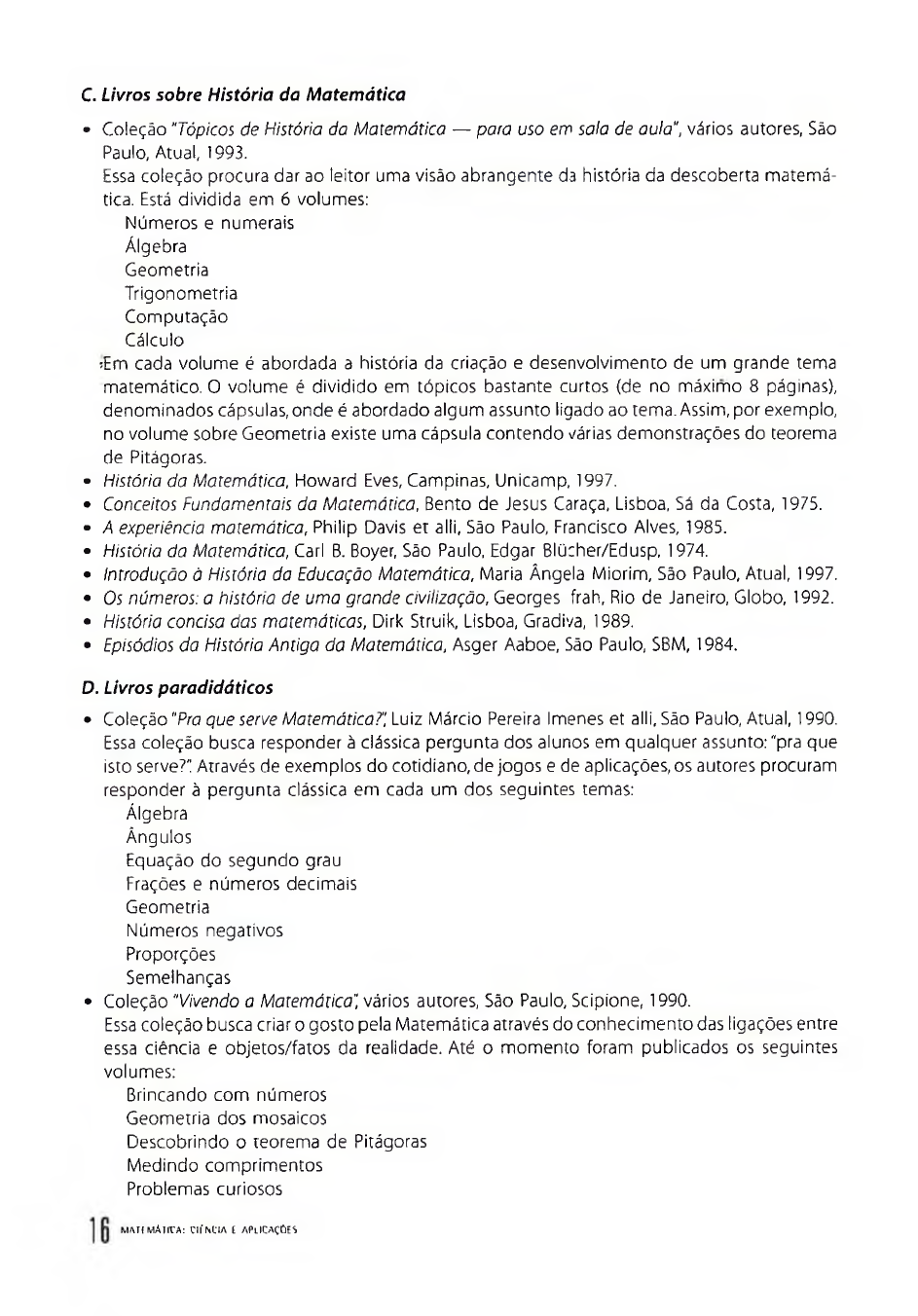 C . L iv r o s s o b r e H i s t ó r ia d a M a t e m á t i c a • Coleção "Tópicos de História da Matemática — para uso em sala de aula", vários autores, São Paulo, Atual, 1993. Essa coleção procura dar ao leitor uma visão abrangente da história da descoberta matemá tica. Está dividida em 6 volumes: Números e numerais Álgebra Geometria Trigonometria Computação Cálculo ím cada volume é abordada a história da criação e desenvolvimento de um grande tema matemático. O volume é dividido em tópicos bastante curtos (de no máximo 8 páginas), denominados cápsulas,onde é abordado algum assunto ligado ao tema. Assim, por exemplo, no volume sobre Geometria existe uma cápsula contendo várias demonstrações do teorema de Pitágoras. • História da Matemática, Howard Eves, Campinas, Unicamp, 1997. • Conceitos Fundamentais da Matemática, Bento de Jesus Caraça, Lisboa, Sá da Costa, 1975. • A experiência matemática, Philip Davis et alli, São Paulo, Francisco Alves, 1985. • História da Matemática, Carl B. Boyer, São Paulo, Edgar Blücher/Edusp, 1974. • Introdução à História da Educação Matemática, Maria Ângela Miorim, São Paulo, Atual, 1997. • Os números: a história de uma grande civilização, Georges frah, Rio de Janeiro, Globo, 1992. • História concisa das matemáticas, Dirk Struik, Lisboa, Gradiva, 1989. • Episódios da História Antiga da Matemática, Asger Aaboe, São Paulo, SBM, 1984. D . L iv r o s p a r a d i d á t i c o s • Coleção "Pra que serve Matemática?", Luiz Márcio Pereira Imenes et alli, São Paulo, Atual, 1990. Essa coleção busca responder à clássica pergunta dos alunos em qualquer assunto: "pra que isto serve?'! Através de exemplos do cotidiano, de jogos e de aplicações, os autores procuram responder à pergunta clássica em cada um dos seguintes temas: Álgebra Ângulos Equação do segundo grau Frações e números decimais Geometria Números negativos Proporções Semelhanças • Coleção "Vivendo a Matemática", vários autores, São Paulo, Scipione, 1990. Essa coleção busca criar o gosto pela Matemática através do conhecimento das ligações entre essa ciência e objetos/fatos da realidade. Até o momento foram publicados os seguintes volumes: Brincando com números Geometria dos mosaicos Descobrindo o teorema de Pitágoras Medindo comprimentos Problemas curiosos M M [M A jir A : CIÍNCIA í A P lICA ÇO fi Polígonos, centopeias e outros bichos Geometria das dobraduras Lógica? É lógico. Os poliedros de Platão e os dedos da mão Semelhança não é mera coincidência Os números na história da civilização A numeração indo-arábica Par ou ímpar Na terra dos noves-fora Desenhos da África • Coleção"Conrondo a História da Matemática”,Oscar Augusto Guelli Neto, São Paulo, Ática, 1996. • Coleção "A descoberta da Matemática", Luzia Faraco et alli, São Paulo, Ática, 1991. E . L iv r o s s o b r e q u e s t õ e s c u r io s a s d e M a te m á t ic a • As maravilhas da Matemática, Malba Tahan, Rio de Janeiro, Bloch, 1983. • Matemática divertida e curiosa, Malba Tahan, Rio de Janeiro, Record, 1991. • O homem que calculava, Malba Tahan, Rio de Janeiro, 1989. • Coleção "O prazer da Matemática", vários autores, Lisboa, Gradiva, 1991. • Divertimientos lógicos y matemáticos, M. Mataix, Barcelona, Marcombo,1979. • El discreto encanto de Ias matemáticas, M Mataix, Barcelona, Marcombo,1979. • Aprenda Álgebra brincando, Perelman I, São Paulo, Hemmus, 1992. F . R e v is t a s s o b r e e n s in o d e M a te m á t ic a • Revista do professor de Matemática, São Paulo, SBM. Revista quadrimestral que procura apresentar artigos variados de interesse para o professor de Matemática. São abordados temas controversos, problemas desafiadores, comentários sobre livros, questões de olimpíadas, experiências pedagógicas inovadoras, etc. Essa revista começou a ser editada em 1982 e pode ser recebida gratuitamente pelo professor, bastando que envie seus dados pessoais para RPM — Caixa Postal 66.281 — CEP 05389-970 — São Paulo — SP. • Revista Nova Escola, São Paulo, Fundação Victor Civita. • Temas e Debates, São Paulo, SBEM. 17MANüAl an PRHFESSQR