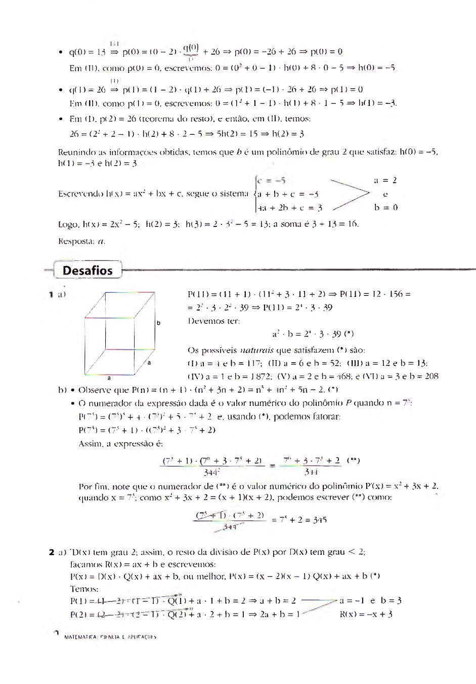 P< 11) = (11 + 1) • (1 l J + 3 ■ 11 + 2) => P ( l l ) = 12 ■ 156 == 2; • 3 • 2- • 39 => P U 1) = 2‘ • 3 • 39 b I levem os ter: a2 ■ b = 2" ■ 3 ■ 39 (*.)O s possíveis n a tu ra is q u e satisfazem O ) são:(I > a = -Í e b = 117; (TT) a = 6 e h = 52; (111) a = 12 e b = 13:(IV) a = 1 e b = 1 872; (V) a = 2 e h = 368: e (VI) a = 3 e b = 208b) • O b serve q u e P(n> = (n + l) ■ (n : 4 3n 4 2) = n ’ 4 m 2 + 5n - 2. (*)■ O num erador da expressão dada é o valor num érico d o polinôm io P q u an d o n = 7':[’<7') = (~ V + 4 - ( " ) 2 4 5 • v + 2 e . usando (*). p o d em o s fatorar:P(7') = (7-! + 1) ■ K7-b- + 3 ■ + 2)Assim , a expressão é: (7‘ + 1) • (7" + 3 ■ 7 ’ + 2) _ 7" + 3 • 7- + 2 (**)343: 3 1 iPor fim. note q u e o num erador de (**) é o valor num érico do polin ô m io P'(x) = x 2 4 3x + 2. q u an d o x = 7-*; co m o x J + 3x 4 2 = (x 4 l)(x 4- 2). pod em os escrever (**) com o:( ji - r f) ■ 4- 2)344'' = 7 ' 4- 2 = 345
