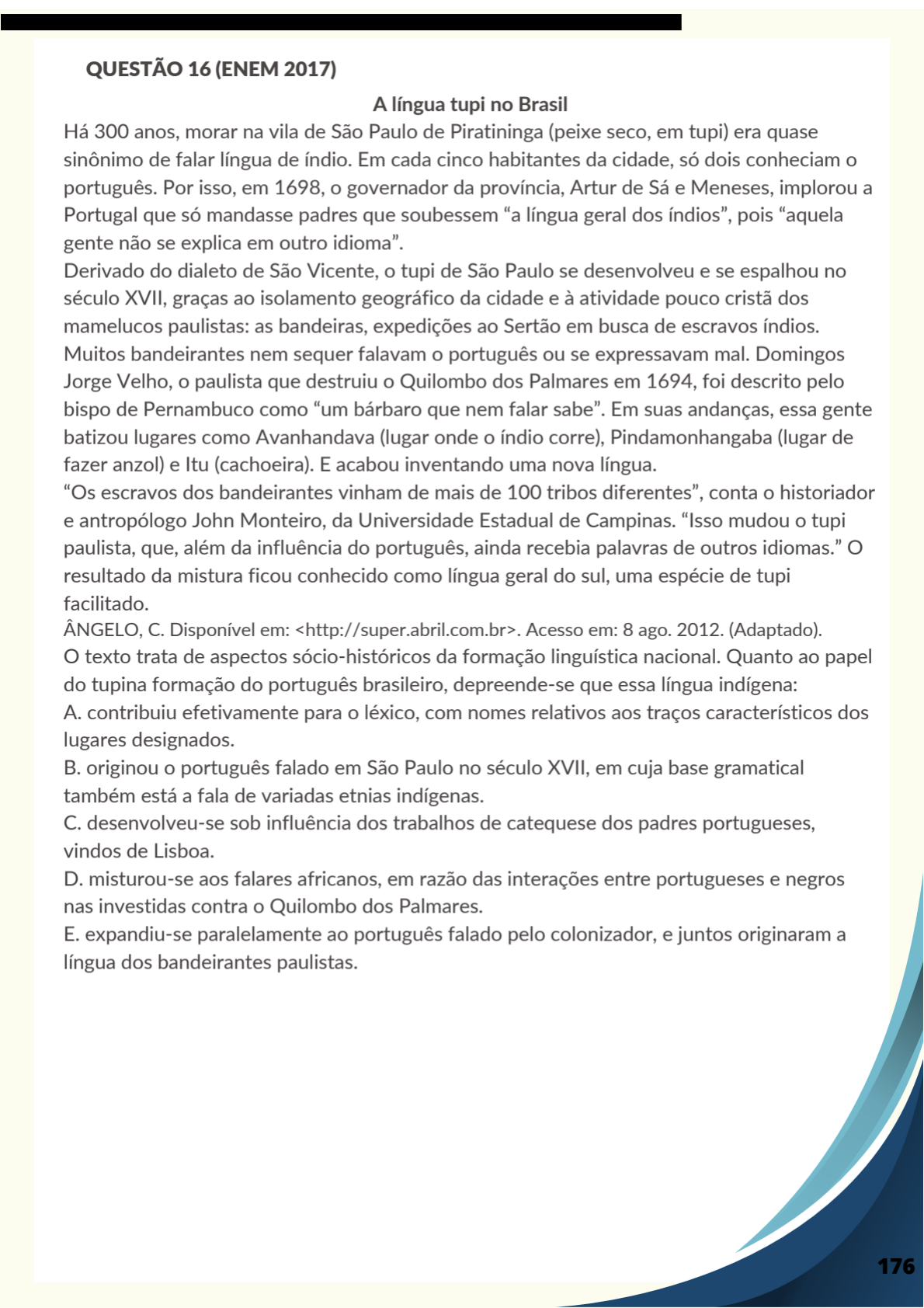 “Acuenda o Pajubá”: conheça o “dialeto secreto” utilizado por gays e travestis Com origem no iorubá, linguagem foi adotada por travestis e ganhou a comunidade “Nhaí, amapô! Não faça a loka e pague meu acué, deixe de equê se não eu puxo teu picumã!” Entendeu as palavras dessa frase? Se sim, é porque você manja alguma coisa de pajubá, o “dialeto secreto” dos gays e travestis. Adepto do uso das expressões, mesmo nos ambientes mais formais, um advogado afirma: “É claro que eu não vou falar durante uma audiência ou numa reunião, mas na firma, com meus colegas de trabalho, eu falo de ‘acué’ o tempo inteiro”, brinca. “A gente tem que ter cuidado de falar outras palavras porque hoje o pessoal já entende, né? Tá na internet, tem até dicionário…”, comenta. O dicionário a que ele se refere é o Aurélia, a dicionária da Ungua afíada, lançado no ano de 2006 e escrito pelo jornalista Angelo Vip e por Fred Libi. Na obra, há mais de 1 300 verbetes revelando o significado das palavras do pajubá. Não se sabe ao certo quando essa linguagem surgiu, mas sabe-se que há claramente uma relação entre o pajubá e a cultura africana, numa costura iniciada ainda na época do Brasil colonial. Disponível em: www.midiamax.com.br. Acesso em: 4 abr. 2017 (adaptado) Da perspectiva do usuário, o pajubá ganha status de dialeto, caracterizando-se como elemento de patrimônio linguístico, especialmente por: A. ter mais de mil palavras conhecidas. B. ter palavras diferentes de uma linguagem secreta. C. ser consolidado por objetos formais de registro. D. ser utilizado por advogados em situações formais. E. ser comum em conversas no ambiente de trabalho. QUESTÃO 18 (ENEM 2018) Pode um idioma considerado extinto e pouco documentado ser novamente parte ativa do patrimônio linguístico? A melhor maneira de saber como ocorre uma revitalização linguística é examinando um marco na luta indígena: a recuperação da língua pataxó. Eni Orlandi, da Universidade Estadual de Campinas, esteve na equipe que coletou e analisou evidências linguísticas que ajudaram a reconstituir a variante do pataxó falada mais ao norte da região de Porto Seguro (BA), a hãhãhãe. “Os pataxós viveram perseguições e movimentos de dispersão. A partir dos anos 1980, entretanto, conseguiram criar um espaço em que reivindicaram seu direito ao território tradicional que haviam perdido. Outras perdas acompanharam essa. Entre os bens perdidos, estava a lingua. A posse da língua significa para eles o seu desejo de ser índio, em um momento de ameaça de extermínio”, diz a pesquisadora. “A pesquisa foi feita em condições difíceis: uma só informante, Baheta, muito idosa, sem interlocutores reais (só os da memória, imaginados), e experimentando dificuldades de lembrar; em condições de guerra à sua cultura; uma parte da identidade estigmatizada, já voltada ao esquecimento”, diz Orlandi no livro Terra à vista. QUESTÃO 19 (ENEM 2017) 178