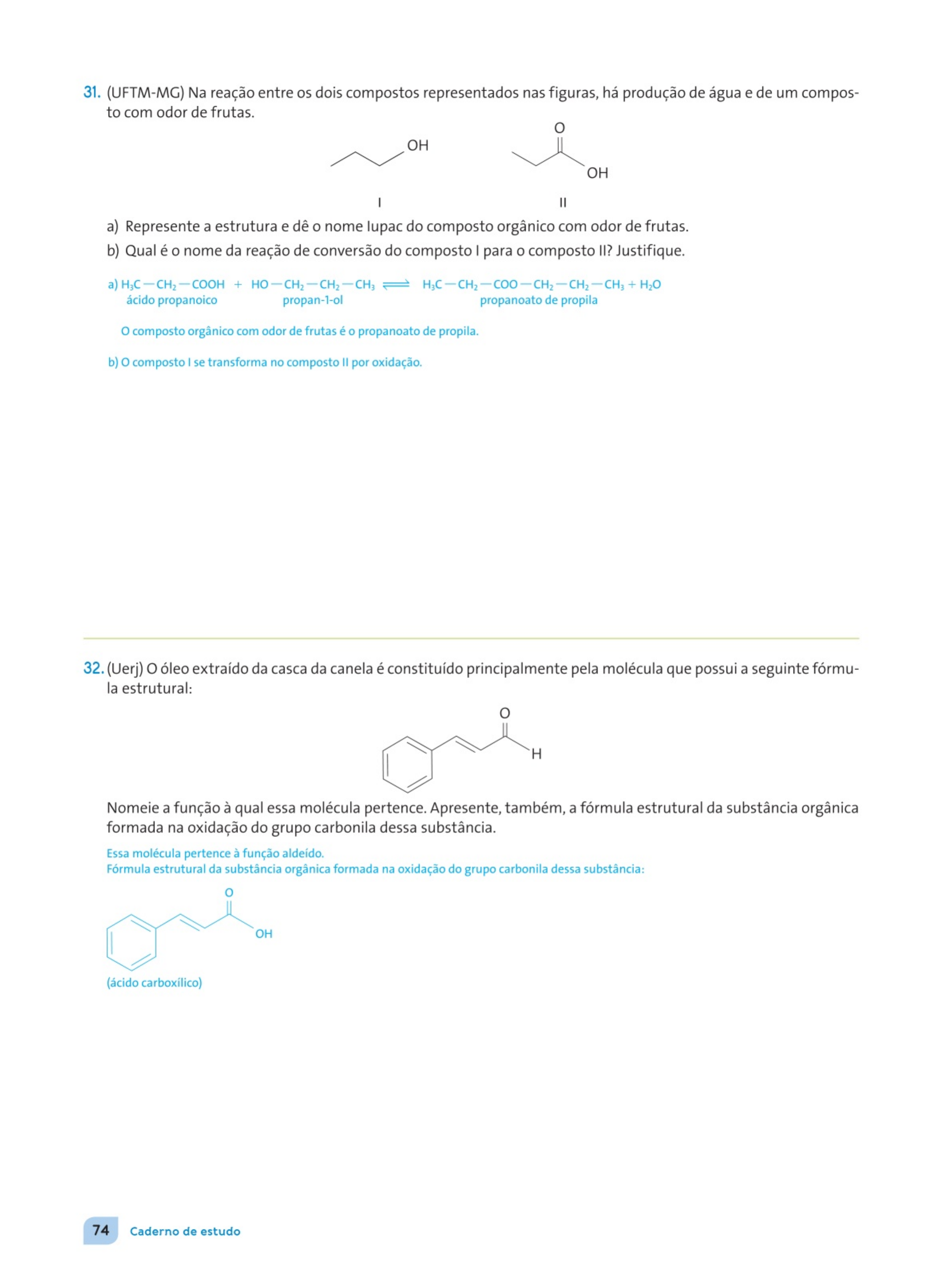 31. (UFTM-MG) Na reação entre os dois compostos representados nas figuras, há produção de água e de um compos to com odor de frutas. OH ~ o ~ li OH a) Represente a estrutura e dê o nome lupac do composto orgânico com odor de frutas. b) Qual é o nome da reação de conversão do composto I pa ra o composto li ? Justifique. a) H3C- CH2 - COOH ácido propanoico + HO - CH2- CH2 - CH3 propan-1 -ol CH2 - COO - CH2 - CH2 - CH3 -,- H20 propanoato de propila O composto orgânico com odor de frutas é o propanoato de propila. b) O composto I se transforma no composto li por oxidação. 32. (Uerj) O ó leo extraído da casca da canela é constituído principalmente pela molécula que possui a seguinte fórmu la estrutural: o H Nomeie a função à qua l essa molécula pertence. Apresente, também, a fórmula estrutural da substância orgânica formada na oxidação do grupo carbonila dessa substância. Essa molécula pertence à função aldeído. Fórmula estrutural da substância orgânica formada na oxidação do grupo carbonila dessa substância: o OH (ácido carboxílico) 74 Caderno de estudo 33. {Vunesp-SP) O éster etanoato de n-octila é a substância responsável pelo aroma característico das laranjas, poden do ser sintetizada em uma única etapa de síntese. Apresente a equação para a reação de produção do éster etano ato de n-octila, empregando como reagentes um álcool e um ácido carboxílico. HiC- COOH HO - CH2- (CH2)6-CH3 - H3C- COO - (CH2), - CHi ~ H20 34. {UFU-MG) O gás cloro, além de sua importância no t ratamento de água para o abastecimento das cidades, é utili zado como matéria-prima na fabricação de clorofórmio (CHCe 3), um solvente orgânico e anestésico externo. Are ação ocorre a partir do gás metano (CH4) e do gás cloro, em presença de luz solar, formando clorofórmio (CHCe 3) e gás clorídrico {HCe). Porém, por ser uma substância muito tóxica, o clorofórmio, mesmo em pequenas quantidades - em contato com a água - é um grande poluente. A legislação brasileira permite a presença de até 0,1 mg de clo rofórm io por litro de água, acima disso, a água é considerada não potável. Faça o que se pede. a) Escreva o nome do clorofórmio CHCe 3 segundo a lupac. b) Escreva a equação química balanceada entre o gás cloro e o gás metano, identificando o tipo de reação química. c) Explique, a partir de cálculos, o que ocorre com a potabilidade de 500 L de água contidos em um tanque domés tico em que, acidentalmente, fora adicionado clorofórmio produzido a partir de 106,5 mg de gás cloro e quanti dade suficiente de metano. a) Triclorometano. b) CH. (g) + 3 Ct2{g) -> CHCti(f) + 3 HCf(g) c) 3 mol c e2 ----- 1 mol CHce3 3 · 71 g 119,5 g 106,5 mg X x = 59,8 mg 500 L água ----- 59,8 mg clorofórmio 1 L y y = 0,12mg A concentração de clorofórmio (0,12 mg/L) está acima do lim ite estabelecido (0,1 mg/L). A água, portanto, não pode ser considerada potável. Reações orgânicas 75 35. (Unifesp) Considere a reação orgânica representada na equação e os valores de entalpia-padrão de formação (t.H~) das substâncias participantes da reação. Substância LlHf (kJ • mol -1 ) CH30H(e) - 239 CH3COOH(e) -484 x(e) -442 H20(f) -286 A substância X é um líquido inflamável usado como solvente na fabricação de colas. a) Escreva a fórmula estrutural da substância X e indique a função orgânica à qual ela pertence. b) Calcu le a entalpia da reação descrita. Como essa reação é classificada quanto ao calor de reação? a) CH30H(f) + CH1COOH(f) - CH1COOCH1(f) + H20(f) b) J.Hr - cl.H[p<odutos - J.H/,eagenl<> et anoato de metila (és ter) ilHr = [( 442 kJ) + (- 286 kJ)) - [(- 239 kJ) + ( 484 kJ)] ilHr - - 5 kJ Essa reação é classificada como exotérmica, uma vez que apresent a J.H < O. 36. (U FTM-MG) O ácido cítrico, substância presente em frutas cítricas e nos pós e comprimidos efervescentes, tem a seguinte fórmula estrutural: o o OH O HO OH OH a) Escreva a fórmula molecu lar e calcule a massa molar desse ácido em g/mol. b) Calcule o volume, em ml, de solução aquosa de NaOH 0,1 mol/L necessário para neutralizar completamente uma amostra de 0,002 mol desse ácido. a) C6H80 6; massa molar: 176 g/mol. b} 1 mol ácido cít rico ------ 3 mol NaOH 0,002 mol ácido cít rico x x = 0,006 mol NaOH 1 L solução --1000 m l solução -- 0,1 mol NaOH y 0,006 mol NaOH y = 60ml 76 Caderno de estudo 75-2 76-2 77-2