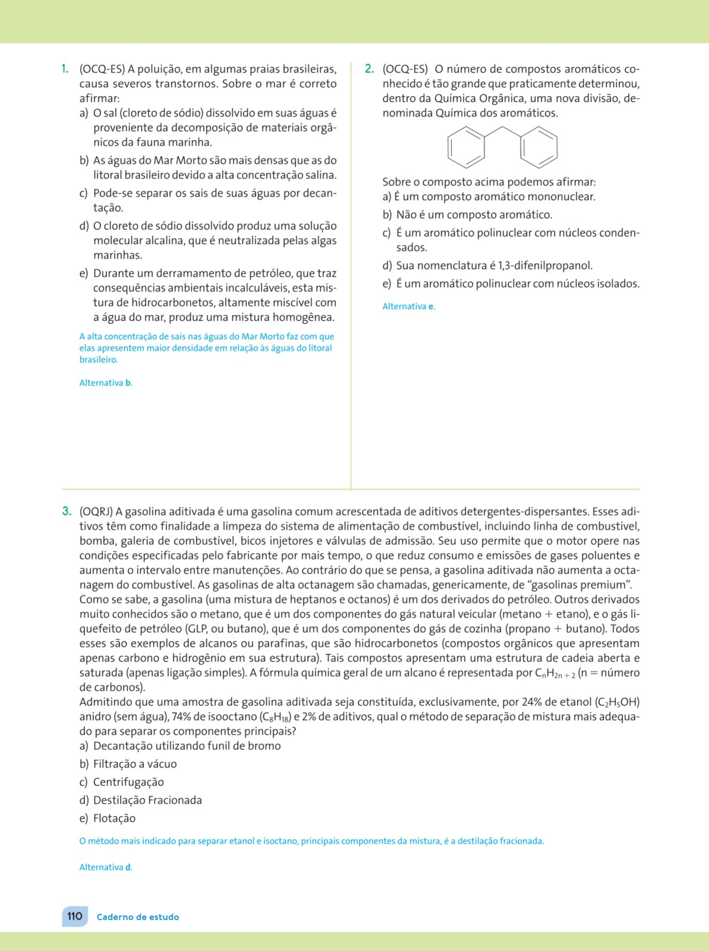 1. (OCQ-ES) A poluição, em algumas praias brasileiras, causa severos transtornos. Sobre o mar é correto afirmar: a) O sal (cloreto de sódio) dissolvido em suas águas é proveniente da decomposição de materia is orgâ nicos da fauna marinha. b) As águas do Mar Morto são mais densas que as do li toral brasileiro devido a alta concentracão sali na. ' c) Pode-se separar os sais de suas águas por decan tação. d) O cloreto de sódio dissolvido produz uma solução molecular alcali na, que é neutralizada pelas algas marinhas. e) Durante um derramamento de petróleo, que traz consequências ambientais incalculáveis, esta mis tura de hidrocarbonetos, altamente miscível com a água do mar, produz uma mistura homogênea. A alta concentração de sais nas águas do Mar Morto faz com que elas apresentem maior densidade em relação às águas do litora l bras ileiro. Alternativa b. 2. (OCQ-ES) O número de compostos aromáticos co nhecido é tão grande que praticamente determinou, dentro da Química Orgânica, uma nova divisão, de nominada Química dos aromáticos. Sobre o composto acima podemos afirmar: a) É um composto aromático mononuclea r. b) Não é um composto aromático. c) É um aromático polinuclear com núcleos conden- sados. d) Sua nomenclatura é 1,3-difenilpropanol. e) É um aromático polinuclear com núcleos isolados. Alternativa e. 3. (OQRJ) A gasolina aditivada é uma gasolina comum acrescentada de aditivos detergentes-dispersantes. Esses adi tivos têm como finalidade a limpeza do sistema de alimentação de combustível, incluindo linha de combustível, bomba, galeria de combustível, bicos injetores e válvulas de admissão. Seu uso permite que o motor opere nas condições especificadas pelo fabr icant e por mais tempo, o que red uz consumo e emissões de gases poluentes e aumenta o intervalo entre manutenções. Ao contrário do que se pensa, a gasolina aditivada não aumenta a octa nagem do combustível. As gasolinas de alta octanagem são chamadas, genericamente, de "gasoli nas premi um". Como se sabe, a gasolina (uma mistura de heptanos e octanos) é um dos derivados do petróleo. Outros derivados mu ito conhecidos são o metano, que é um dos componentes do gás natural veicu lar (metano + etano), e o gás li quefeito de petróleo (GLP, ou butano), que é um dos componentes do gás de cozinha (propano + butano). Todos esses são exemplos de alcanos ou parafinas, que são hidrocarbonetos (compostos orgânicos que apresentam apenas carbono e hidrogênio em sua estrutura). Tais compostos apresentam uma estrutura de cadeia aberta e saturada (apenas ligação simples). A fórmula química geral de um alcano é representada por CnH2n + 2 (n = número de carbonos). Admitindo que uma amostra de gasolina ad it ivada seja constituída, exclusivamente, por 24% de etanol (C2H50H) anidro (sem água). 74% de isooctano (C8H18) e 2% de aditivos, qual o método de separação de mist ura mais adequa do para separar os componentes principais? a) Decantação utilizando funil de bromo b) Fi lt ração a vácuo c) Centrifugação d) Destilação Fracionada e) Flotação O método mais indicado para separar etanol e isoctano, principais componentes da mistura, é a destilação fracionada. Alternativa d. 110 Caderno de estudo 4. (OCQ-ES) De acordo com as normas da lupac o nome correto do composto abaixo é: CH3 CH3 1 1 CH3 - C - CH2 - CH - CH3 1 CH3 a) 2,2,4-t rimeti lpentano. b) 3-isopropilpent ano. c) 2,4,4-trimetilpentano. d} 2-met il-4-etilpent ano. e) pentano. Alternativa a. 5. (OCQ-ES) A substância 3-met il-2-buteno tem fórmu la molecular: a) (4H6. b} (4Hs. c) (4H10- d) CsH,o e) CsH12- Fórmula estrutural do 3-metil -2-buteno: CHi -C = CH-CHi 1 CHi Fórmula molecular: C;H,o Alternativa d. 6. (OQRJ) Dois frascos t ransparentes e sem rótulos contém dois líquidos incolores. Sabe-se que o conteúdo de um dos frascos é álcool metílico e do outro álcool etíl ico. Algumas propriedades características das substâncias estão apre sentadas no quadro abaixo. Substância Densidade Ponto de fusão Ponto de ebulição (g/cm3) (°C) álcool metíl ico 0,79 - 98 álcool etílico 0,79 -117 As propriedades que permitem identificar o conteúdo de cada f rasco são: a) a densidade e o ponto de fusão. b} a densidade e a solubilidade. c) a solubilidade e o ponto de f usão. d) a solubilidade e o ponto de ebulição. e) os pontos de fusão e ebulição. (°C) 65 79 Solubilidade em água (g /100 g de água) infinita infinita Os pontos de fusão do álcool metílico e do álcool etílico (- 98 •c e - 117 ºC) e os pontos de ebulição dessas substâncias (65 •e e 79 ºC) são suficientemente distanciados a ponto de permitir d iferenciar essas duas substâncias. Alternativa e. Desafio 111 7. (OMQ-MG) Fluorquinolonas const ituem uma classe de antibióticos capazes de combat er diferentes t ipos de bac térias. A norfloxacina, a esparfloxacina e a levofloxacina são alguns mem bros da famíl ia das fluorquinolonas. o o o o o F F F OH OH Norfloxacina CH3 Esparfloxacina Levofloxacina De acordo com as estrut uras moleculares apresent adas acima, é INCORRETO afi rmar que: a) A norfloxacina apresenta um grupo funcional cetona em sua estru tura. b) Os t rês com postos apresentam, em comum, os grupos f uncionais amina e ácido carboxíl ico. c) Os três com postos apresentam grupo funcional amida. d) Os t rês com postos cont êm um anel aromát ico. As estruturas moleculares apresentadas não apresentam grupo funcional amida. Alternativa e. o OH 8. (OQRS) A cor azul ou índigo blue de nossas roupas t ornou-se tão comum que não nos lem bramos de pergunt ar a sua origem. Hoj e, as indústrias empregam a tinta sintética, obtida pela primeira vez por J. Bayer em 1880. Entretan t o, há um século, a indúst ria Basf alemã teve que publicar um livro para divulgar o que considerava as "vantagens" da t inta sint ét ica sobre o corante azul natural (índ igo vegetal ou anil), usado por