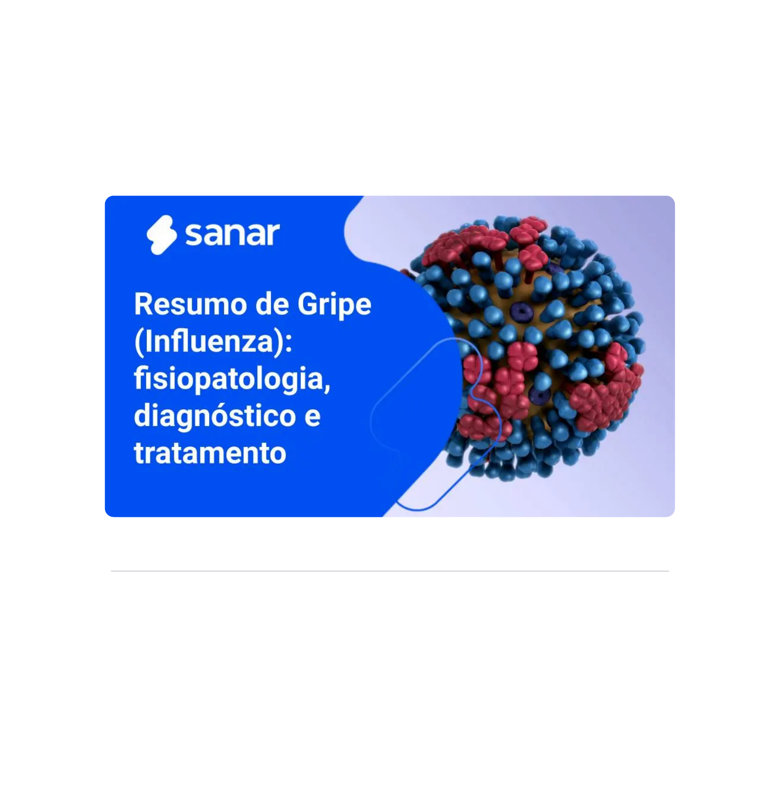 Home > Ciclos da Medicina > Ciclo Clínico > Resumo de Gripe (Influenza): epidemiologia, fisiopatologia, diagnóstico e tratamento Resumo de Gripe (Influenza): epidemiologia, fisiopatologia, diagnóstico e tratamento Índice 1. Epidemiologia da Gripe 2. Fisiopatologia da Influenza 3. Quadro clínico da gripe 4. Diagnóstico da gripe 5. Tratamento da gripe 5.1. Profilaxia: 5.2. Quimioprofilaxia: 5.3. Orientações gerais: 5.4. Posts relacionados: 5.5. Referências: A in�uenza, ou gripe, é uma infecção viral aguda que afeta o sistema respiratório. Trata-se de uma condição com elevada transmissibilidade e distribuição global, com tendência a se disseminar facilmente em epidemias sazonais, tendo potencial signi�cativo de causar pandemias. Segundo a Organização Mundial da Saúde (OMS), os casos de in�uenza podem variar de quadros leves a graves que podem ser fatais. Epidemiologia da Gripe As epidemias de gripe sazonal causam de 3 a 5 milhões de casos graves e de 300.000 a 500.000 mortes por ano no mundo, segundo dados da OMS. Somente os Estados Unidos respondem por 140.000 a 710.000 hospitalizações relacionadas à gripe e 12.000 a 56.000 mortes por ano, com maior impacto entre os jovens, idosos e pessoas com comorbidades. https://sanarmed.com/ https://sanarmed.com/category/ciclos-da-medicina/ https://sanarmed.com/category/ciclos-da-medicina/ciclo-clinico/ https://sanarmed.com/ As epidemias anuais da gripe podem afetar qualquer indivíduo, mas o vírus parece apresentar um tropismo maior por recém-nascidos e crianças menores de 2 anos, idosos maiores que 60 anos, portadores de comorbidades crônicas e indivíduos em imunossupressão, grupos que devido à fragilidade na resposta imune carregam maior risco de evoluir para as formas graves e apresentarem complicações clínicas. Além dos efeitos no sistema de saúde, a gripe sazonal apresenta um alto custo para a economia dos países onde ocorrem as epidemias e surtos, devido ao absentismo no trabalho, quando afeta a população economicamente ativa e ausência na escola, quando afeta crianças e estudantes. Fisiopatologia da Influenza A gripe é uma das infecções respiratórias agudas mais comuns na humanidade e uma das mais contagiosas por via aérea. É causada por diferentes vírus, dentre eles o A, B, C e D. Habitualmente em cada ano circula mais de um tipo de in�uenza concomitantemente (exemplo: in�uenza A (H1N1)pdm09, in�uenza A (H3N2) e in�uenza B). Os vírus in�uenza são vírus RNA da família Orthomyxoviridae, envelopados, altamente transmissíveis e mutáveis. Como dito, existem quatro tipos de vírus da in�uenza/gripe: Tipo A: são encontrados em várias espécies de animais, além dos seres humanos, como suínos, cavalos, mamíferos marinhos e aves. As aves migratórias desempenham importante papel na disseminação natural da doença entre distintos pontos do globo terrestre. Eles são ainda classi�cados em subtipos de acordo com as combinações de 2 proteínas diferentes, a Hemaglutinina (HA ou H) e a Neuraminidase (NA ou N). A função da H é facilitar a entrada do vírus na célula, enquanto da N é facilitar a sua saída após a replicação viral. Dentre os subtipos de vírus in�uenza A, atualmente os subtipos A(H1N1)pdm09 e A(H3N2) circulam de maneira sazonal e infectam humanos. Alguns vírus in�uenza A de origem animal também podem infectar humanos causando doença grave, como os vírus A(H5N1), A(H7N9), A(H10N8), A(H3N2v), A(H1N2v) e outros. Tipo B: infectam exclusivamente os seres humanos. Os vírus circulantes B podem ser divididos em 2 principais grupos (as linhagens), denominados linhagens B/ Yamagata e B/ Victoria. Os vírus da gripe B não são classi�cados em subtipos. Tipo C: infectam humanos e suínos. É detectado com muito menos frequência e geralmente causa infecções leves, apresentando implicações menos signi�cativas à saúde pública, não estando relacionado com epidemias. Tipo D: foi identi�cado pela primeira vez em 2011, isolado nos Estados Unidos da América (EUA) em suínos e bovinos e não são conhecidos por infectar e causar a doença em humanos. LEMBRE-SE: O vírus in�uenza A e B são responsáveis por epidemias sazonais, sendo o vírus in�uenza A responsável pelas grandes pandemias. De acordo com a virulência dos vírus circulante por ano, o número de hospitalizações e mortes aumenta substancialmente, não apenas por infecção primária, mas também pelas infecções secundárias, como as pneumonias adquiridas na comunidade de etiologia bacteriana. O período de incubação dos vírus in�uenza é geralmente de 2 dias, variando entre um e quatro. A transmissão ocorre principalmente de pessoa para pessoa, por meio de secreções respiratórias, isto é, as gotículas produzidas e expelidas através da tosse, espirros ou fala de uma pessoa infectada para uma pessoa suscetível. A transmissão por aerossol, (partículas muito pequenas que �cam em suspensão no ar) também pode ocorrer com o vírus in�uenza. A transmissão pode ainda ocorrer através do contato direto ou indireto com secreções respiratórias, ao tocar superfícies contaminadas com o vírus da gripe e, em seguida, tocar os olhos, o nariz ou a boca. Mostra-se muito elevada em ambiente domiciliar, creches, escolas e em ambientes fechados ou semifechados, dependendo não apenas da infectividade das formas virais circulantes, mas também do número e intensidade do contato entre as pessoas. Quadro clínico da gripe Os sinais e sintomas da doença são muito variáveis, podendo ocorrer desde a infecção assintomática, até formas graves. O quadro clínico da In�uenza, em geral, tem início com febre alta (atentar-se para os extremos de idade, no qual, nem sempre há febre), seguida de mialgia, odinofagia, cefaleia (frontal ou retro-orbitária), coriza (rinorreia hialina) e tosse. A febre é o sintoma mais importante e dura em torno de três dias, mas quando ausent