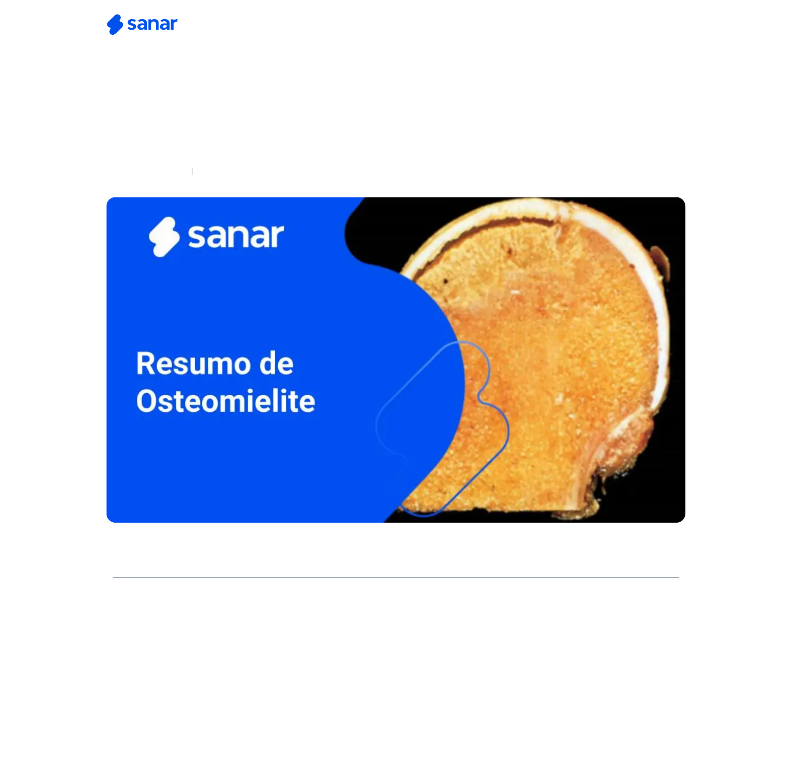Home > Ciclos da Medicina > Ciclo Clínico > Resumo de osteomielite: epidemiologia, fisiopatologia, diagnóstico e tratamento Resumo de osteomielite: epidemiologia, fisiopatologia, diagnóstico e tratamento Redação Sanar 04/05/2021 Índice 1. Epidemiologia da osteomielite 2. Fisiopatologia 3. Quadro clínico de osteomielite 4. Diagnóstico de osteomielite 5. Tratamento de osteomielite 5.1. Posts relacionados: 5.2. Referências: A osteomielite é um processo infeccioso do tecido ósseo, causado principalmente por bactérias, que compromete a porção cortical e esponjosa do osso, bem como o canal medular. A osteomielite pode ser classi�cada com base no mecanismo de infecção, em hematogênica ou não hematogênica, e na duração da doença, aguda ou crônica. A osteomielite aguda geralmente se apresenta com uma duração dos sintomas de alguns dias ou semanas. O sequestro ósseo, pedaços de osso necrótico que se separam do osso viável, estão ausentes. A osteomielite crônica é caracterizada por infecção de longa data ao longo de meses ou anos. O sequestro ósseo geralmente está presente. A osteomielite não hematogênica pode ocorrer como resultado da disseminação contígua da infecção para o osso de tecidos moles adjacentes e articulações ou via inoculação direta da infecção no osso (como resultado de trauma ou cirurgia). A osteomielite hematogênica é causada por microrganismos que semeiam o osso no contexto da bacteremia. https://sanarmed.com/ https://sanarmed.com/category/ciclos-da-medicina/ https://sanarmed.com/category/ciclos-da-medicina/ciclo-clinico/ https://sanarmed.com/author/sanar/ https://sanarmed.com/ Epidemiologia da osteomielite A osteomielite hematogênica ocorre mais comumente em crianças. 1 em cada 5000 crianças menores que 13 anos apresenta um quadro de osteomielite na vida, sendo este quadro mais comum em meninos. Essa complicação afeta com maior frequência os ossos longos, especialmente nos membros inferiores, sendo o fêmur mais afetado, seguido pela tíbia e úmero. Os fatores de risco para osteomielite hematogênica incluem endocardite, presença de dispositivos intravasculares permanentes. A osteomielite vertebral é a forma mais comum de osteomielite hematogênica em adultos. Em relação ao mecanismo, a osteomielite não hematogênica ocorre mais comumente no contexto de trauma e cirurgia relacionada, por isso é mais comum entre os adultos jovens. Os fatores de risco para osteomielite não hematogênica incluem feridas de tecidos moles de difícil cicatrização (incluindo úlceras de decúbito), presença de hardware ortopédico, diabetes, doença vascular periférica e neuropatia periférica. Fisiopatologia A bactéria que mais frequentemente provoca osteomielite é a S. aureus, seguida pelos estreptococos do grupo A, e nos pacientes com anemia falciforme a osteomielite é provocada principalmente por Salmonella. Nos pacientes imunodeprimidos, grande queimado e nos casos de trauma do osso calcâneo, o principal agente infeccioso é a Pseudomonas. As alterações morfológicas na osteomielite dependem do estágio (agudo, subagudo ou crônico) e localização da infecção. Ao atingir o osso, a bactéria se prolifera e induz uma in�amação aguda. A proliferação bacteriana promove um acúmulo de exsudatos e produtos bacterianos, contribuindo na formação do abscesso dentro do osso, e nesse estágio não é possível identi�car nenhuma lesão através de exames de imagem. Fonte: KUMAR, Vinay, et al. Robbins & Cotran: Bases patológicas das doenças. Rio de Janeiro: Elsevier, 2010 O quadro evolui com a necrose óssea maciça sem reabsorção óssea nas primeiras 48 horas do processo infeccioso. Com isso, o exsudato é drenado até a medula ou para dentro do córtex ósseo através dos sistemas haversianos, atingindo o periósteo. Sem drenagem cirúrgica do pus, ocorre o deslocamento do periósteo, que di�culta a chegada de suprimento sanguíneo, e assim são instaladas lesões supurativas e isquêmicas, gerando necrose óssea segmentar – a parte do osso morte é chamada de sequestro. O deslocamento do periósteo induz uma reação de neoformação óssea, que radiologicamente corresponde à periostite. A ruptura do periósteo, devido à pressão gerada pelos líquidos in�amatórios ali presentes provoca um abscesso e eventual formação de um seio de drenagem. Algumas vezes, o osso sequestrado se fragmenta e forma corpos estranhos livres, que passam através do trato do seio. Assim, em casos mais graves, a osteomielite pode provocar uma fístula na pele, que é a croni�cação dessa condição. O momento exato da transição da fase aguda para a fase crônica da osteomielite é determinado pela formação de osso necrosado por isquemia, o que na prática é difícil de se identi�car, sendo considerado por alguns autores 48 horas após a infecção inicial. Quadro clínico de osteomielite A dor, provocada pela hiperemia tecidual e aumento da pressão intraóssea, geralmente é a primeira queixa do paciente com osteomielite, que apresenta instalação aguda e aumento progressivo da intensidade com o passar das horas. A característica dessa dor é a resistência a analgésicos comuns, e com a evolução o paciente se torna irritadiço, perde o apetite e diminui as atividades habituais. O edema surge nos primeiros dias e se torna mais volumoso com o tempo. É importante se diferenciar o edema de articulações super�ciais de derrame articular. O edema e a in�amação de partes moles também provocam impotência funcional, que surge na logo na fase inicial e piora com a evolução. Quando há o envolvimento do membro inferior, a claudicação é o sinal mais frequente. O paciente com osteomielite apresenta frequentemente antecedente de infecção, febre de intensidade variável, sem correlação entre clínica e gravidade. Normalmente é acometido apenas 1 osso, e pode ocorrer em ossos chatos, especialmente os ossos 
