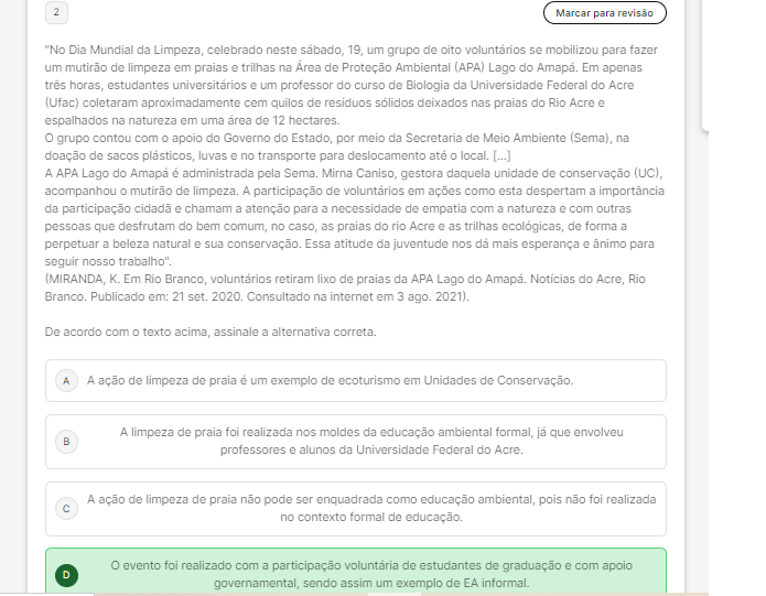 2 Marcar para revisão "No Dia Mundial da Limpeza, celebrado neste sábado, 19, um grupo de oito voluntários se mobilizou para fazer um mutirão de limpeza em praias e trilhas na Area de Proteção Ambiental (APA) Lago do Em apenas três horas, estudantes universitários e um professor do curso de Biologia da Universidade Federal do Acre (Ufac) coletaram aproximadamente cem quilos de sólidos deixados nas praias do Rio Acre e espalhados na natureza em uma área de 12 O grupo contou com apoio do Governo do Estado, por meio da Secretaria de Meio Ambiente (Sema), na doação de sacos luvas e no transporte para deslocamento até A APA Lago do é administrada pela Mirna Caniso, gestora daquela unidade de conservação (UC), acompanhou mutirão de limpeza. A participação de voluntários em ações como esta despertam a importância da participação cidadã e chamam a atenção para a necessidade de empatia com a natureza e com outras pessoas que desfrutam do bem comum, no caso, as praias do rio Acre e as trilhas ecológicas, de forma a perpetuar a beleza natural e sua conservação. Essa atitude da juventude nos dá mais esperança e ânimo para seguir nosso K. Em Rio voluntários retiram lixo de praias da APA Lago do do Acre, Rio Publicado em: 21 set. 2020. Consultado na internet em 3 ago. 2021). De acordo com texto acima, assinale a alternativa A A ação de limpeza de praia é um exemplo de ecoturismo em Unidades de Conservação. A limpeza de praia foi realizada nos moldes da educação ambiental já que envolveu professores e alunos da Universidade Federal do A ação de limpeza de praia não pode ser enquadrada como educação ambiental, pois não foi realizada C no contexto formal de educação. evento foi realizado com a participação voluntária de estudantes de graduação e com apoio D governamental, sendo assim um exemplo de EA