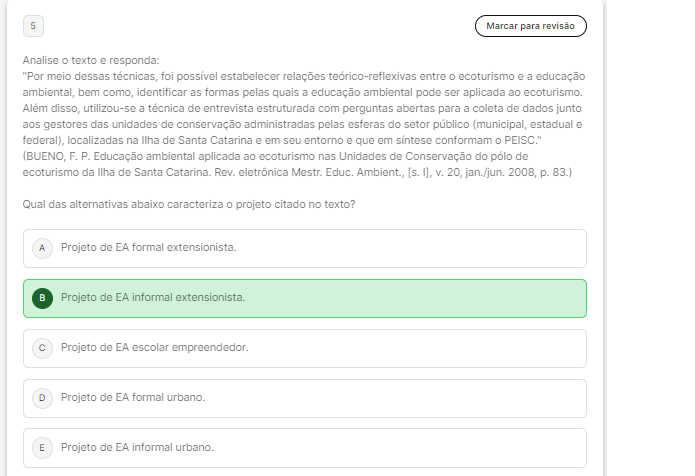 5 Marcar para revisão Analise texto e responda: "Por meio dessas foi possível estabelecer relações entre ecoturismo e a educação ambiental, bem como, identificar as formas pelas quais a educação ambiental pode ser aplicada ao Além disso, utilizou-se a técnica de entrevista estruturada com perguntas abertas para a coleta de dados junto aos gestores das unidades de conservação administradas pelas esferas do setor público (municipal, estadual e federal), localizadas na de Santa Catarina e em seu entorno e que em sintese conformam PEISC." (BUENO, F.P. Educação ambiental aplicada ao ecoturismo nas Unidades de Conservação do pólo de ecoturismo da Ilha de Santa Catarina Rev. eletrônica Mestr. Educ. (s. 20, jan./jun. 2008, p. 83.) Qual das alternativas abaixo caracteriza projeto citado no texto? A Projeto de EA formal B Projeto de EA informal extensionista. Projeto de EA escolar D Projeto de EA formal urbano. E Projeto de EA informal