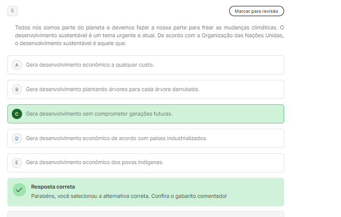 5 Marcar para revisão Todos nós somos parte do planeta e devemos fazer a nossa parte para frear as mudanças desenvolvimento sustentável é um tema urgente e atual. De acordo com a Organização das Nações Unidas, desenvolvimento sustentável é aquele que: A Gera desenvolvimento econômico a qualquer custo. B Gera desenvolvimento plantando para cada Gera desenvolvimento sem comprometer gerações futuras. D Gera desenvolvimento econômico de acordo com países industrializados. E Gera desenvolvimento econômico dos povos indigenas. Resposta correta você selecionou a alternativa correta. Confira gabarito comentado!