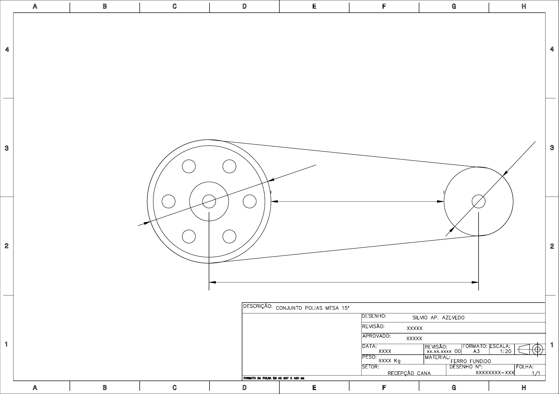 Usando; Polia redutor com diam.= 465 mm C/ 4 Canais Polia motor com diam.= 260 mm C/ 4 Canais Correia tipo 5v 1250 (comprimento 3175 mm) Temos um conjunto com as seguintes dimensões. 1013 650,5 Ø465 Ø26 0 AutoCAD SHX Text DESCRIÇÃO: AutoCAD SHX Text CONJUNTO POLIAS MESA 15º AutoCAD SHX Text DESENHO: AutoCAD SHX Text SILVIO AP. AZEVEDO AutoCAD SHX Text REVISÃO: AutoCAD SHX Text XXXXX AutoCAD SHX Text APROVADO: AutoCAD SHX Text XXXXX AutoCAD SHX Text DATA: AutoCAD SHX Text PESO: AutoCAD SHX Text XXXX AutoCAD SHX Text XXXX Kg AutoCAD SHX Text REVISÃO: AutoCAD SHX Text xx.xx.xxxx 00 AutoCAD SHX Text FORMATO: AutoCAD SHX Text A3 AutoCAD SHX Text ESCALA: AutoCAD SHX Text 1:20 AutoCAD SHX Text MATERIAL: AutoCAD SHX Text FERRO FUNDIDO AutoCAD SHX Text DESENHO Nº: AutoCAD SHX Text XXXXXXXX-XXX AutoCAD SHX Text FOLHA: AutoCAD SHX Text 1/1 AutoCAD SHX Text SETOR: AutoCAD SHX Text RECEPÇÃO CANA Folhas e vistas Modelo