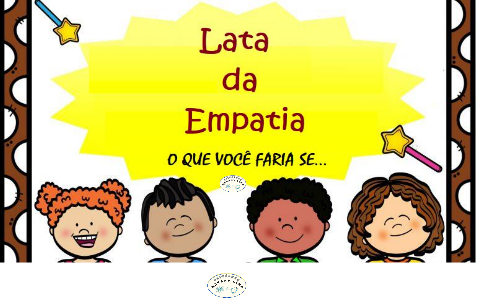 Rotulo da Lata: RECURSO LÚDICO PARA PROMOVER O RESPEITO E A EMPATIA Educação Sócioemocional Este recurso tem como objetivo de acordo a BNCC: BEBÉS: • Perceber que suas ações têm efeitos nas outras crianças e nos adultos. CRIANÇAS BEM PEQUENAS: • Demonstrar atitudes de cuidado e solidariedade na interação com crianças e adultos. • Comunicar-se com os colegas e os adultos, buscando compreendê-los e fazendo-se compreender. • Resolver conflitos nas interações e brincadeiras, com orientação de um adulto CRIANÇAS PEQUENAS: • Demonstrar empatia pelos outros, percebendo que as pessoas têm diferentes sentimentos, necessidades e maneiras de pensar e agir. • Ampliar as interações interpessoais, desenvolvendo as atitudes de participação e cooperação. • Comunicar suas ideias e sentimentos a pessoas e grupos diversos. • Usar estratégias pautadas no respeito mútuo para lidar com conflitos nas interações com crianças e adultos. Então vamos promover a conexão a reflexão e o desenvolvimento da empatia na sala de aula e nas situações do cotidiano. O Afetivo e o Cognitivo é fundamental para esse processo de aprendizagem e desenvolvimento harmonioso na turma. ATIVIDADE PODERÁ SER DESENVOLVIDA COM CRIANÇAS DO 1º AO 5º ANO DO ENSINO FUNDAMENTAL (A PARTIR DE 04 ANOS). Explicação para as crianças: O QUE É EMPATIA? Empatia é a capacidade de se colocar no lugar de outra pessoa, tentar compreender as emoções e sentimentos que o outro está sentindo. Ou sugestão do vídeo animado da que é empatia no Canal do Youtube> https://www.youtube.com/watch?v=_ssvtnB85IM Como desenvolver a atividade para as crianças: • Imprimir e Recortar as imagens (se preferir poderá ser plastificada para maior durabilidade) • Imprimir e Recortar o rotulo para colocar na Lata (Ex: lata de Leite ninho) CANTAR a MÚSICA: A lata da Empatia vai passar de mão em mão, o que você faria nessa situação... (passar a lata de mão em mão ou um ursinho para representar a Dona Empatia) Onde a música parar a criança deverá retirar uma imagem e falar o que ela faria naquela situação. https://www.youtube.com/watch?v=_ssvtnB85IM ESSAS IMAGENS DEVEM SER USADAS PARA FINALIZAR A DINÂMICA DA EMPATIA: Olhar nos olhos da criança, fortalece sua confiança, enquanto pessoa e pedir sua opinião, a faz sentir parte de um coletivo, mesmo havendo discordâncias. Limites sobre atos aceitáveis ou não aceitáveis num ambiente, numa tarefa, devem ser esclarecidos, explicados e também exigidos para que a vontade de um, não sobreponha os demais. Da mesma forma, como elogios e recompensas devem ser valorizados e boas ações encorajadas.