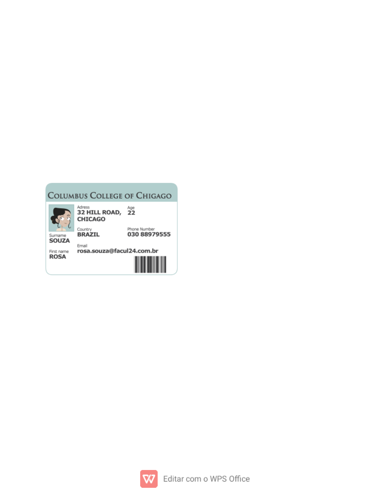 1.13 Teste seus conhecimentos: student card Informação Marcar questão Texto informativo The student ID card is an essential document. It’s important that you always keep it with you. Read Rosa’s student ID card and say if the sequences are true or false according to the information on the card. (A carteira estudantil é um documento essencial. É importante que você sempre a tenha. Leia o cartão estudantil de Rosa e diga se as frases são verdadeiras ou falsas de acordo com a informação contida na carteirinha.) Carteira de estudante da Rosa Souza com as seguintes informações: adress: 32 Hill Road, Chicago, Age: 22, country: Brazil, phone number: 030 88979555, email: rosa.souza@facul24.com.br Questão 1 Texto da questão Her surname is Souza. Questão 1 Escolha uma opção: Verdadeiro Falso Feedback A resposta correta é 'Verdadeiro'. Questão 2 Texto da questão Her name is Souza. Escolha uma opção: Verdadeiro Falso Feedback A resposta correta é 'Falso'. Questão 3 Texto da questão She is American. Escolha uma opção: Verdadeiro Falso Feedback A resposta correta é 'Falso'. Questão 4 Texto da questão She is twenty-two years old. Escolha uma opção: Verdadeiro Falso Feedback A resposta correta é 'Verdadeiro'. Questão 5 Texto da questão She isn't from Brazil. Escolha uma opção: Verdadeiro Falso Feedback A resposta correta é 'Falso'. Questão 6 Texto da questão Her home address is rosa.souza@facul.com.br Escolha uma opção: Verdadeiro Falso Feedback A resposta correta é 'Falso'.