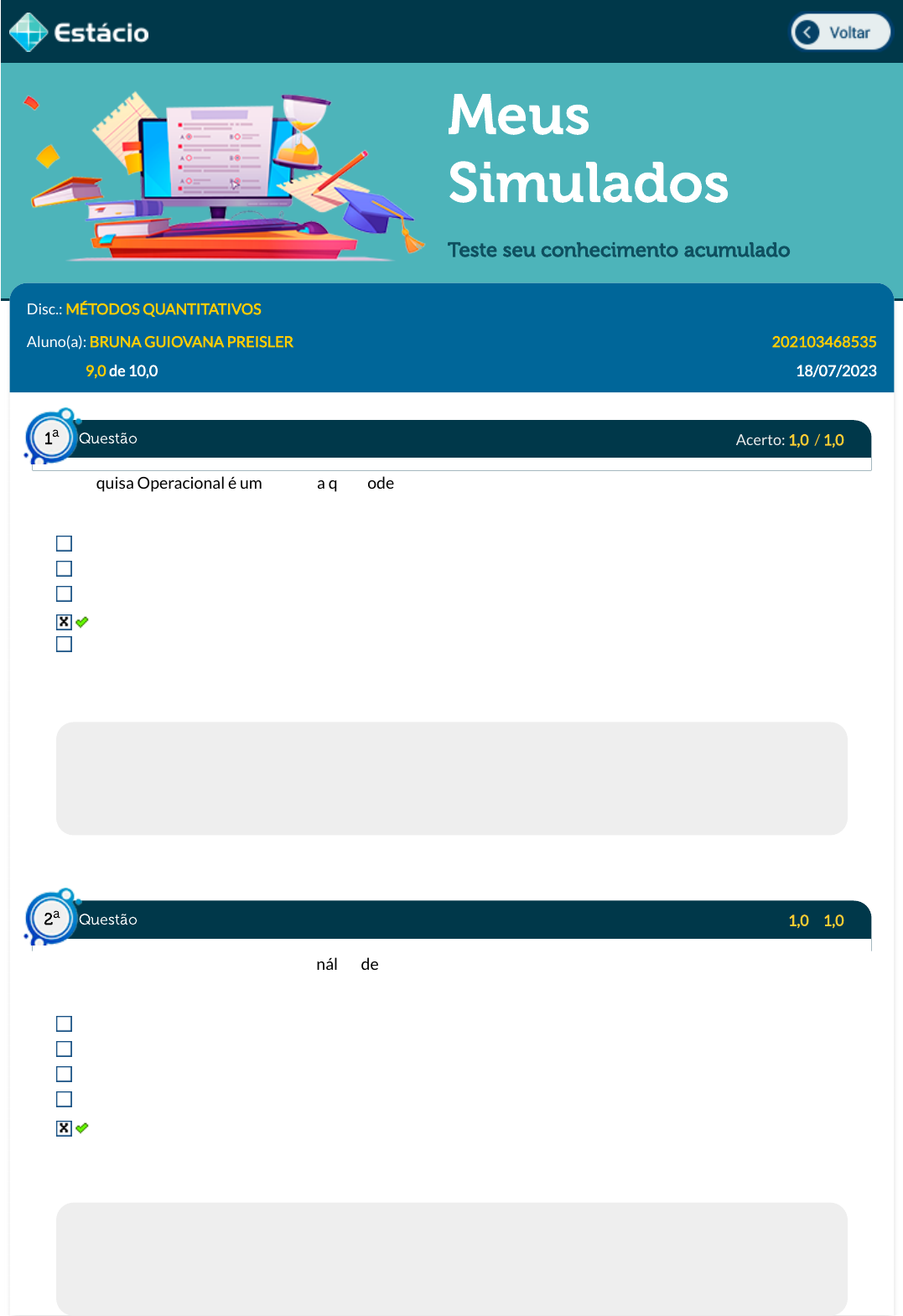 27/07/2023, 19:45 Estácio: Alunos https://simulado.estacio.br/bdq_simulados_avaliacao_parcial_resultado.asp?cod_hist_prova=313901169&cod_prova=6559863854&f_cod_disc= 1/8 Meus Simulados Teste seu conhecimento acumulado Disc.: MÉTODOS QUANTITATIVOS Aluno(a): BRUNA GUIOVANA PREISLER 202103468535 Acertos: 9,0 de 10,0 18/07/2023 Acerto: 1,0 / 1,0 A Pesquisa Operacional é uma técnica que pode ser utilizada em conjunto com outras técnicas de gestão. A Pesquisa Operacional é uma abordagem que pode ser utilizada para resolver quais tipos de problemas? Problemas simples e rotineiros. Problemas sociais. Problemas relacionados ao marketing e vendas. Problemas complexos e não-rotineiros. Problemas operacionais e técnicos. Respondido em 18/07/2023 21:46:09 Explicação: A Pesquisa Operacional é uma abordagem que se aplica em situações onde há a necessidade de resolver problemas complexos e não-rotineiros, envolvendo a otimização de processos e recursos, a tomada de decisão em situações de incerteza e a análise de cenários futuros. Acerto: 1,0 / 1,0 Foi desenvolvido um modelo para a análise de um problema complexo. Sabe-se que todas as variáveis de decisão desse modelo estão livres para assumir valores fracionais. Desse modo, pode-se a�rmar que esse modelo é: Não linear Determinístico Estocástico Dinâmico Não inteiro Respondido em 18/07/2023 21:46:41 Explicação: Um modelo é considerado não-inteiro quando as variáveis de decisão podem assumir valores fracionários. Isso signi�ca que a solução ótima pode não ser necessariamente um número inteiro, mas pode ser uma fração. Isso difere de um modelo inteiro, onde as variáveis de decisão devem ser números inteiros. Questão1 a Questão2 a https://simulado.estacio.br/alunos/inicio.asp javascript:voltar(); 27/07/2023, 19:45 Estácio: Alunos https://simulado.estacio.br/bdq_simulados_avaliacao_parcial_resultado.asp?cod_hist_prova=313901169&cod_prova=6559863854&f_cod_disc= 2/8 Acerto: 1,0 / 1,0 O desenvolvimento de um modelo matemático para estudos em pesquisa operacional pode ser dividido em diferentes etapas. Uma dessas etapas versa sobre a identi�cação das variáveis de decisão, sua função objetivo e suas restrições. Qual etapa seria essa? Veri�cação do modelo matemático e uso para predição Formulação do problema Formulação do modelo matemático Seleção da melhor alternativa Observação do sistema Respondido em 18/07/2023 21:47:30 Explicação: Winston (2004) propõe um procedimento composto por sete passos para o desenvolvimento de modelos matemáticos em estudos de pesquisa operacional. A descrição do enunciado faz referência a formulação do modelo matemático. Acerto: 1,0 / 1,0 Existem classes de modelos de programação linear que são adaptáveis a uma série de situações práticas, sendo considerados como ''problemas típicos''. O problema em que o tomador de decisão deseja determinar níveis de utilização de matérias-primas na composição de uma ração alimentar, respeitando certas características nutricionais e estando limitado à disponibilidade de matérias-primas e insumos, bem como ao atendimento da demanda, é um exemplo do seguinte problema típico de programação linear: Problema da designação. Problema do planejamento de produção. Problema de transbordo. Problema de transporte. Problema da mistura. Respondido em 18/07/2023 21:48:21 Explicação: A resposta certa é: Problema da mistura. Muitos modelos de programação linear representam situações em que o tomador de decisão deseja minimizar o custo para atender a determinadas condições (restrições). O problema da mistura, também conhecido como o problema da dieta, é um dos modelos clássicos que se encaixa neste tipo de padrão. O problema da dieta foi proposto pela primeira vez por Stiger (1945), tendo sido um dos primeiros problemas de otimização linear a ser implementado na prática com sucesso. Neste tipo de problema, o tomador de decisão deseja determinar níveis de utilização de matérias-primas na composição de uma ração alimentar, que deve respeitar certas características nutricionais, estando limitado à disponibilidade de matérias-primas e insumos, bem como ao atendimento da demanda. É importante destacar que este tipo de problema não se limita à dieta humana, sendo aplicado também à elaboração de rações para gado, peixe, aves etc. Entretanto, de forma mais ampla, o problema da mistura não se restringe apenas à composição de rações alimentares. O problema da mistura pode ser aplicado à produção de ligas metálicas, à especi�cação de combustíveis, à fabricação de remédios ou de produtos químicos em geral, à produção de adubos ou de papel. Em suma, o problema da mistura representa uma classe de modelos clássicos, que podem ser aplicados a diferentes setores. Neste tipo de problema, diferentes insumos devem ser misturados em uma proporção ideal para fabricar produtos para a comercialização. Questão3 a Questão4 a 27/07/2023, 19:45 Estácio: Alunos https://simulado.estacio.br/bdq_simulados_avaliacao_parcial_resultado.asp?cod_hist_prova=313901169&cod_prova=6559863854&f_cod_disc= 3/8 Acerto: 1,0 / 1,0 A programação linear é uma técnica matemática usada para otimizar recursos limitados e tomar decisões e�cientes em situações em que existem restrições. Os modelos de programação linear são amplamente aplicados em diversas áreas, como logística, produção, �nanças e transporte. Com relação a esse tema, analise as seguintes asserções: I. A de�nição correta das variáveis de decisão é o passo mais importante no desenvolvimento de modelos de programação linear. PORQUE II. Um equívoco na seleção das variáveis de decisão resulta em erros na identi�cação da função objetivo e do conjunto de restrições. Analisando as asserções realizadas acima, assinale a opção que representa a correta razão entre elas. 