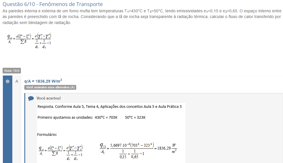 Questão 6/10 - Fenômenos de Transporte As paredes interna e externa de um forno mufla tem temperaturas T1=430°C e tendo emissividades e espaço interno entre as paredes é preenchido com de rocha. Considerando que a de rocha seja transparente à radiação calcular fluxo de calor transferido por radiação sem blindagem de radiação. = A q/A = 1836,29 Você assinalou essa alternativa (A) Você acertou! Resposta. Conforme Aula 5, Tema 4, Aplicações dos conceitos Aula 5 e Aula Prática 5 Primeiro ajustamos as unidades: 430°C = 703K 50°C = 323K Formulário: =