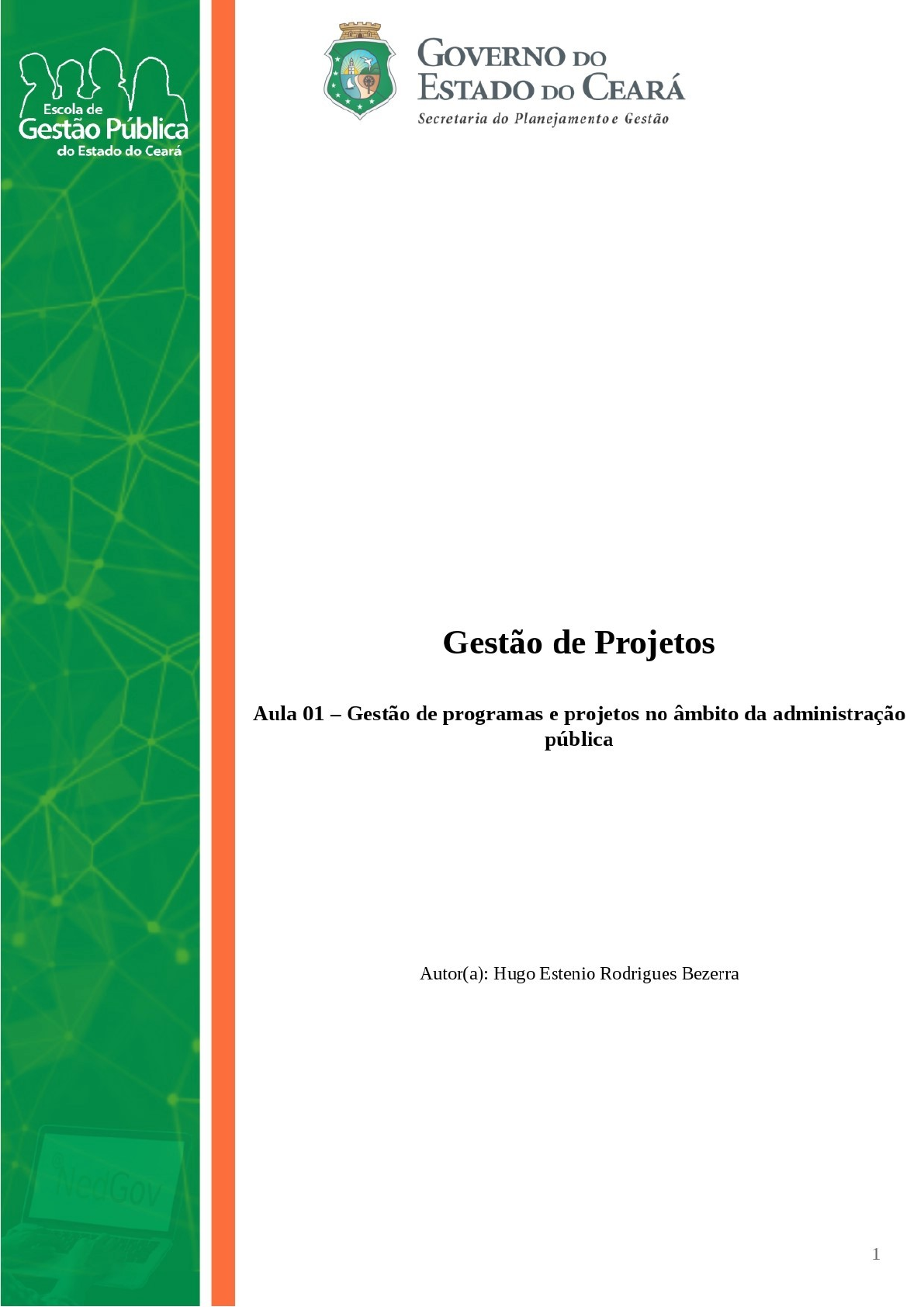 1 Sumário Apresentação.......................................................................................................................................3 Objetivo...............................................................................................................................................3 Tópico 01 – Administração Estratégica...........................................................................................4 01.1 - Administração Estratégica..................................................................................................4 01.2 - O planejamento estratégico................................................................................................7 01.3 - Missão e visão.......................................................................................................................8 01.4 - Projetos como viabilizadores de mudanças nas organizações.........................................9 Tópico 02 – Conceitos e Ciclo de Vida do Projeto........................................................................13 02.1 - Conceito de Projeto...........................................................................................................13 02.1.1 - Diferença entre Projeto e Programas..........................................................................19 02.1.2 - Os Ciclos de um Projeto.............................................................................................22 02.1.3 - Um pouco de história..................................................................................................27 02.1.4 - Ciclo de Vida de Projeto.............................................................................................29 02.1.5 - Origem de projetos.....................................................................................................33 Tópico 03 – Elaboração de Projeto.................................................................................................35 03.1 - Plano do Projeto................................................................................................................35 03.1.1 - Escopo........................................................................................................................36 03.1.2 - Plano de Ação.............................................................................................................36 03.1.3 - Plano de Monitoramento e Avaliação.........................................................................37 03.2 - Definição das atividades e da Estrutura Analítica do Projeto – EAP...........................38 03.3 - Definição das precedências das atividades......................................................................40 03.4 - Cronograma e diagrama de dependências......................................................................41 Tópico 04 – A Importância da Gestão de Projetos na Administração Pública...........................45 04.1 - Gestão de Projetos no Setor Público................................................................................45 04.1.1 - Os Projetos e o Planejamento Estratégico...................................................................47 04.1.2 - Projetos Públicos.........................................................................................................50 Referências........................................................................................................................................58 2 Módulo 01 – Gestão de programas e projetos no âmbito da administração pública Apresentação Prezado (a) cursista, Nesta aula, a ideia é entendermos que o planejamento estratégico de uma organização e, em especial, no serviço público é melhor efetivado por intermédio do gerenciamento de projetos. Para tanto, serão apresentadas noções de planejamento estratégico e de gerenciamento de projetos. Objetivo Apresentar noções básicas de planejamento estratégico e de gerenciamento de projetos, de modo a instrumentalizar os participantes para o reconhecimento da importância desses aspectos, tendo em vista as mudanças nas organizações. 3 Módulo 01 – Gestão de programas e projetos no âmbito da administração pública Curso: Gestão de Projetos Autoria: Hugo Estenio Rodrigues Bezerra Módulo: 01 Tópico 01 – Administração Estratégica Objetivos: ➔ Apresentar a noção básica de planejamento estratégico e sua importância para as organizações; ➔ Identificar que a materialização do planejamento estratégico ocorre de maneira mais efetiva por meio da implementação de projetos; ➔ Reconhecer que os projetos são os viabilizadores das mudanças nas organizações. É importante entendermos, tanto no âmbito público quanto no privado, a relação que existe entre a gestão estratégica de uma empresa e a elaboração de projetos para alcançar os objetivos definidos. 01.1 - Administração Estratégica Podemos admitir que toda instituição, ao se organizar como empresa, trabalha com planejamento, elabora objetivos e estabelece metas a alcançar. O planejamento estratégico corresponde a uma técnica utilizada há bastante tempo por organizações privadas e governamentais, com amplitude e alcance, que dependerá da área de intervenção estabelecida interna ou institucionalmente. 4 Módulo 01 – Gestão de programas e projetos no âmbito da administração pública Podemos considerar que se trata de uma técnica corporativa que busca promover a análise ambiental de uma empresa, a fim de identificar suas oportunidades e ameaças, pontos fortes e fracos, saindo de uma situação presente, identificada pela missão, com o objetivo de alcançar um estado desejado, estabelecido pela visão. As atividades desenvolvidas para realizar essa transição envolvem, normalmente: a identificação de necessidades; o desenvolvimento de um plano de ação; o controle de mudanças; a garantia da