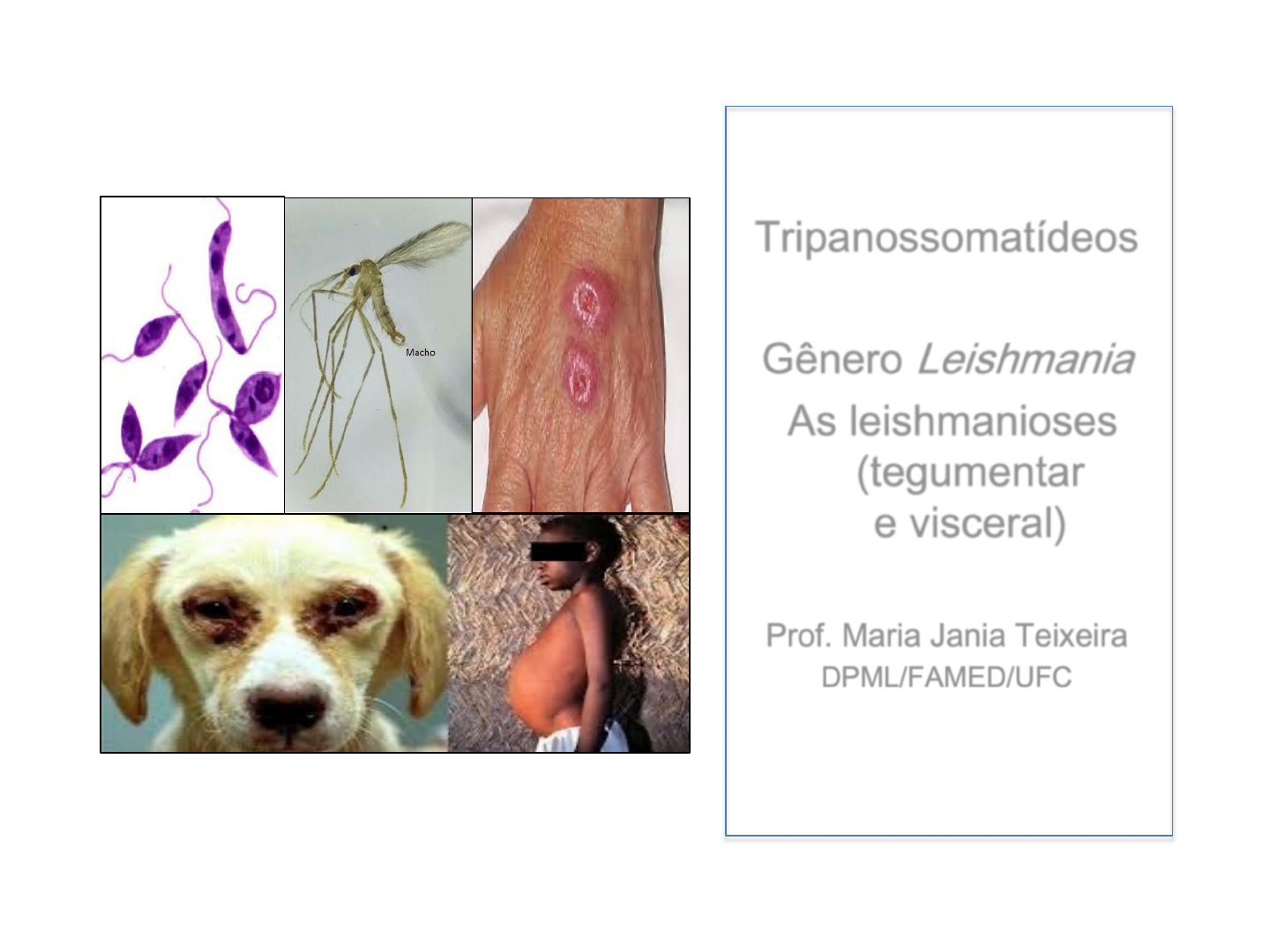 Tripanossomatídeos Gênero Leishmania As leishmanioses (tegumentar e visceral) Prof. Maria Jania Teixeira DPML/FAMED/UFC Os tripanossomatídeos Monoxenos / Heteroxenos Crithidia Phytomonas Leptomonas Endotrypanum Herpetomonas Leishmania* Blastocrithidia Sauroleishmania Rhynchoidomonas Trypanosoma* *contêm espécies patogênicas para o homem G ên er os Distribuição global das leishmanioses Akhoundi M. et al., Mol. Aspects of Med., 2017 Espalhadas globalmente em mais de 102 países: em grande áreas dos trópicos, subtrópicos e bacia do mediterrâneo OMS = 350 milhões de pessoas vivem sob risco: com grande impacto global! São conhecidas 53 espécies de Leishmania 20 são patogênicas para o homem Brasil = co-ocorrência de 8 espécies Ciclo de transmissão das leishmanioses ØA leishmaniose tegumentar tem ciclo silvestre, interior ou proximidades com a mata. ØA leishmaniose visceral, que tinha focos clássicos de transmissão em ambientes rurais, está agora também com ciclo urbano, tendo o cachorro como um importante reservatório. Novos fatores complicantes • Expansão e Urbanização (LV): – Endemia rural (até década de 60) – Anos 80: expansão para centros urbanos – Teresina (1981), Natal, Fortaleza, Campo Grande, Porto Alegre, etc. • Coinfecção: Leishmania/HIV - Aumenta susceptibilidade 2016: 10% de co-infectados no Brasil • Resistência ao tratamento com antimonial (LT/LV) - Tratamento de 1a. escolha Agente etiológico das leishmanioses Leishmania Protozoário intracelular obrigatório • Supergrupo: Excavata • Grupo: Euglenozoa (presença de flagelo) • Subgrupo: Kinetoplastea (presença do cinetoplasto) • Gênero: Leishmania Cinetoplasto: parte diferenciada da mitocôndria, provida de DNA conservado (kDNA). * Classificação – baseada na ultra-estrutura, genética e biologia molecular (Adl et al., 2005) Amastigotas de Leishmania spp. dentro do vacúolo parasitóforo de macrófago (célula hospedeira) Formas evolutivas de Leishmania spp. A. Amastigota – intracelular (hospedeiro vertebrado) B. Promastigota – extracelular (hospedeiro invertebrado e meio de cultura) A B Flagelo Flagelo Cinetoplasto Núcleo Aspectos morfológicos - Promastigota F N K Rey, Parasitologia, 2008 Mede de 15 a 20 µm Forma alongada (fusiforme) Núcleo grande e central (N) Cinetoplasto (K) próximo à extremidade anterior e a base do flagelo Flagelo exteriorizado - região anterior (F) núcleo cinetoplasto flagelo Habitam o aparelho digestivo dos insetos vetores (HI) Promastigotas Foto: M.J. Teixeira Aspectos morfológicos - Amastigota v Mede 2 a 5 µm v Formas arredondadas/ovaladas v Sem flagelo externo (F) v Núcleo volumoso e excêntrico (N) v Cinetoplasto bem visível (K) F K N Rey, Parasitologia, 2008 Amastigotas núcleo cinetoplasto Foto: M.J. Teixeira Intracelulares, habitam células do SFM dos HV Macrófago Leishmanias e tropismo Principal tropismo Viscerotrópica Dermotrópica Dermotrópica Mucotrópica Américas Subgênero *Li e Lc são geneticamente idênticas Velho Mundo = sinônimo de L. chagasi na América do Sul Vetores - flebotomíneos - Insetos dípteros, pequenos, gostam de ambientes sombreados, com temperatura entre 20 e 30oC Ordem: Diptera Família: Psychodidae Subfamília: Phlebotominae Gêneros: Plebotomus (VM) Lutzomyia (Américas) Leishmaniose tegumentar: Lutzomyia intermedia, Lu. whitmani, Lu. wellcomei, Lu. migonei Leishmaniose visceral: Lu. longipalpis e Lu. cruzi (Mato grosso) Pernas: longas e finas ♀≠♂ Pilosidade Antenas: 14 flagelômeros cilíndricos Palpos Maxilares (artículos) Cibário Abdome Comprimento: 2 a 4 mm Reservatórios Reservatórios: mamíferos § Leishmaniose tegumentar – Brasil: roedores, edentados (tatu, tamanduá), marsupiais (gambá), e outros (depende espécie causadora) § Leishmaniose visceral - Brasil: canídeos (cão, raposa) Bolomys spp. Rattus rattus Mecanismos de transmissão • Vetorial: através da picada de fêmeas de flebotomíneos. Ø Inoculam promastigotas metacíclicas durante o repasto sanguíneo • Formas raras de transmissão: - Transfusão de sangue - Transplante de órgãos - Uso intravenoso de drogas (HIV/AIDS) - Acidente com seringas e agulhas contaminadas (sangue M.O., aspirados etc.) Fêmea de flebotomíneo fazendo repasto sanguíneo (ingurgitada) nFagolisossomo nAmastigota intracelular nRuptura nRe-invasão nAmastigotas nPromastigotas procíclicas nPromastigotas metacíclicas nProliferação no intestino do vetor nPicada do inseto nInteração nCaptação nProlliferação nPicada do inseto Fonte: CHAPPUIS, 2007 Ciclo biológico (heteroxênico) Flebotomíneo Hospedeiro invertebrado Hospedeiro mamífero Diversidade de Formas Clínicas (multifatorial) Fatores Ambientais Fatores do Hospedeiro Fatores do Parasito Homem - doença Aspectos clínico-patológicos manifestações clínicas • Formas tegumentares: Espectro clínico Cutânea (LCL) Cutânea Difusa (LCD) Mucocutânea (LCM) Cutânea Disseminada (LD) • Forma visceral: Leishmaniose Visceral (Calazar) - LV Leishmaniose tegumentar americana • Cutânea localizada (LCL) Várias espécies de Leishmania envolvidas Infecção localizada no local da picada do flebotomíneo Úlcera típica: “aspecto de cratera lunar”, indolor, com bordas elevadas, fundo necrosado, com/sem exsudação Parasitos abundantes no início da infecção e escassos nas úlceras crônicas. Pode ser autolimitada Neves, Parasitol. Humana, 12ª ed., 2012 Leishmaniose tegumentar americana • Mucocutânea (LMC) (0-10% dos casos cutâneos) Espécie envolvida: Leishmania braziliensis Lesão secundária que atinge as mucosas do nariz, boca e faringe Pode surgir na vigência da lesão primária ou tempos depois da sua “cura” Inflamação exacerbada (ausência de parasitos) Complicações respiratórias por infecções secundárias. Leishmaniose tegumentar americana • Cutânea Difusa (LCD) Espécie envolvida: L. amazonensis (40%) Caracteriza-se por anergia do organismo 