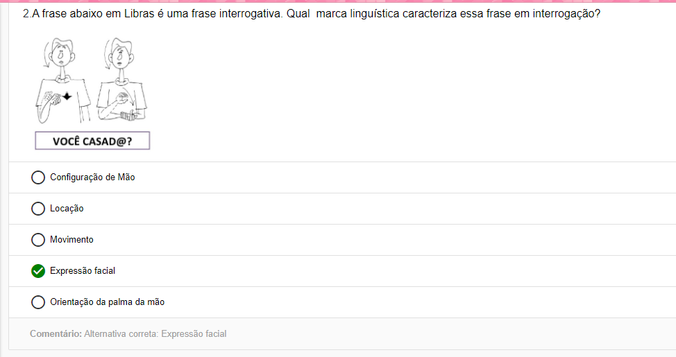 2.A frase abaixo em Libras é uma frase interrogativa. Qual marca linguística caracteriza essa frase em interrogação? CASAD@? Configuração de Mão Locação Movimento Expressão facial Orientação da palma da mão Comentário: Alternativa Expressão facial