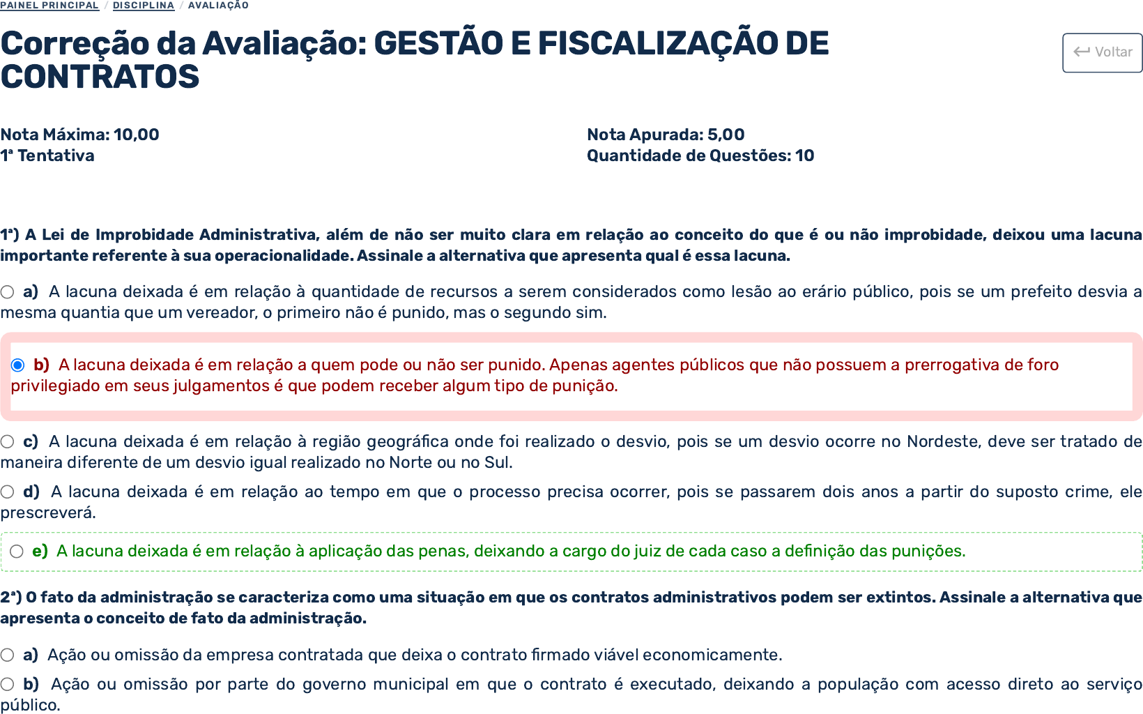 1ª) A Lei de Improbidade Administrativa, além de não ser muito clara em relação ao conceito do que é ou não improbidade, deixou uma lacuna importante referente à sua operacionalidade. Assinale a alternativa que apresenta qual é essa lacuna. a) A lacuna deixada é em relação à quantidade de recursos a serem considerados como lesão ao erário público, pois se um prefeito desvia a mesma quantia que um vereador, o primeiro não é punido, mas o segundo sim. b) A lacuna deixada é em relação a quem pode ou não ser punido. Apenas agentes públicos que não possuem a prerrogativa de foro privilegiado em seus julgamentos é que podem receber algum tipo de punição. c) A lacuna deixada é em relação à região geográ�ca onde foi realizado o desvio, pois se um desvio ocorre no Nordeste, deve ser tratado de maneira diferente de um desvio igual realizado no Norte ou no Sul. d) A lacuna deixada é em relação ao tempo em que o processo precisa ocorrer, pois se passarem dois anos a partir do suposto crime, ele prescreverá. e) A lacuna deixada é em relação à aplicação das penas, deixando a cargo do juiz de cada caso a de�nição das punições. 2ª) O fato da administração se caracteriza como uma situação em que os contratos administrativos podem ser extintos. Assinale a alternativa que apresenta o conceito de fato da administração. a) Ação ou omissão da empresa contratada que deixa o contrato �rmado viável economicamente. b) Ação ou omissão por parte do governo municipal em que o contrato é executado, deixando a população com acesso direto ao serviço público. PAINEL PRINCIPAL / DISCIPLINA / AVALIAÇÃO Correção da Avaliação: GESTÃO E FISCALIZAÇÃO DE CONTRATOS Voltar Nota Máxima: 10,00 Nota Apurada: 5,00 1ª Tentativa Quantidade de Questões: 10 https://www.portaleducacionalead.com.br/portal-aluno/painel-principal https://www.portaleducacionalead.com.br/portal-aluno/sala-aula-disciplina.php?disciplina=10777&turma=804&curso=1734 https://www.portaleducacionalead.com.br/portal-aluno/sala-aula-disciplina.php?disciplina=10777&turma=804&curso=1734 c) Ação ou omissão da Administração pública que deixa o contrato �rmado com um terceiro menos oneroso para os cofres públicos. d) Ação ou omissão da Administração Pública que inviabiliza o contrato �rmado entre as partes. e) Ação ou omissão da empresa contratada que inviabiliza 3ª) De maneira geral, a nova Lei das Licitações não permite que sejam feitos pagamentos a fornecedores com base em horas de trabalho ou em postos de serviço. No entanto, o referido marco legal de�niu algumas exceções a essa regra. Assinale a alternativa correta que apresenta uma exceção aplicável. a) Uma exceção é o fornecimento de bens considerados de luxo. b) Uma exceção é o fornecimento de serviços vinculados ao desempenho ou a metas previamente estabelecidas. c) Uma exceção é o fornecimento de serviços de limpeza predial, desde que tal limpeza seja realizada em hospitais públicos. d) Uma exceção é o fornecimento de bens duráveis, tais como pontes ou viadutos, desde que o contrato tenha vigência mínima de um ano. e) Uma exceção é o fornecimento de equipamentos de proteção individual para o tratamento de pandemias. 4ª) O Ministério Público pode atuar junto à polícia, exercendo certo tipo de trabalho investigatório. No entanto, a sua atividade não é livre, tendo algumas limitações legais. Como podem ser exempli�cadas tais limitações? Escolha a alternativa correta. a) O Ministério Público não pode exercer a atividade de corregedoria de polícia. b) O Ministério Público não pode exercer a atividade de controle externo. c) O Ministério Público não pode instaurar inquérito civil. d) O Ministério Público não pode atuar na defesa dos direitos da sociedade. e) O Ministério Público não pode assegurar que a população tenha garantias constitucionais. 5ª) Dentre os diversos tipos de contrato existentes, aqueles caracterizados pela presença de um ente público são recorrentes, além de necessitarem seguir uma quantidade maior de regramentos. Assinale a alternativa que apresenta o nome do contrato em que, no mínimo, uma das partes é a Administração Pública. a) Contrato de serviço público. b) Contrato da população. c) Contrato de mútuo público. d) Contrato de empréstimo com bancos públicos. e) Contrato de administração. 6ª) Em termos conceituais, um contrato é uma celebração formal entre duas partes, ambas se comprometendo a entregar à outra algo que não é necessariamente dinheiro. Dentro da estrutura administrativa pública, toda vez que um contrato é celebrado com um terceiro, gerando obrigações recíprocas, possui uma nomenclatura especí�ca. Assinale a alternativa que apresenta essa nomenclatura. a) Contrato de governo ou contrato governamental. b) Contrato oneroso ou contrato de pagamentos. c) Contrato administrativo ou contrato de administração. d) Contrato público ou contrato da sociedade. e) Contrato social ou contrato da sociedade. 7ª) As cooperações existentes entre o Estado e a sociedade não são recentes. Elas buscam trazer para o acesso público serviços de qualidade, mas com transferência de responsabilidade do Estado para uma organização da sociedade civil. De quando é datada a primeira regulamentação acerca das parcerias entre Estado e sociedade civil? Assinale a alternativa correta. a) Desde o �m da década de 1970. b) Desde o início da década de 1990. c) Desde o início dos anos 2000. d) Desde o �m dos anos 1980. e) Desde o início da década de 1980. 8ª) Embora não seja uma das atividades mais difundidas junto à sociedade do Ministério Público, ele também busca a defesa de valores ambientais no país. Há, assim, um objetivo muito claro em relação à população brasileira. Escolha a alternativa que apresenta, de maneira apropriada, o objetivo do Ministério Público referente aos va