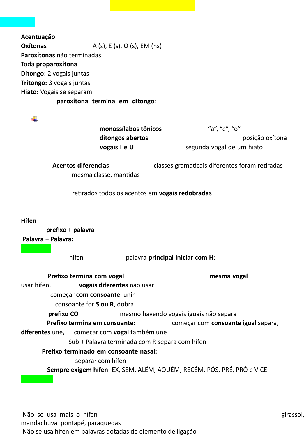 RESUMO PORTUGUÊS Ortografia 1. Acentuação ➔ Oxítonas terminadas em A (s), E (s), O (s), EM (ns) ➔ Paroxítonas não terminadas em A (s), E (s), O (s), EM (ns) ➔ Toda proparoxítona é acentuada ➔ Ditongo: 2 vogais juntas na separação silábica ➔ Tritongo: 3 vogais juntas ➔ Hiato: Vogais se separam na divisão silábica ➔ Acentua-se paroxítona termina em ditongo: Paroxítonas terminadas em ditongo podem ser eventuais proparoxítonas (Separar as vogais do ditongo) REGRAS ESPECIAIS: 1. Acentuam-se os monossílabos tônicos terminados em “a”, “e”, “o” 2. Acentuam-se os ditongos abertos EU, EI, OI, quando estiverem em posição oxítona 3. Acentuam-se as vogais I e U, quando forem a segunda vogal de um hiato; Exceção: Não acentua se for seguido de M, N, NH, R ou Z 4. Acentos diferencias: As que são de classes gramaticais diferentes foram retiradas, as que são da mesma classe, mantidas para diferenciação. Exemplo: Tem – Têm; Vem – Vêm; Pode – Pôde; Por – Pôr. 5. Foram retirados todos os acentos em vogais redobradas 6. Quando há uma paroxítona terminada em “em”, se ela for ao plural, o acento é retirado → EXCEÇÃO 2. Hífen ➔ Relação prefixo + palavra: O prefixo não existe sozinho ➔ Palavra + Palavra: Existem sozinhas, mas, juntas, formam uma nova palavra PREFIXOS: ➔ 1º caso: Haverá hífen sempre que a palavra principal iniciar com H; Exceção: sub-humano também pode ser subumano ➔ 2º caso: Prefixo termina com vogal: Se o prefixo terminar com a mesma vogal da segunda palavra usar hífen, se forem vogais diferentes não usar, unir • Se começar com consoante, unir as palavras • Se a consoante for S ou R, dobra a letra • O prefixo CO é o único que mesmo havendo vogais iguais não separa ➔ 3º caso: Prefixo termina em consoante: Se a palavra começar com consoante igual separa, se forem diferentes une, se começar com vogal também une • Exceção: Sub + Palavra terminada com R separa com hífen • Prefixo terminado em consoante nasal: Se houver vogal, o som da consoante contamina o som, então separar com hífen ➔ 4º caso: Sempre exigem hífen: EX, SEM, ALÉM, AQUÉM, RECÉM, PÓS, PRÉ, PRÓ e VICE PALAVRAS: ➔ Hífen cria outra palavra ➔ Se uma palavra composta tem sílaba tônica própria, unidade de significado e ausência de preposição, ela terá hífen ➔ Não se usa mais o hífen em certas palavras que perderam a noção de composição: girassol, mandachuva, pontapé, paraquedas ➔ Não se usa hífen em palavras dotadas de elemento de ligação (preposição) Highlight Highlight Highlight Highlight Highlight Highlight Highlight Highlight Highlight Highlight Highlight Highlight Highlight Highlight Highlight Highlight Highlight Highlight Highlight Highlight Highlight Highlight Highlight Highlight Highlight Highlight Highlight Highlight Highlight Highlight Highlight Highlight Highlight Highlight Highlight Highlight Highlight Highlight Highlight Highlight Highlight Highlight Highlight Highlight Highlight Highlight Highlight Highlight Highlight Highlight Highlight Highlight Highlight Highlight Highlight ➔ Exceções: água-de-colônia, cor-de-rosa, mais-que-perfeito, pé-de-meia, gota-d ’água, além de nomes de espécies botânicas ou zoológicas: gato-do-mato, andorinha-de-rabo-branco, cravo-da- índia, dente-de-leão MAL / BEM: ➔ Mal: Emprega-se o hífen quando a palavra a seguir for iniciada por vogal, H ou L ➔ BEM: Emprega-se o hífen quando a palavra a seguir for iniciada por A, E, I, O, U, B, C, D, F, H, M, N, P, Q, S, T, V (todas as vogais e todas as consoantes) ➔ Exceção: Com ou sem hífen estão corretas: Benfazer ou bem-fazer, benquerer ou bem-querer e bendizer ou bem-dizer NÃO / QUASE: ➔ Sempre dispensa o hífen MORFOLOGIA ➔ Classes gramaticais 1. Grupo das emoções: ➔ Interjeição (!): Relação com sentimentos, sensação, espanto, surpresa, cumprimento, saudação ➔ Classes gramaticais fechadas: Artigo, pronome, preposição e conjunção: Não mudam ➔ Classes gramaticas que podem se transformar em locuções: Adjetivos, verbos, advérbios, preposições e conjunções 1. GRUPO DOS NOMES: ➔ Artigo, adjetivo, pronome e numeral se ligam e são subordinadas ao substantivo ➔ Substantivo: Nomeia os seres ➢ Simples (uma palavra) ➢ Composto (+ 1 palavra) ➢ Próprios (nome de pessoas, lugares, instituições) ➢ Comuns (não designam seres específicos) ➢ Concreto (existe por si só, conseguimos criar imagens, palpáveis) ➢ Abstrato (ações verbais, sentimentos, subjetivo) ➢ Primitivo (primeiro de todos) ➢ Derivados (se formam a partir do primitivo) ➢ Coletivos ➔ Flexão nominal: Gênero e Número → O GRAU NÃO PARTICIPA DA ESTRUTURA DOS NOMES, NÃO VARIA JUNTO ➔ Artigo, adjetivo, numeral e pronome respeitam a flexão: Concordância nominal ➔ Adjetivos: Características, qualidades, estados e relações → Caracterizar o substantivo → Se ele não possuir flexão de gênero, vai ser do mesmo gênero do substantivo; Classe gramatical núcleo; exercem função sintética de adjunto adnominal, predicativo do sujeito ou predicativo do objeto direto; Adjetivos de relação: Não aceitam intensificadores, não aceitam ser antepostos aos substantivos, derivam de um substantivo ➔ Pronome quando acompanha o nome é chamado de pronome adjetivo, quando substitui o nome é pronome substantivo → Acompanhar ou substituir o substantivo; Indefinido (todo), ou definido; demonstrativos (indicam ou relacionam termos), relativos (retornam palavras e termos) → Todo pronome relativo é um pronome anafórico (retoma, faz referência a elemento anterior) ➔ O artigo sempre aparece antes do substantivo, mas nem sempre o artigo aparece imediatamente antes do substantivo → Palavra que serve para determinar o substantivo; DEFINIDO: O, A, OS, AS; INDEFINIDO: UM, UMA, UNS, UMAS Highlight Highlight Highlight Highlight Highlight Highlight Highlight Highl