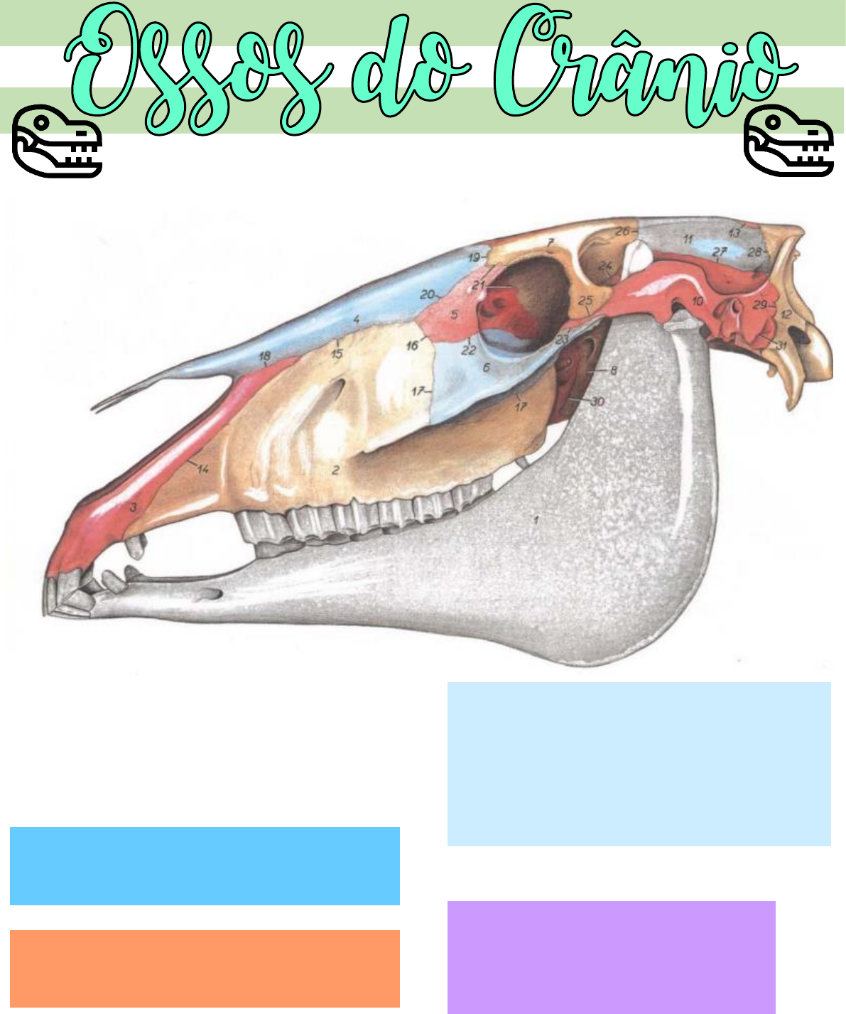 Generalidades → Meio de proteção para o encéfalo → Divisão (NAV, 1968) → ossos crânicos e ossos faciais → Ossos Crânicos → occipital, interparietal, basisfenóide, pré-esfenóide, pterigóide, temporal, parietal, frontal, etmóide, vômer → Ossos Faciais → nasal, concha nasal ventral, maxilar, lacrimal, incisivo, palatino, zigomático, mandíbula hióide Ossos do Crânio ↪ Obs.: Sutura → articulações do tipo fibrosa entre os ossos, “separações” entre eles. A maioria dos ossos do crânio (face e ossos crânicos) se articulam por meio de suturas do tipo fibrosa, mas alguns ossos da base têm articulações do tipo cartilaginosa sincondrose ↪ Obs.: Em animais mais jovens, as suturas são mais bem definidas, com o passar da idade se tornam mais difíceis de visualizar Ossos Crânicos → Relação direta com a caixa craniana, onde o encéfalo é armazenado Occipital ● Partes Laterais, basilar e escamosa (é um osso ímpar, único diferente dos demais que são pares) → Partes Laterais → côndilos occipitais (se articulam com o atlas e forma a articulação atlanto-occipital), processo jugular, canal do hipoglosso (nervo hipoglosso) → Parte Basilar (ventral) → face cerebral (bulbo, ponte repousando) SNC → Parte Escamosa → crista nucal (horizontal), crista sagital externa (vertical), protuberância occipital externa (inserção do ligamento da nuca). Contribui para o arco zigomático ↪ Obs.: Forame Magno → passa a medula espinhal Basisfenóide ● 1 corpo, 1 par de asas, 1 par de processos (é mais caudal) → Corpo → face cerebral (sela túrcica → aloja a hipófise) → Asa → face cerebral - sulco para o seio cavernoso (medial) e sulco para o nervo maxilar (lateral) → Processo pterigóide (na asa) → raiz → perfurada pelo canal alar que passa a artéria maxilar Pré-Esfenóide ● 1 corpo, 1 par de asas (é mais rostral) → Corpo → sulco óptico para passar os nervos ópticos (quiasma óptico cruzamento das fibras ópticas) Occipital (vista dorsal) Occipital (vista basilar) Face Dorsal ou Cerebral da porção Basilar do Occipital ↪ Esfenóide → Basisfenóide ↪ Pré-Esfenóide ↪ Obs.: articula-se, rostrodorsalmente, com o etmóide → Extremidade rostral → seios esfenoidais (seio esfenopalatino) Esfenóide = Basisfenóide(caudal) + Pré-Esfenóide(rostral) Pré-Esfenóide Etmóide ● 1 lâmina cribriforme, 2 labirintos, 1 lâmina perpendicular → Lâmina Cribriforme → passagem dos filamentos do nervo olfatório (teia, “furinhos”) que chegam no bulbo olfatório → Crista Gali → divide a lâmina cribriforme e se prende uma prega de uma das meninges (envoltórios do encéfalo) → Fossa etmoidal (aloja o bulbo olfatório) → Faz relação com a cavidade craniana e nasal Furinhos na lâmina cribriforme → para passagem das fibras do nervo olfatório para chegar no bulbo olfatório → Labirinto Etmoidal (endoturbinados I a VI) → estrutura muito complexa: I - Concha nasal dorsal II - Concha nasal média III a VI - diminuem de tamanho → Lâmina perpendicular → rostralmente continua-se com a cartilagem do septo nasal e caudalmente projeta-se na crista gali Lâmina Cribriforme do osso Etmóide Etmóide Interparietal → Localizado centralmente entre a parte escamosa dos ossos occipital e parietal (é um osso pequeno) Parietais ● 2 faces, 4 bordas (articula com o temporal). São ossos pares, direito e esquerdo → Face externa → crista sagital externa → Face interna (cerebral) → impressões dos sulcos (na caixa craniana) e giros cerebrais Interparietal Parietais Parietal Bovino deslocado ventro-lateralmente Frontais ● 3 partes → escamosa, nasal, orbitária (mais próxima do parietal, nasal é mais próxima do osso nasal). São ossos pares, direito e esquerdo → Face interna → entra na formação das cavidades nasal e craniana → Seio frontal → participa do seio frontal e caixa craniana. ↪ Deixa o crânio mais “leve” (tecido mucoso) ↪ Inflamação deles causa sinusite → Unidos na linha mediana por uma sutura interfrontal → Forame Supra-Orbital (nas laterais) → Processo Zigomático do Frontal (rostral aos forames) Frontais ↪ Obs.: Os bovinos apresentam frontais mais extensos pegando todo o teto craniano Frontal Bovino Temporais ● 3 partes → escamosa, timpânica, petrosa. São ossos pares, direito e esquerdo (fossa temporal) → Parte Escamosa → Processo zigomático (participa do arco zigomático) → Tubérculo articular (para o côndilo da mandíbula) → Fossa mandibular → Processo retro articular → Parte petrosa → Escavações para as porções da orelha interna (captação de sons e equilíbrio), meato acústico interno → Parte Timpânica → Meato acústico externo (conduz à cavidade do tímpano) → Bula Timpânica (encerra uma cavidade que é parte do tímpano) → Processo estilóide, mastóide e muscular (orelha externa) → Fossa temporal Temporais → Temporal se articula com o côndilo da mandíbula e com o hióide Fossa Temporal Porção Escamosa do Temporal Meato acústico externo Processo Mastóide Processo Muscular Processo Estilóide Pterigóides → Lâminas estreitas e encurvadas, situadas de cada lado das coanas → Hámulo do pterigóide → (pontudo) visto na parte basilar (ventral) do osso sendo o processo mais rostral (o caudal é o palatino) Vômer ● Osso mediano, participa na formação da parte ventral do septo nasal, divide a parte caudal das coanas em laterais → Sulco septal → encaixe para a lâmina perpendicular do etmóide e para a cartilagem do septo nasal → Borda ventral → delgada e livre no seu terço caudal e divide as coanas medialmente Porção Petrosa do Temporal (meato acústico interno) Hámulo do Pterigóide Vômer Coanas Ossos Faciais ● Localizados na face do animal Maxilar ● 1 corpo, processo alveolar, processo zigomático, processo palatino → Corpo → crista facial, forame infraorbitário → Processos 