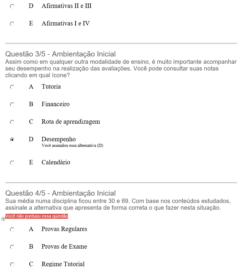 D Afirmativas II e III E Afirmativas I e IV Questão 3/5 - Ambientação Inicial Assim como em qualquer outra modalidade de ensino, é muito importante acompanhar seu desempenho na realização das avaliações. Você pode consultar suas notas clicando em qual A Tutoria B Financeiro C Rota de aprendizagem D Desempenho Você assinalou essa alternativa (D) E Calendário Questão 4/5 - Ambientação Inicial Sua média numa disciplina ficou entre 30 e 69. Com base nos conteúdos estudados, assinale a alternativa que apresenta de forma correta o que fazer nesta situação. Você não pontuou essa questão + A Provas Regulares B Provas de Exame C Regime Tutorial