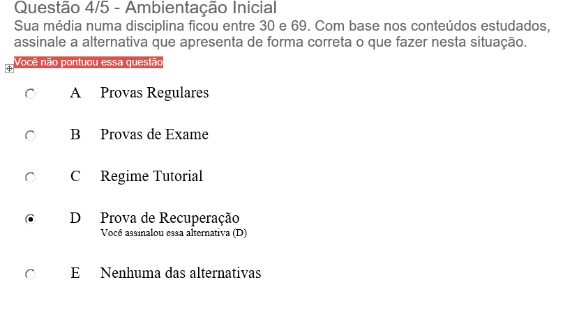 Questão 4/5 - Ambientação Inicial Sua média numa disciplina ficou entre 30 e 69. Com base nos conteúdos estudados, assinale a alternativa que apresenta de forma correta o que fazer nesta situação. Você não pontuou essa questão + A Provas Regulares B Provas de Exame C Regime Tutorial D Prova de Recuperação Você assinalou essa alternativa (D) E Nenhuma das alternativas