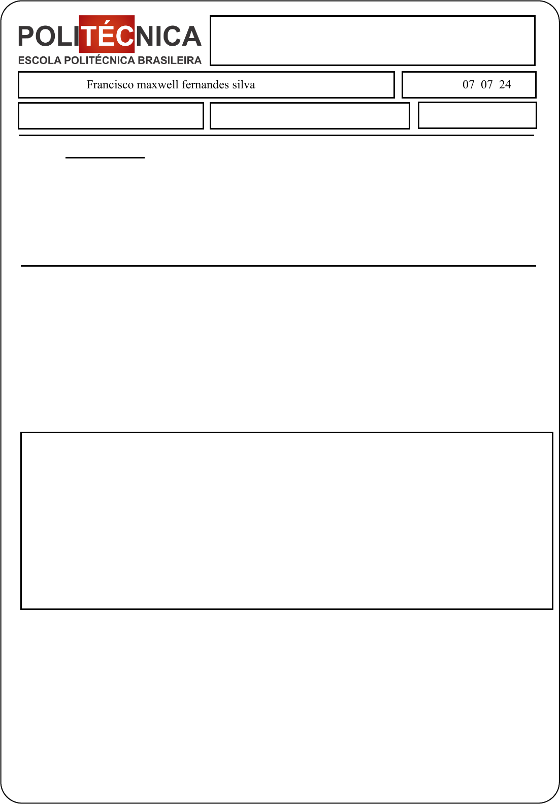Avaliação Final: Matemática Aplicada Francisco maxwell fernandes silva 07 07 24 1 – Marque a alternativa que equivale a conversão de 1,463 dam em cm: Para converter decâmetros (dam) para centímetros (cm), precisamos saber que 1 dam é igual a 1000 cm. Portanto, para converter 1,463 dam para cm, multiplicamos 1,463 por 1000: 1,463dam×1000cm/dam=1463cm Logo, 1,463 dam é igual a 1463cm Resposta letra A a) 1.463cm b) 146,3cm c) 14,63cm d) 14.630cm 2 - O piso de uma sala retangular, medindo 3,52 m × 4,16 m, será revestido com ladrilhos quadrados, de mesma dimensão, inteiros, de forma que não fique espaço vazio entre ladrilhos vizinhos. Os ladrilhos serão escolhidos de modo que tenham a maior dimensão possível. Na situação apresentada, o lado do ladrilho deverá medir? A sala mede 3,52 metros por 4,16 metros. Para facilitar os cálculos, vamos converter as dimensões de metros para centímetros: 3,52 m=352 cm Matemática Aplicada Aluno (a): Data: / / Avaliação Final NOTA: INSTRUÇÕES: ❖ Esta Avaliação Final contém 10 questões, totalizando 10 (dez) pontos. ❖ Você deve preencher dos dados no Cabeçalho para sua identificação ❖ Nome / Data de entrega ❖ Utilize o espaço delimitado abaixo de cada questão para desenvolver seus cálculos. ❖ Só será avaliada a questão que apresentar o seu respectivo desenvolvimento. ❖ Ao terminar grave o arquivo com o nome Avaliação Final (nome do aluno). ❖ Salve o arquivo no formato .pdf e envie pelo sistema. SÓ SERÁ AVALIADA A QUESTÃO QUE APRESENTAR O SEU RESPECTIVO DESENVOLVIMENTO! Avaliação Final: Matemática Aplicada 4,16 m=416 cm Agora, vamos encontrar o MDC de 352 e 416. 1. Fatoração de 352: • 352÷2=176 • 176÷2=88 • 88÷2=44 • 44÷2=22 • 22÷2=11 • 11 é primo. Portanto, 352=25×11 2. Fatoração de 416: • 416÷2=208 • 208÷2=104 • 104÷2=52 • 52÷2=26 • 26÷2=13 • 13 é primo. Portanto, 416=25×13. O maior divisor comum entre 352 e 416 é 25=32. Portanto, o lado do ladrilho deverá medir 32 cm para revestir completamente o piso da sala. Resposta letra C a) 28 cm b) 30 cm c) 32 cm d) 34 cm 3 - Calcule e marque a resposta correta para o cálculo de 912 921: Para calcular a fração 912 / 921, podemos usar a propriedade das potências que diz que: Am An =am−n Aplicando essa propriedade, temos: 921/912 = 912−21 = 9−9 SÓ SERÁ AVALIADA A QUESTÃO QUE APRESENTAR O SEU RESPECTIVO DESENVOLVIMENTO! Avaliação Final: Matemática Aplicada A expressão 9−9 pode ser escrita como uma fração, já que qualquer número com expoente negativo é igual a 1 dividido por o mesmo número com expoente positivo: 9−9 = 1/99 Resposta letra A a) 9-9 b) 99 c) 1-9 d) 933 4 – Calcule e marque a resposta correta para o cálculo de √√103𝑥100³ 23 : Resposta C a) 10𝑥10 1 2 b) 1.000 c) 101/2 d) 100 5 – Calcule as raízes da seguinte equação: 𝑥2 + 2𝑥 − 3 = 0 Neste caso, a=1, b=2, e c=−3. Substituindo esses valores na fórmula, temos: Calcule o discriminante (Δ\DeltaΔ): Δ=b2−4ac=22−4⋅1⋅(−3)=4+12=16 Calcule as raízes usando a fórmula de Bhaskara: x=−b±Δ2a=−2±16/2⋅1=−2±4/2 Resolva para as duas possíveis soluções: SÓ SERÁ AVALIADA A QUESTÃO QUE APRESENTAR O SEU RESPECTIVO DESENVOLVIMENTO! Avaliação Final: Matemática Aplicada x1=−2+4/2=2/2=1 x2=−2−4/2=−6/2=−3 Portanto, as raízes da equação são x=−3x e x=1x Resposta letra A a) -3 e 1 b) 1 e 3 c) -3 d) 2 6 – Calcule e dê resultado em Notação Científica da seguinte operação: (5𝑥105) − (5𝑥106): Para resolver a operação(5×105)−(5×106) e expressar o resultado em notação científica, siga estes passos: Expresse os números com a mesma potência de 10: 5×105=0,5×106 Portanto, a operação se torna: (0,5×106)−(5×106) Realize a subtração: 0,5×106−5×106=(0,5−5)×106 =−4.5×106 Assim, o resultado em notação científica é−4.5×106 Então, Resposta letra A −4,5×106 a) −4,5𝑥106 b) 0 c) 4,5𝑥10−1 d) 1𝑥1011 7 – Marque a alternativa que equivale a conversão de 54321 cm² em km² Avaliação Final: Matemática Aplicada 3. Entenda os fatores de conversão: • 1 quilômetros=105 cm • Portanto,1 quilômetros2=(105 cm)2=1010 cm2 Execute a conversão: 54321 cm2×(1 quilômetros2/1010 cm2)=54321×10−10 quilômetros2 Simplifique a expressão: 54321×10−10 quilômetros2 = 5.4321×10−6 quilômetros2 Portanto, a conversão correta é: 5.4321×10−6 quilômetros2 Resposta letra B 0,0000054321 a) 0,00054321 km² b) 0,0000054321 km² c) 0,000054321 km² d) 0,00000054321 km² 8 – Qual o valor da área de uma circunferência com diâmetro de 9 cm? Onde A é a área e r é o raio da arquitetura. Calcular o raio a partir do diâmetro: O diâmetro (e) é 9 cm, então o raio (r) é a metade do diâmetro: r=e/2=9/2=4.5 cm Calcular a área: A=πr2=π(4.5)2=π×20.25 Substituir o valor deπ\piπ(aproximadamente 3.14): A≈3.14×20.25≈63.585 cm2 Portanto, a área de um arquitetura com diâmetro de 9 cm é aproximadamente63.585 cm2 Resposta letra C a) 28,3 cm² b) 254,5 cm² c) 63,6 cm² d) 127,2 cm² Avaliação Final: Matemática Aplicada 9 – Calcule e marque a resposta correta para √72/3 1 3 : Podemos simplificá-la da seguinte forma: 4. Simplifique 72/3 5. Tire a raiz cúbica de 72/3 6. Inverta o resultado para obter a fração. Primeiro, simplifique 72/3 72/3=(71/3)2 Agora, tire a raiz cúbica de 72/3 raiz elevado a 3 sobre 72/3 =(72/3)1/3=7(2/3)⋅(1/3)=72/9 Finalmente, inverta o resultado: 1/raiz elevado a 3 sobre 72/3 =1/72/9 Resposta letra D a) 7 b) 79/2 c) 7² d) 72/9 10 – Em uma disputa de tiro, uma catapulta, operando durante 6 baterias de 15 minutos cada, lança 300 pedras. Quantas pedras lançará em 10 baterias de 12 minutos cada? A catapulta lança 300 pedras em 6 baterias de 15 minutos cada. Primeiro, vamos calcular o tempo total dessas 6 baterias: 6 baterias×15 minutos por bateria=90 minutos A catapulta lança 300 pedra