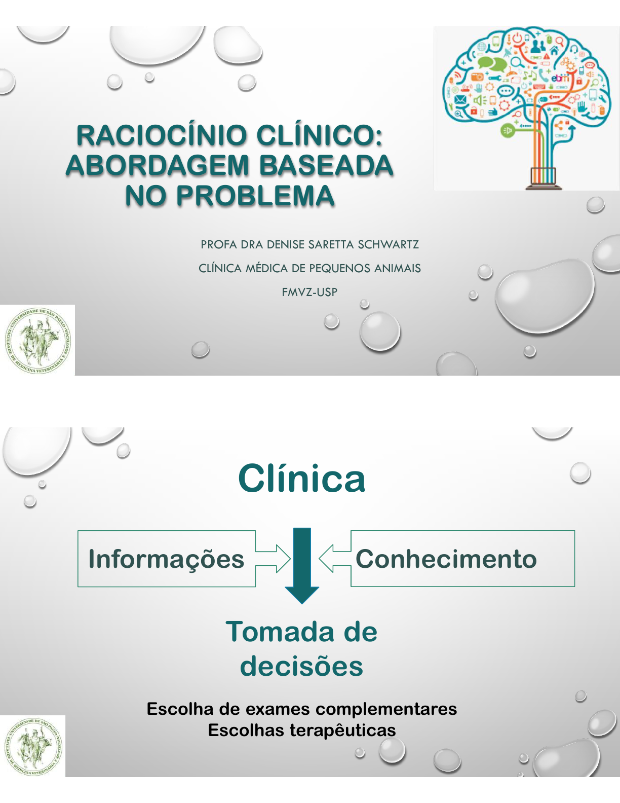 RACIOCÍNIO CLÍNICO: ABORDAGEM BASEADA NO PROBLEMA PROFA DRA DENISE SARETTA SCHWARTZ CLÍNICA MÉDICA DE PEQUENOS ANIMAIS FMVZ-USP Clínica Tomada de decisões ConhecimentoInformações Escolha de exames complementares Escolhas terapêuticas CAN SHITZU FÊMEA 10 MESES • ENCAMINHADA PARA IMPLANTE DE MARCAPASSO QUEIXA PRINCIPAL: • LETARGIA E DESMAIOS ESPORÁDICOS HÁ 5 MESES CAN SHITZU FÊMEA 10 MESES • APETITE NORMAL (RAÇÃO SUPER PREMIUM Filhotes 3X/DIA) • FEZES DE CONSISTÊNCIA E ASPECTO NORMAIS, NEGA VÔMITOS. • MICÇÃO NORMAL/URINA (VOLUME E COLORAÇÃO NORMAIS) NORMODIPSIA • SÍNCOPE OU PRÉ-SÍNCOPE QUANDO AGITADA (1-2X/SEMANA) • NEGA TOSSE, NEGA ESPIRROS • NEGA CONVULSÕES, NEGA ANDAR EM CÍRCULOS • NEGA CLAUDICAÇÃO, NEGA OUTRAS ALTERAÇÕES SISTÊMICAS • VACINAÇÃO: COMPLETA (3 DOSES, ÚLTIMA AOS 4 MESES) • CONTACTANTE: IRMÃ DE NINHADA - ASSINTOMÁTICA. ANAMNESE: CAN SHITZU FÊMEA 10 MESES • Temperatura: 38oC Estado mental: quieta, mas alerta • FC: 80 bpm FR: 16 mpm TPC: 2s • Mucosas: normocoradas Turgor de pele: normal • Linfonodos: sem alterações • Pulso arterial: Forte (normocinético) ritmo regularmente irregular, síncrono c/ batimentos • Discreto esforço inspiratório, com ronco discreto audível qdo manipulada • Auscultação cardíaca: bulhas normofonéticas, sem sopro, ritmo regularmente irregular pronunciado. • Auscultação pulmonar: discreta propagação do laringo-traqueal e discreto ronco intermitente • Palpação abdominal: sem alterações dignas de nota EXAME FÍSICO PROBLEMAS IDENTIFICADOS À ANAMNESE E EXAME FÍSICO • Síncope ou pré-síncope quando agitada (1-2x/semana, observado desde os 5 meses de idade) • Discreto esforço inspiratório audível e com ronco discreto intermitente • Ritmo cardíaco regularmente irregular (pronunciado) • Propagação do som laringo-traqueal e discreto ronco DESMAIO OU SÍNCOPE ➢PERDA SÚBITA E TRANSITÓRIA DE CONSCIÊNCIA, ➢COM PERDA DE TÔNUS POSTURAL, ➢ASSOCIADA OU NÃO À MICÇÃO E DEFECAÇÃO ➢E COM RECUPERAÇÃO ESPONTÂNEA (Possíveis causas de) SÍNCOPE •CARDIOPATIA (congênita/adquirida) •PROBLEMAS RESPIRATÓRIOS/ Síndrome braquicefálico •ANEMIA • NEUROMEDIADA/NEUROCARDIOGÊNICA (VASO-VAGAL) •METABÓLICA - HIPOGLICEMIA Redução da oxigenação cerebral Diferenciais a considerar EXAMES COMPLEMENTARES ECG Can Shitzu Fêmea 10 meses ECOCARDIOGRAMA SIV: 0,38cm Diametro VE:1, 75cm Fração Ejeção: 77% Fração de Encurtamento: 42,3% Vol Sistólico final VE: 2,11ml Vol Diastólico final VE: 9,04ml AE: 1,19cm Ao: 1,22cm AE/Ao: 0,98 “Bradiarritmia” Diagnóstico Presuntivo feito anteriormente: Diagnóstico Correto?.... E agora?? precisa de marca-passo? Síndrome das vias aéreas dos braquicefálicos “Bradiarritmia” Diagnóstico Estenose de narina +/- prolongamento de palato? … A causa da "bradiarritmia" é alteração da atividade elétrica cardíaca ou é secundária a outro problema? ANTES DEPOIS 16 RINOPLASTIA Paciente Problema Diagnóstico Tratamento Anamnese Exame físico Exames complementares Seleção + Decisão Inte rpre taçã o Interpretação Queixa Principal , manifestações clínicas Decisão Medicina Veterinária Baseada em Evidência 18 Abordagem da prática médica que tem o objetivo de melhorar e avaliar o cuidado com o paciente. Necessita de integração crítica das melhores evidências em pesquisa com os valores dos pacientes para tomar decisão sobre cuidado médico. Este método é usado para auxiliar os médicos a fazer diagnósticos apropriados, construir a melhor bateria de testes, escolher o melhor tratamento e metodologia para a prevenção de doenças, bem como desenvolver orientações para grupos grandes de pacientes com a mesma doença. (Tradução livre do original: JAMA 296 (9), 2006) https://decs.bvsalud.org/ths/resource/?id=33150&filter=ths_termall&q=medicina%20baseada%20em%20evid%C3%AAncias Estado clínico e circunstâncias Preferências do“paciente” (responsável) Mel hor Evid ênc ia Cie ntifi ca melhor desfecho clínico Experiência (Expertise) Clínica “Melhor Decisão Clínica” Otimização de resultados clínicos e qualidade de vida Adaptado de Roudebush et al., 2009 e 2010 Conhecimento e expertise clínica Uso das habilidades clínicas para: • Identificar o estado de saúde único do paciente • Estabelecer um diagnóstico • Determinar riscos e benefícios de uma intervenção • Integrar a evidência com os valores do paciente e circunstância. Nobre & Bernardo, 2007 SEM O DIAGNÓSTICO TRATAMENTO AMPLO/ INESPECÍFICO CO RTI CÓ IDE MESMO INDIVÍDUO EM DIFERENTES MOMENTOS AO MESMO TEMPO Rand, J. 2006 PODE TER MAIS DE 1 AFECÇÃO IMPORTÂNCIA DO DIAGNÓSTICO ANTI BIÓT ICOs AINEs Competência para fazer diagnóstico Habilidade mais importante a ser aprendida durante a educação veterinária Rand, J. 2006 IMPORTÂNCIA DO DIAGNÓSTICO SOLUÇÃO DE PROBLEMAS Fazer um diagnóstico Processo complexo e com incertezas Rand, J. 2006 COMO VOCÊ SOLUCIONA UM PROBLEMA? Se você já viu o problema anteriormente E se…. você nunca se deparou com este tipo de problema? Comparação/ Reconhecimento de padrões Construção do conhecimento Formas do conhecimento Portney &Watkins, 2008 Tradição Autoridade Tentativa e Erro Raciocínio Dedutivo Raciocínio Indutivo Método Científico RACIOCÍNIO INDUTIVO DEDUTIVO Obs: FATOS & FENÔMENOS PARTICULARES Cria HIPÓTESES Generalização Particularização Baseado em PREMISSAS VERDADEIRAS FALSAS Conclusão verdadeira + raciocínio válido Conclusão ERRADA Conclusões gerais Importante na escolha de exames e tratamento RACIOCÍNIO LÓGICO Observação GERAL Conclusão ESPECÍFICA Observação ESPECÍFICA Conclusão GERAL IN D U TI VO D ED U TI VO ParticularizaçãoGeneralização RACIOCÍNIO ESPECÍFICO GERAL INDUTIVO DEDUTIVO Generalização resultados estudos Criação de teorias/hipóteses SOLUÇÃO DE PROBLEMAS “RÁPIDO” VANTAGEM DESVANTAGENS 