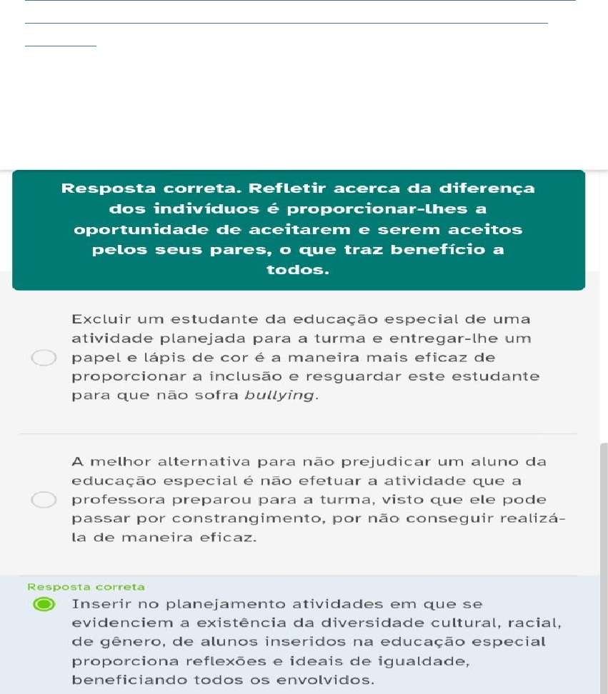 Currículo Atividade A3 – Unidade 4 de estudo 1- Em suma, os princípios do respeito à liberdade e apreço à tolerância, consagrados na Lei de Diretrizes e Bases da Educação Nacional, vêm sendo fortemente ameaçados nos últimos anos por forças ultraconservadoras e intolerantes, especial mas não unicamente, em relação à igualdade entre os gêneros e ao respeito à diversidade sexual. Por outro lado, os marcos normativos da educação nacional, desde a Constituição Federal, fornecem todo o alicerce necessário para enfrentar essas forças, promover a igualdade e o respeito na educação, e devem prevalecer. REIS, Toni. LDB: Respeito à Liberdade e Apreço à Tolerância. Disponível em http://retratosdaescola.emnuvens.com.br/rde/article/view/727/715http://retratosdaescola.emnuvens.com.br/rde/article/view/727/715. Acessado em 29 de julho de 2019, às 22h37. As diferenças tendem a atrelar valor ao meio social dos estudantes. Considerando o texto, os conhecimentos adquiridos na unidade 4 da disciplina sobre o meio do social dos estudantes, assinale a alternativa correta. 2- No artigo n° 206 da http://www.planalto.gov.br/ccivil_03/constituicao/constituicaocompilado.htm, além da liberdade de aprender e de ensinar, o texto estabelece o pluralismo de ideias. Já a http://www.planalto.gov.br/ccivil_03/Leis/l9394.htm coloca entre os princípios da Educação, o respeito à liberdade e o apreço à tolerância. Tratar da diversidade na escola não é, portanto, apenas uma forma de atender ao princípio constitucional de pluralismo de ideias. Significa promover a tolerância entre as diversas maneiras de se de expressar e os diferentes pensamentos e modos de viver presentes na nossa sociedade. TODOS PELA EDUCAÇÃO. É Hora de Discutir Diversidade Dentro da Escola. Disponível emhttps://educacao.estadao.com.br/blogs/educacao-e-etc/e-hora-de-discutir-diversidade-dentro-da-escola/https://educacao.estadao.com.br/blogs/educacao-e-etc/e-hora-de-discutir-diversidade-dentro-da-escola/. Acessado em 26 de julho de 2019, às 18h33. A promoção da diversidade na escola ocorre a partir de algumas ações propostas pela escola. Leia as afirmações abaixo. I – É reconhecido pela LDB o direito às comunidades indígenas utilizarem a sua própria língua, conforme cultura e identidade das tribos. A isso atribui-se a nomenclatura de educação bilíngue II – A superdotação não é uma das características que dará direito ao estudante ser incluído nos critérios avaliativos da educação inclusiva. III – O Ensino Religioso pode ser uma disciplina obrigatória nas escolas de todo o território nacional e a preferência é pela doutrinação da religião Católica. IV – O ensino da cultura e história afro-brasileira e indígena, previsto pela lei 10.639/ 2003, valoriza o reconhecimento identitário do povo negro. V – As condições climáticas e o calendário agrícola podem direcionar a organização dos calendários escolares das escolas do campo. Assinale a alternativa correta. 3- A Lei de Diretrizes e Bases da Educação Nacional representa um marco na história recente da educação brasileira. A sua importância decorre não apenas do conteúdo do texto, mas advém, especialmente, do contexto em que foi elaborada. Conforme vem sendo amplamente discutido na literatura especializada, a construção dessa Lei traz a marca exemplar da participação cidadã de diferentes segmentos da sociedade civil organizada, na área de educação, destacadamente o Fórum Nacional em Defesa da Escola Pública na LDB. PEREIRA, E. W.; TEIXEIRA, Z. A. Reexaminando a Educação Básica na LDB: o que Permanece e o que Muda. Disponível emhttp://www.ia.ufrrj.br/ppgea/conteudo/conteudo-2009-2/3SF/PEREIRA&TEIXEIRA-2008Educacao%20Basica.pdfhttp://www.ia.ufrrj.br/ppgea/conteudo/conteudo-2009-2/3SF/PEREIRA&TEIXEIRA-2008Educacao%20Basica.pdf. Acessado em 26 de julho de 2019, às 15h20. Marque a alternativa correta. 4- A última década foi marcada por avanços significativos na legislação nacional acerca dos direitos trabalhistas dos/as educadores/as das escolas públicas, mas, ainda é preciso concretizar as vitórias no dia a dia das redes estaduais, distrital e municipais de educação, contrapondo a ofensiva neoliberal de retirada de direitos sociais, trabalhistas e previdenciários. ARAUJO, Heleno. A Valorização dos Profissionais da Educação. Carta Capital. Publicado em outubro de 2017. Disponível em https://www.cartacapital.com.br/educacaoartigo/a-valorizacao-dos-profissionais-da-educacao/https://www.cartacapital.com.br/educacaoartigo/a-valorizacao-dos-profissionais-da-educacao/. Acessado em 28 de julho de 2019, às 15h23. A valorização dos profissionais de educação deve ser contínua, a fim de garantir que estes continuem motivados em prol de uma educação de qualidade. Analise as assertivas abaixo a respeito da valorização dos profissionais de educação, previsto no artigo 3º, inciso VII, da LDB. I – Valorizar os professores também significa pensar em planos de carreira que os beneficiem ao passar dos anos. II – Proporcionar aos profissionais de educação momentos de formação continuada, a fim de que aprimorem ou conhecerem novos saberes. III – Os salários oferecidos aos professores devem ser atrativos e devem respeitar o piso salarial nacional, que foi regulamentado pela Lei 11.738/ 2008. IV – É direito dos professores o tempo de trabalho fora da sala de aula, para corrigir avaliações e trabalhos escolares, preparar aula, participar de reuniões e outras atividades pedagógicas. V – Condições necessárias de trabalho, como a terceirização na contratação de professores, fortalece a diversidade de pensamentos que a escola deve apresentar continuamente. Estão corretas as alternativas. 5- É por meio da LDB que encontramos os princípios gerais da educação, bem como as finalidades, os recursos financeiros, a formação e diretrizes para a carreira dos profiss
