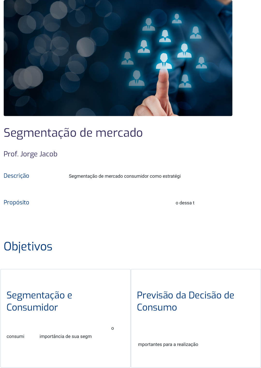 Segmentação de mercado Prof. Jorge Jacob Descrição Segmentação de mercado consumidor como estratégia de otimização dos projetos de marketing. Propósito Apresentar a segmentação de mercado e a aplicação dessa técnica para a otimização dos trabalhos de marketing e o direcionamento do foco sobre o consumidor e seus hábitos de compra. Objetivos Módulo 1 Segmentação e Consumidor Distinguir o mercado de produtos ou serviços para o consumidor e a importância de sua segmentação para um produto ou serviço. Módulo 2 Previsão da Decisão de Consumo Formular as teorias da segmentação de público comprador e os instrumentos e procedimentos importantes para a realização de uma previsão de tomada de decisão do consumidor. Introdução A segmentação de mercado é um item essencial para o estabelecimento de uma compreensão aprofundada dos hábitos do consumidor, aperfeiçoando, dessa maneira, a própria comunicação com ele. Trata-se de uma ferramenta importantíssima, principalmente para o posicionamento no mercado tanto do produto ou do serviço quanto da marca. Gerar identificação com o público-alvo é um fator-chave para transformar nossos consumidores em embaixadores de uma marca. Por meio da segmentação de mercado, conseguiremos “moldar” produtos ou serviços para sermos mais eficientes e assertivos nas tomadas de decisão. Nos próximos módulos, apresentaremos o conceito de posicionamento de uma empresa tendo em vista o processo de segmentação de mercado. Discutiremos formas de se aprimorar a compreensão dos hábitos do comprador ao classificá-los em grupos. Essa atuação auxiliará a realização de um plano de marketing, ajudando na formação de uma base de informações mais detalhada, o que facilita o direcionamento de ações mais eficazes. 1 - Segmentação e Consumidor Ao �nal deste módulo, você será capaz de distinguir o mercado de produtos ou serviços para o consumidor e a importância de sua segmentação para um produto ou serviço. Segmentação de mercado e o consumidor Neste tema, você entenderá a importância da segmentação do consumidor de um produto ou serviço. Também vai aprender quais critérios são utilizados e de que forma eles definem e explicam os hábitos de compra, além de serem apresentadas as ferramentas importantes para decisões de planos estratégicos e ações mais assertivas. Atrair a atenção do cliente, conseguir mostrar seu diferencial competitivo e garantir a venda de seus produtos ou serviços são desafios constantes e cada vez mais difíceis de serem atingidos. Contudo, com a compreensão mais detalhada do comprador e a orientação dos esforços da empresa para atender cada perfil de cliente, a aceitação do produto pode ser facilitada. Conceitos para compreender a segmentação de mercado A segmentação de mercado busca separar consumidores em diferentes grupos, conforme uma série de variáveis, como características, necessidades, preferências, comportamentos, hábitos de consumo, nível de fidelidade com a empresa e muito mais. Dessa forma, a empresa consegue trabalhar seus produtos e serviços de acordo com os públicos de interesse. Para isso, ela precisa entender o posicionamento competitivo dela, assim como as informações e os dados disponíveis, para, assim, poder tomar decisões estratégicas. Dados correspondem a observações documentadas que podem ser medidas. Eles são, por exemplo, a quantidade de vendas de um produto ou a avaliação de um cliente em relação a ele. Um dado pode ser ainda a quantidade de vezes que esse produto foi pesquisado no site da empresa ou tocado propriamente em uma loja física. A princípio, os dados não têm valor agregado, uma vez que, de forma isolada, eles não permitem entendimento algum. Para que se transformem em informações relevantes, os dados precisam ser analisados e ter conectividade com o contexto geral. Depois que se atribui um signi�cado a eles e são analisados sua relevância e seu propósito, temos, então, uma informação. (FLORES, 2019) Ter uma informação precisa é fundamental para o posicionamento competitivo da empresa. Sendo assim, podemos entender posicionamento sendo a forma como a empresa se coloca em relação ao mercado, ou seja, como ela quer ser percebida pelo cliente. Já a segmentação lhe permite compreendê-lo melhor e encontrar soluções para um certo público-alvo. Ao identificar um segmento para o qual o produto será dirigido, formula-se um posicionamento adequado e compatível com o grupo de consumidores escolhido e com seus desejos. Dessa forma, a segmentação é anterior ao posicionamento de uma marca, contribuindo para que a comunicação entre ela e o consumidor seja efetiva. Uma empresa internacionalizada, como o McDonald’s, por exemplo, adota um posicionamento baseado em quatro conceitos complementares: Afinal, cada país apresenta especificidades culturais e demandas diferentes. Com isso, a marca consegue compreender as preferências e as necessidades dos consumidores de cada região. Este é um exemplo em que a segmentação de cliente se confunde com o posicionamento de uma marca, apoiando-o. Discutiremos no próximo item a ideia de segmentação de maneira mais aprofundada. Segmentação de mercado O mercado é heterogêneo, sendo caracterizado por demandas divergentes. As exigências de compras são variadas; os consumidores, diferentes. Sendo assim, é bastante custoso e complexo para uma empresa atender de uma vez aos anseios de todos — ou seja, ser generalista e fazê-lo com excelência ao mesmo tempo. Dificilmente uma empresa consegue, por meio de um único produto ou serviço, satisfazer adequadamente às necessidades de todos durante todo o tempo. Comentário Segmentação Experimentação Adaptação As empresas costumam empregar a segmentação de mercado, que consiste em trabalhar de forma heterogênea sob outra perspectiva: a de um mercado formado por vários grupos ou