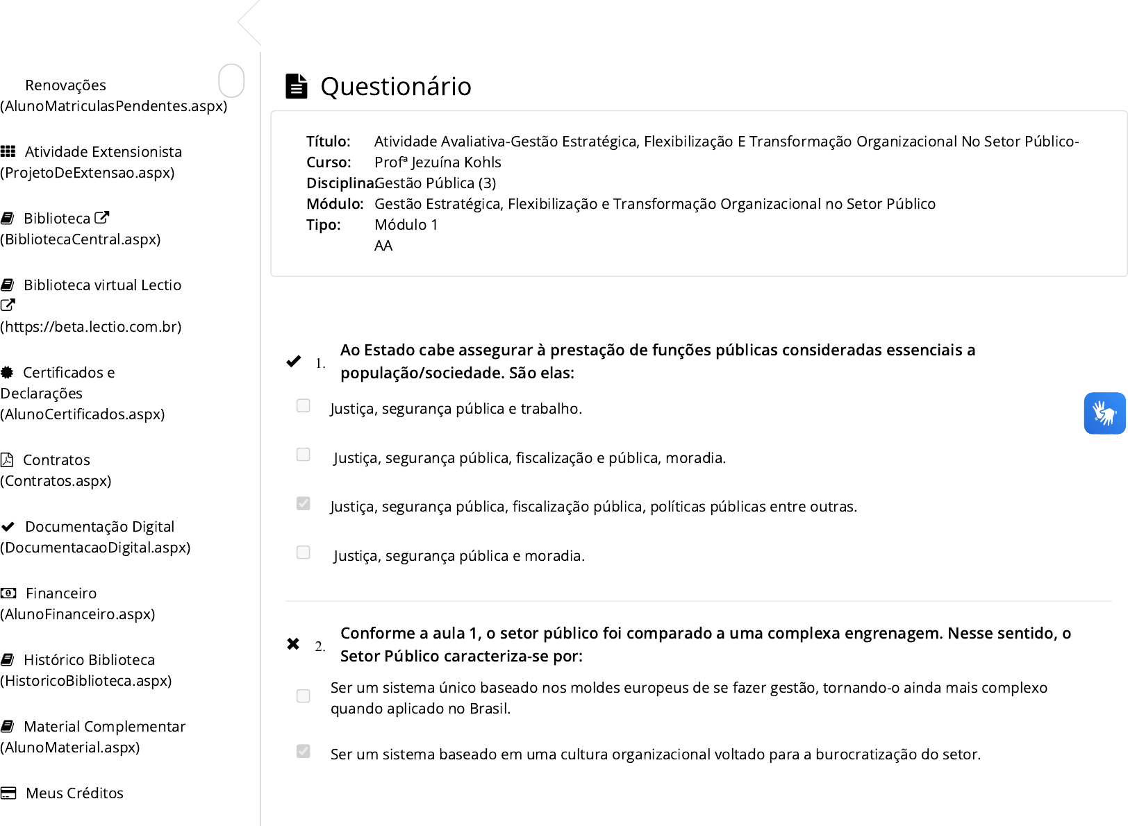 Renovações (AlunoMatriculasPendentes.aspx) Atividade Extensionista (ProjetoDeExtensao.aspx) Biblioteca (BibliotecaCentral.aspx) Biblioteca virtual Lectio (https://beta.lectio.com.br) Certi�cados e Declarações (AlunoCerti�cados.aspx) Contratos (Contratos.aspx) Documentação Digital (DocumentacaoDigital.aspx) Financeiro (AlunoFinanceiro.aspx) Histórico Biblioteca (HistoricoBiblioteca.aspx) Material Complementar (AlunoMaterial.aspx) Meus Créditos Questionário Ao Estado cabe assegurar à prestação de funções públicas consideradas essenciais a população/sociedade. São elas: Justiça, segurança pública e trabalho. Justiça, segurança pública, �scalização e pública, moradia. Justiça, segurança pública, �scalização pública, políticas públicas entre outras. Justiça, segurança pública e moradia. Conforme a aula 1, o setor público foi comparado a uma complexa engrenagem. Nesse sentido, o Setor Público caracteriza-se por: Ser um sistema único baseado nos moldes europeus de se fazer gestão, tornando-o ainda mais complexo quando aplicado no Brasil. Ser um sistema baseado em uma cultura organizacional voltado para a burocratização do setor. Título: Curso: Disciplina: Módulo: Tipo: Atividade Avaliativa-Gestão Estratégica, Flexibilização E Transformação Organizacional No Setor Público- Profª Jezuína Kohls Gestão Pública (3) Gestão Estratégica, Flexibilização e Transformação Organizacional no Setor Público Módulo 1 AA 1. 2. https://cursor.unina.edu.br/Account/AlunoMatriculasPendentes.aspx https://cursor.unina.edu.br/Account/ProjetoDeExtensao.aspx https://cursor.unina.edu.br/Account/BibliotecaCentral.aspx https://beta.lectio.com.br/ https://cursor.unina.edu.br/Account/AlunoCertificados.aspx https://cursor.unina.edu.br/Account/Contratos.aspx https://cursor.unina.edu.br/Account/DocumentacaoDigital.aspx https://cursor.unina.edu.br/Account/AlunoFinanceiro.aspx https://cursor.unina.edu.br/Account/HistoricoBiblioteca.aspx https://cursor.unina.edu.br/Account/AlunoMaterial.aspx https://cursor.unina.edu.br/Account/MeusCreditos.aspx 7,2 mil pessoas curtiram isso. Seja a primeira pessoa entre seus amigos. Curtir (MeusCreditos.aspx) Meus Cursos (AlunoCursos.aspx) Meus Dados (MeusDados.aspx) Minhas Dependências (AlunoDependenciaAulas.aspx) Minhas Notas (AlunoNotas.aspx) Mural de Recados (Mural.aspx) Projeto Ativar (AlunoExtensionistaAulas.aspx) Provas / Atividades (MinhasAtividades.aspx) Solicitações (Taxas.aspx) Vídeos (Video.aspx) Ser um complexo sistema que depende de uma cultura organizacional e�ciente para que essa engrenagem funcione da maneira desejada. Ser um sistema voltado para o clientelismo e para a burocratização dos serviços prestados ao cidadão. As Pessoas Jurídicas de Direito Privado podem ser assim caracterizadas: Associações, Fundações, Sociedades, Partidos Políticos, entre outras. Associações, Fundações, União, Partidos Políticos e Autarquias. Estados Estrangeiros e União. União, Estados, Distrito Federal, Municípios, Autarquias. As Pessoas Jurídicas de Direito externo podem ser assim caracterizadas: Estados Estrangeiros. União, Estados, Distrito Federal, Municípios, Autarquias. Associações, Fundações, Sociedades, Partidos Políticos. Estados Estrangeiros e União. Conforme a Constituição Federal de 1988 são Poderes da União, independentes e harmônicos entre si: O Executivo e o Judiciário. O Legislativo e o Executivo. O Legislativo, o Executivo e o Judiciário. 3. 4. 5. https://cursor.unina.edu.br/Account/MeusCreditos.aspx https://cursor.unina.edu.br/Account/AlunoCursos.aspx https://cursor.unina.edu.br/Account/MeusDados.aspx https://cursor.unina.edu.br/Account/AlunoDependenciaAulas.aspx https://cursor.unina.edu.br/Account/AlunoNotas.aspx https://cursor.unina.edu.br/Account/Mural.aspx https://cursor.unina.edu.br/Account/AlunoExtensionistaAulas.aspx https://cursor.unina.edu.br/Account/MinhasAtividades.aspx https://cursor.unina.edu.br/Account/Taxas.aspx https://cursor.unina.edu.br/Account/Video.aspx O Legislativo e o Judiciário. As Pessoas Jurídicas de Direito Público Interno são: União, Estados, Distrito Federal, Municípios, Autarquias. Associações, Fundações, Sociedades, Partidos Políticos, entre outras. Associações, União, Fundações e Distrito Federal. Estados Estrangeiros. De acordo com o exposto no material didático, a organização do trabalho no setor público tende a: seguir um padrão especí�co no que diz respeito à prestação de serviços aos cidadãos. seguir uma sequência lógica quanto à execução de tarefas laborais. seguir um padrão especí�co com relação às atividades laborais, de hierarquização e organização do trabalho. seguir a lógica de instituições privadas em que a lógica recai sempre sobre os lucros. De acordo com o Código Civil de 2002 as pessoas jurídicas são divididas em: Pessoas Jurídicas de Direito Público Interno e Pessoas Jurídicas de Direito Privado. Pessoas Jurídicas de Direito Público Interno, Pessoas Jurídicas de Direito Público Externo e Pessoas Jurídicas de Direito Privado. Pessoas Jurídicas de Direito Público Interno e pessoas oriundas do setor internacional. Pessoas Jurídicas de Direito Privado e Pessoas Jurídicas de Direito Público Interno. 6. 7. 8. UNINA Copyright © 2011 - 2024. Todos direitos reservados. De acordo com Carbone (2000) a administração pública brasileira possui características próprias e complementa: “Nas organizações públicas, são as relações de trabalho e os jogos de poder os verdadeiros indicadores de poder no Brasil”. “Nas organizações públicas, são as relações de estima e os jogos de in�uência os verdadeiros indicadores de poder no Brasil”. “Nas organizações públicas brasileiras, são as relações entre os sujeitos sociais os verdadeiros indicadores de poder no Brasil”. “Nas organizações públicas, são as relações de força e a mão de obra os