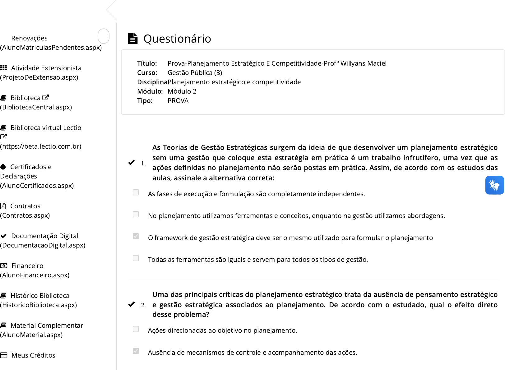 Renovações (AlunoMatriculasPendentes.aspx) Atividade Extensionista (ProjetoDeExtensao.aspx) Biblioteca (BibliotecaCentral.aspx) Biblioteca virtual Lectio (https://beta.lectio.com.br) Certi�cados e Declarações (AlunoCerti�cados.aspx) Contratos (Contratos.aspx) Documentação Digital (DocumentacaoDigital.aspx) Financeiro (AlunoFinanceiro.aspx) Histórico Biblioteca (HistoricoBiblioteca.aspx) Material Complementar (AlunoMaterial.aspx) Meus Créditos Questionário As Teorias de Gestão Estratégicas surgem da ideia de que desenvolver um planejamento estratégico sem uma gestão que coloque esta estratégia em prática é um trabalho infrutífero, uma vez que as ações de�nidas no planejamento não serão postas em prática. Assim, de acordo com os estudos das aulas, assinale a alternativa correta: As fases de execução e formulação são completamente independentes. No planejamento utilizamos ferramentas e conceitos, enquanto na gestão utilizamos abordagens. O framework de gestão estratégica deve ser o mesmo utilizado para formular o planejamento Todas as ferramentas são iguais e servem para todos os tipos de gestão. Uma das principais críticas do planejamento estratégico trata da ausência de pensamento estratégico e gestão estratégica associados ao planejamento. De acordo com o estudado, qual o efeito direto desse problema? Ações direcionadas ao objetivo no planejamento. Ausência de mecanismos de controle e acompanhamento das ações. Título: Curso: Disciplina: Módulo: Tipo: Prova-Planejamento Estratégico E Competitividade-Profº Willyans Maciel Gestão Pública (3) Planejamento estratégico e competitividade Módulo 2 PROVA 1. 2. https://cursor.unina.edu.br/Account/AlunoMatriculasPendentes.aspx https://cursor.unina.edu.br/Account/ProjetoDeExtensao.aspx https://cursor.unina.edu.br/Account/BibliotecaCentral.aspx https://beta.lectio.com.br/ https://cursor.unina.edu.br/Account/AlunoCertificados.aspx https://cursor.unina.edu.br/Account/Contratos.aspx https://cursor.unina.edu.br/Account/DocumentacaoDigital.aspx https://cursor.unina.edu.br/Account/AlunoFinanceiro.aspx https://cursor.unina.edu.br/Account/HistoricoBiblioteca.aspx https://cursor.unina.edu.br/Account/AlunoMaterial.aspx https://cursor.unina.edu.br/Account/MeusCreditos.aspx 7,2 mil pessoas curtiram isso. Seja a primeira pessoa entre seus amigos. Curtir (MeusCreditos.aspx) Meus Cursos (AlunoCursos.aspx) Meus Dados (MeusDados.aspx) Minhas Dependências (AlunoDependenciaAulas.aspx) Minhas Notas (AlunoNotas.aspx) Mural de Recados (Mural.aspx) Projeto Ativar (AlunoExtensionistaAulas.aspx) Provas / Atividades (MinhasAtividades.aspx) Solicitações (Taxas.aspx) Vídeos (Video.aspx) E�ciência na fase de análise. Presença de um maior volume de ações direcionadas ao objetivo. Membros de diversos setores se unem para colaborar com dados, informações e treinamentos no processo de formulação do planejamento estratégico. Após a formulação, como deve ser feita a divulgação do planejamento estratégico? Divulgação mínima. Divulgação parcial ao público e completa aos setores especí�cos. Ampla divulgação na empresa, incluindo todos os setores. Divulgação restrita aos setores formuladores do planejamento. Conforme estudado nas aulas sobre vantagem competitiva, muitas vezes não basta ter um melhor custo/benefício ou melhor qualidade em nossos produtos, é preciso: Ter o preço mais baixo do mercado internacional. Fazer os funcionários trabalharem cada vez mais e melhor. Responder aos anseios dos clientes, fornecedores e colaboradores. Realizar muitas modi�cações para não perder a originalidade. A análise começa na coleta de dados e se estende até a formulação da estratégia. Ainda, a análise se divide em duas categorias. Quais são elas? Optativa e relativa. 3. 4. 5. https://cursor.unina.edu.br/Account/MeusCreditos.aspx https://cursor.unina.edu.br/Account/AlunoCursos.aspx https://cursor.unina.edu.br/Account/MeusDados.aspx https://cursor.unina.edu.br/Account/AlunoDependenciaAulas.aspx https://cursor.unina.edu.br/Account/AlunoNotas.aspx https://cursor.unina.edu.br/Account/Mural.aspx https://cursor.unina.edu.br/Account/AlunoExtensionistaAulas.aspx https://cursor.unina.edu.br/Account/MinhasAtividades.aspx https://cursor.unina.edu.br/Account/Taxas.aspx https://cursor.unina.edu.br/Account/Video.aspx Interna e externa. Plausível e aceitável. Correta e incorreta. A compreensão de como a nossa empresa se posiciona em relação aos concorrentes é fundamental para o planejamento estratégico, por isso, a rivalidade é uma das Cinco forças de Porter. Com base em nossos estudos, o que acontece quando a rivalidade é muito acirrada? Recuperação da desvantagem presentes em outras forças. Crescimento das empresas com menores custos e melhores preços. Redução de preços ao nível insustentável. Lucratividade sustentável na comparação de custos e retorno. Para garantir o aperfeiçoamento progressivo da empresa, é comum a recomendação de que o ciclo de quatro fases do planejamento estratégico seja repetido em um intervalo não maior do que: Um trimestre. Uma quinzena. Um ano. Um semestre. Há muitas formas de se desenvolver um planejamento estratégico e levá-lo a cabo. No entanto, há um conjunto de quatro fases que são comuns a maioria dos formatos de planejamento estratégico, são elas: 6. 7. 8. Formulação, execução, orientação e integração. Análise, formulação, execução e avaliação. Pesquisa, relatório, avaliação e formulação. Avaliação, execução, percepção e reformulação. Para se realizar um balanced scorecard é preciso considerar os seus componentes, entre esses temos o mapa estratégico, objetivo estratégico, indicador, meta e planos de ações. De acordo com nosso material didático, o que é o indicador? É a ação prática e operacional que deve ser realizada e controlada. É o resultado que se pretende atingir com as ações. Trata do ní