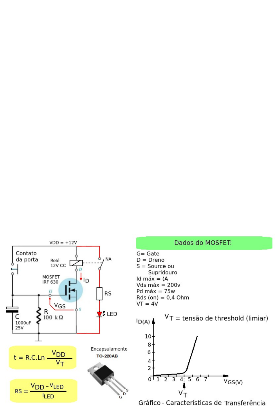 INSTITUTO FEDERAL DE EDUCAÇÃO, CIÊNCIA E TECNOLOGIA – BAHIA Disciplina: EA – Professor: Antônio Almeida - Alunos: Data: ____/____/______ – Turma: __________________ – Alunos: _______________________________________________________________№ ______ _______________________________________________________________№ ______ _______________________________________________________________№ ______ Experimento 09 1. Título: Temporizador com MOSFET 2. Objetivo: Verificar o funcionamento do MOSFET em um circuito Temporizador. 2. Fundamentos teóricos: O circuito abaixo represneta um temporizador para lâmpada interna de Veículo. Quando alguém abre a porta do veículo o contato fecha e carrega o capacitor “C” que alcança a tensão limiar (VT) do MOSFET, este dispara uma corrente dreno-supridouro(d-s) que energiza a bobina do relé e através do contato acionado, liga a lâmpada no painel. Quando a porta do veículo for fechada, o contato fecha e o capacitor descarrega-se via “R” até a tensão ficar abaixo do limiar de “VT”, desoperando o relé e consequentemente deixando a lâmpada no painel desligada enquanto a porta for mantida fechada. Questionário: resolva as seguintes 1. Utilize um cronômetro e anote o tempo que o LED permanece aceso. t = ________ segundos 2. Utilize a fórmula dada e calcule o tempo que o relé fica operando. 3. Pesquise sobre capacitores eletrolítico, compare o tempo medido com o tempo calculado, explique eventuais discrepância; 4. Calcule e indique o valor comercial para o resistor série do LED “RS”. 5. Com base no circuito desenvolva outro circuito temporizador, para uso em outra aplicação, a qual você aconselha ou deseja implementar.