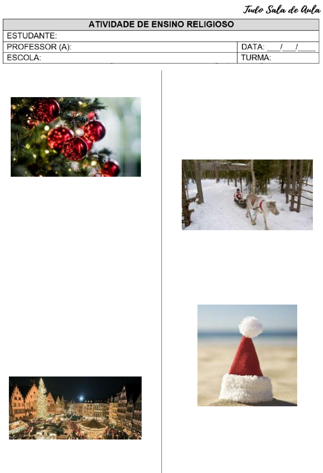 TEMA: TRADIÇÕES NATALINAS Para celebrar essa importante data do calendário cristão, alguns costumes fazem parte dos nossos dias no final do ano. Em muitos lares brasileiros não podem faltar a típica árvore de Natal e o presépio que representa o nascimento de Jesus Cristo. Assim como eles, a figura carismática do Papai Noel também está em todos os cantos do país, desde escolas até os shoppings e centros comerciais. Brasil Uma das mais saborosas e calóricas tradições de Natal no Brasil é fazer a farta ceia na noite do dia 24 para o dia 25, quando também acontece a troca de presentes entre os familiares e amigos. Em famílias mais tradicionais, ainda é visto os pais colocando presentes debaixo das camas dos filhos e falam que foi o Papai Noel quem os colocou enquanto dormiam. Alemanha Na Alemanha, a data é reservada para muitas comemorações em família. O almoço do dia 25 marca o auge das celebrações com pratos típicos, biscoitos natalinos e vinho quente. Dia 26 também é feriado no país, mas os presentes são distribuídos logo no dia 24. Outra tradição interessante é Adventskranz, um tipo de coroa natalina com quatro velas que devem ser acesas em cada domingo de dezembro, chamados de “domingos do advento”. Finlândia Os finlandeses alimentam uma tradição natalina bem diferente dos outros países europeus. Nessa data, é comum visitar o cemitério e aproveitar uma sauna. Austrália Já na Austrália, por conta do clima mais quente como no Brasil, as festas acontecem na praia e não em ambientes fechados. Muitas das tradições, tanto europeias quanto americanas, envolvem preparar biscoitinhos típicos de Natal, encontrar familiares e amigos queridos, decorar suas casas e trocar presentes. https://1.bp.blogspot.com/-4z47nQsfvyU/X4mlccYHfHI/AAAAAAAAoww/pe5J-lqi3HI707eZl2efJbuWZa_8D7yHgCLcBGAsYHQ/s282/1.jpg https://1.bp.blogspot.com/-fld33ASfVdM/X4mllDcWD9I/AAAAAAAAow0/y9vK36CLzlUSlEEhYFQU8ldLMgnxQ7e3QCLcBGAsYHQ/s289/1.jpg https://1.bp.blogspot.com/-gO0154-aO2E/X4mlxGU9HII/AAAAAAAAow8/ti-x0D95HnQVrpAbKXdSfF3GKxm8uqKjwCLcBGAsYHQ/s284/1.jpg https://1.bp.blogspot.com/-fMc8PEMoGgA/X4J3LqfzmRI/AAAAAAAAoZg/C7S1jO3HBYYtHnzpEg6hhdbzIUPcehZ1gCLcBGAsYHQ/s421/1.png Outras tradições Papai Noel O mito do Papai Noel foi baseado na história de São Nicolau, um bispo de Mira que viveu por volta de 300 d.C. Ele era famoso por distribuir presentes às crianças carentes e de ajudar financeiramente as pessoas pobres. Ele costumava deixar um saco de moedas na chaminé das moradias de quem precisava de dinheiro. Por isso falamos que o Papai Noel desce pela chaminé com um saco de presentes. Árvore de Natal A árvore como enfeite natalino começou a virar tradição na idade Média no ano de 1530. Dizem que Martinho Lutero andava por uma floresta onde havia muitos pinheiros, ele olhou para o céu e viu diversas estrelas. Ele então resolveu levar um pinheiro para a casa e colocar uma estrela no topo dela para simbolizar a sua visão da estrela que guiou os três magos até Jesus. Presépio A tradição conta que o presépio foi criado por São Francisco de Assis. Ele criou um presépio (do latim praesepium que significa estábulo) e recriou o nascimento de Jesus com atores e animais de verdade. Esse cenário serviu para uma missa de Natal. O presépio ganhou a admiração dos fiéis e em pouco tempo toda a família fazia o seu presépio em casa. A Estrela de Belém Ela é colocada no alto da árvore natalina para representar a estrela que levou os três magos até o local de nascimento de Jesus. Ela possuiu quatro pontas que representam os pontos cardeais e possui uma cauda luminosa que lembra uma estrela cadente. NATAL É DIA DE PAZ, DE AMOR E DE UNIÃO! ATIVIDADES SOBRE O QUE VOCÊ APRENDEU 1. Escreva alguns costumes natalinos que são praticados pelos cristãos de São Gonçalo do Amarante. _________________________________________ _________________________________________ _________________________________________ _________________________________________ 2. O que é a tradição Adventskranz que acontece na Alemanha? _________________________________________ _________________________________________ _________________________________________ _________________________________________ 3. Qual a tradição natalina você mais gosta quando chega dezembro? Por quê? _________________________________________ _________________________________________ _________________________________________ _________________________________________ 4. Como surgiu a tradição do Papai Noel no natal? _________________________________________ _________________________________________ _________________________________________ _________________________________________ 5. Escreva uma mensagem de natal carregada de paz e amor endereçada à pessoa que você mais gosta neste mundo. _________________________________________ _________________________________________ _________________________________________ _________________________________________