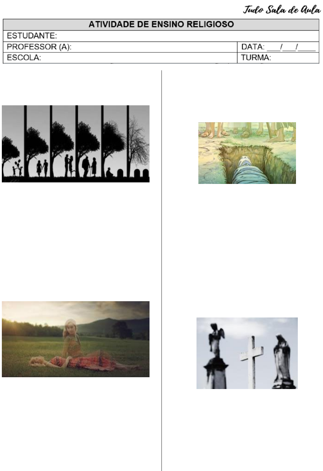 TEMA: VIDA E MORTE - CONCEPÇÕES RELIGIOSAS As religiões ajudam o homem a enfrentar inquietações para as quais a ciência não tem respostas ainda ou para as quais as repostas da ciência não são suficientes. A morte de um ente querido é uma das piores dores que um ser humano pode sentir. Vivenciar o luto é imprescindível para suportar tanto sofrimento e fazer ressurgir um novo viver. Muitas pessoas já passaram por esse dilema ou ainda vão passar. Portanto, é importante todos estarem preparados a lidar com a morte, embora nunca aceitamos, talvez porque nós fomos feitos para viver e não morrer. A vida após a morte é um tema que gera muitas controversas, tanto para as pessoas que seguem alguma religião, como para aquelas que não seguem. Saber o que acontece e se de fato existe a vida após a morte, é tido para os cientistas como um mistério, afinal, ninguém que morreu, voltou para contar. Já para as religiões, o conceito de vida após a morte é visto de várias maneiras, enquanto alguns não acreditam nessa existência, outros acreditam que após a morte, a pessoa falecida ressurge por meio da reencarnação. Vida e Morte De onde viemos e para onde vamos são dois grandes questionamentos que perseguem a humanidade, a filosofia e a ciência há séculos. E, para muitos, são incógnitas que só têm resposta nas religiões. A fé funciona como um ponto de apoio para saber lidar com dúvidas e, principalmente, com as perdas. A relação entre morte e vida sempre foi e será muito estreita. Mesmo com dogmas distintos, todas as religiões pregam coisas boas como o amor ao próximo e a paz. E viver dessa forma garante uma “boa partida” para cada um, independente da crença. A morte no catolicismo Quando o indivíduo morre, ocorre uma separação, o corpo volta para a terra, o espírito volta ao lugar de onde veio (Deus) e a alma pode ir para o céu, o inferno ou o purgatório. As pessoas que obedecerem aos ensinamentos deixados por Jesus, poderão usufruir do céu ou paraíso, lugar onde não há sofrimento ou dor. Para aqueles que fizeram mal na terra, o lugar que os esperam é no inferno, um dos lugares mais temidos no cristianismo, onde haverá https://1.bp.blogspot.com/--eM4LM8wpW0/X4m87cdbLUI/AAAAAAAAozE/z-1VD0Q2hQ0oB6Zka2mbLHV1yPKvXRGxwCLcBGAsYHQ/s388/1.jpg https://1.bp.blogspot.com/-8qtBZ9nKvws/X4m9ERHAwVI/AAAAAAAAozI/RENZ_84BBgMr788WS9P_Mcre_4lgfWspACLcBGAsYHQ/s396/1.jpg https://1.bp.blogspot.com/-ZIYGnDijHW0/X4HVjk0opVI/AAAAAAAAoXY/sPiPCp_43Xc543-3hB8BAp_6kcFrkAQEQCLcBGAsYHQ/s373/1.png https://1.bp.blogspot.com/-Pg8-i0Ri6MY/X4m9PNdbKPI/AAAAAAAAozQ/LBWen_GzLS4ciVfvJdLH_P4FUND7WqQAQCLcBGAsYHQ/s219/1.jpg fogo, sofrimento, demônios e ranger de dentes. Para eles, uma vez indo para este lugar, não há mais volta. Para a Igreja Católica, as pessoas que não foram boas como deveriam para irem para o paraíso, mas também não foram más ao ponto de irem para o inferno, após a morte, o destino que as esperam será no purgatório. Neste lugar, seus espíritos ficarão por um tempo indeterminado e só podem sair de lá mediante muitas orações por aquela alma. A Vida após a morte na Umbanda A religião umbandista acredita em vida após a morte. Para eles, a alma pode ser levada para sete linhas diferentes que são guiadas por orixás ou outras entidades divinas, tudo vai depender da vida que a pessoa levou aqui na terra. Os umbandistas acreditam na reencarnação do espírito após a morte. Se a pessoa teve boas obras, ela irá reencarnar podendo ser um espírito protetor, já aqueles que foram maus irão reencarnar em forma de espíritos perturbadores. Vida após a morte no espiritismo Para os espiritas, a vida após a morte é apenas uma passagem para uma jornada que deve ser concluída pelo espírito, onde o mesmo passará por uma evolução até chegar na reencarnação. Quando o corpo físico morre, o espírito se torna consciente, vivo e liberto. Segundo a visão espírita, as pessoas consideradas boas, que fizeram muitas caridades evoluem de forma fluida, já as pessoas consideradas pecadoras passam a ter uma oportunidade de reparar seu erro por meio da reencarnação. Visão protestante Os evangélicos acreditam no julgamento, na condenação (céu ou inferno) e na eternidade da alma. A diferença é que o morto faz uma grande viagem e a ressurreição só acontecerá quando Jesus voltar à Terra, na chamada 'Ressurreição dos Justos', ou, então, aqueles que forem condenados terão uma nova chance de ressurreição no 'Julgamento Final'. Os que morrerem sem Cristo como seu Deus também receberão um corpo especial para passar a eternidade no lago de fogo e enxofre. Entretanto, o adventismo prega que não existe o inferno, e sim, a morte eterna, em que não haverá retorno dos ímpios em um ambiente de tormentas. Reflexão para aqueles que perderam alguém que ama Encontre força e ânimo para seguir em frente. Nem sempre a vida é justa, mas precisamos resistir e seguir em frente. Tenha força, pois ainda temos muito pela frente. A vida é uma caixinha de surpresas e precisamos aprender a lidar com as dificuldades. ATIVIDADES SOBRE O QUE VOCÊ APRENDEU 1. Para você, por que a morte é um mistério para humanidade? _________________________________________ _________________________________________ _________________________________________ _________________________________________ 2. Você acredita que há vida após a morte? Por quê? _________________________________________ _________________________________________ _________________________________________ _________________________________________ 3. Qual a visão que o catolicismo acredita sobre a morte? _________________________________________ _________________________________________ _________________________________________ _________________________________________ 4. Imagine que um amigo seu perdeu alguém que amava e escreva uma mensagem de conforto para ele. ___________________________________