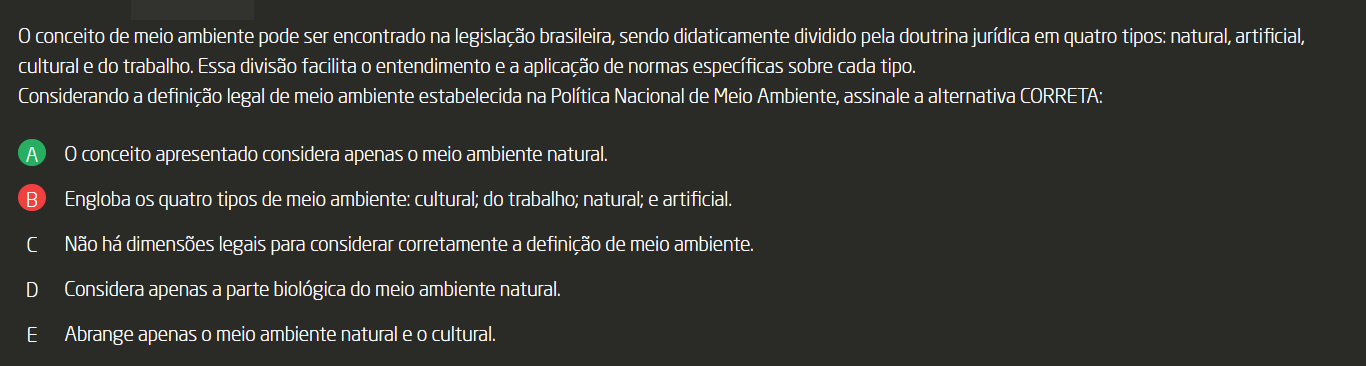 0 conceito de meio ambiente pode ser encontrado na legislação brasileira, sendo didaticamente dividido pela doutrina jurídica em quatro tipos: natural, artificial, cultural e do trabalho. Essa divisão facilita entendimento e a aplicação de normas específicas sobre cada tipo. Considerando a definição legal de meio ambiente estabelecida na Política Nacional de Meio Ambiente, assinale a alternativa CORRETA: A conceito apresentado considera apenas meio ambiente natural. B Engloba os quatro tipos de meio ambiente: cultural; do trabalho; natural; e artificial. Não há dimensões legais para considerar corretamente a definição de meio ambiente. D Considera apenas a parte biológica do meio ambiente natural. E Abrange apenas meio ambiente natural e cultural.