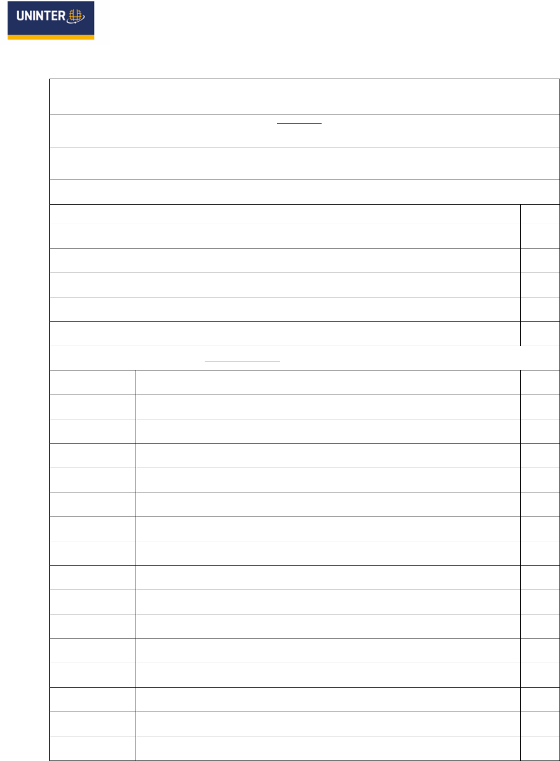 1 CENTRO UNIVERSITÁRIO INTERNACIONAL - UNINTER Estágio Supervisionado Ficha de Frequência e Avaliação de Desempenho NOME DO ESTÁGIO SUPERVISIONADO: CARGA HORÁRIA TOTAL DO ESTÁGIO SUPERVISIONADO: 200 HORAS NOME DO ALUNO – RU: CURSO: LICENCIATURA EM (completar com o nome do seu curso) ATIVIDADE CH Videoaulas + fóruns 10h Plano de aula/ação 10h Pesquisa bibliográfica em base de dados 10h Produção de material 10h Produção conceitual 10h As linhas a seguir são para registrar as 150 horas de campo. No campo ATIVIDADE, descreva a ação realizada na data. DIA/ MÊS/ ANO ATIVIDADE CH 2 CENTRO UNIVERSITÁRIO INTERNACIONAL - UNINTER Estágio Supervisionado Ficha de Frequência e Avaliação de Desempenho ____________________________________________________ NOME E ASSINATURA DO DIRETOR OU RESPONSÁVEL PELA INSTITUIÇÃO CARIMBO DA INSTITUIÇÃO COM CNPJ OU INEP (OBRIGATÓRIO PARA VALIDAÇÃO DO DOCUMENTO) _____________________________________ PROFª. DRª. GISELE CORDEIRO COORDENADORA DA ÁREA DE EDUCAÇÃO CENTRO UNIVERSITÁRIO INTERNACIONAL UNINTER Avaliação de Desempenho Essa etapa da avaliação é preenchida pela unidade concedente e constitui-se como um instrumento relevante para a formação profissional de nosso (a) aluno (a). Por gentileza, caro preceptor, avalie os itens abaixo considerando o desempenho do estagiário com base nos conceitos classificados por: EXCELENTE, BOM, REGULAR e INSUFICIENTE1. PARECER DO SUPERVISOR DA PARTE CONCEDENTE ASPECTOS ATITUDINAIS EXCELENTE BOM REGULAR INSUFICIENTE Assiduidade e cumprimento do horário. Disciplina e responsabilidade: observância das normas internas e zelo pelo patrimônio. Cooperação: disposição para cooperar com os colegas e colaboradores. Interesse: comprometimento demonstrado para as tarefas a serem realizadas. Cumpriu o planejamento de estágio. Apresentação pessoal: o aluno apresenta-se de forma adequada (indumentária) ao ambiente organizacional. 1 EXCELENTE: 9 a 10. BOM: 7 a 8,9. REGULAR: 5 a 6,9. INSUFICIENTE: 0 A 4,9. 3 CENTRO UNIVERSITÁRIO INTERNACIONAL - UNINTER Estágio Supervisionado Ficha de Frequência e Avaliação de Desempenho Preceptor, utilize esse espaço para descrever pontos relevantes e sugestões que contribuam com o desenvolvimento e formação do graduando: Assinatura do professor preceptor da Unidade Concedente: __________________________________________________________________ Local, data: ____________________________________________, ______/______/______