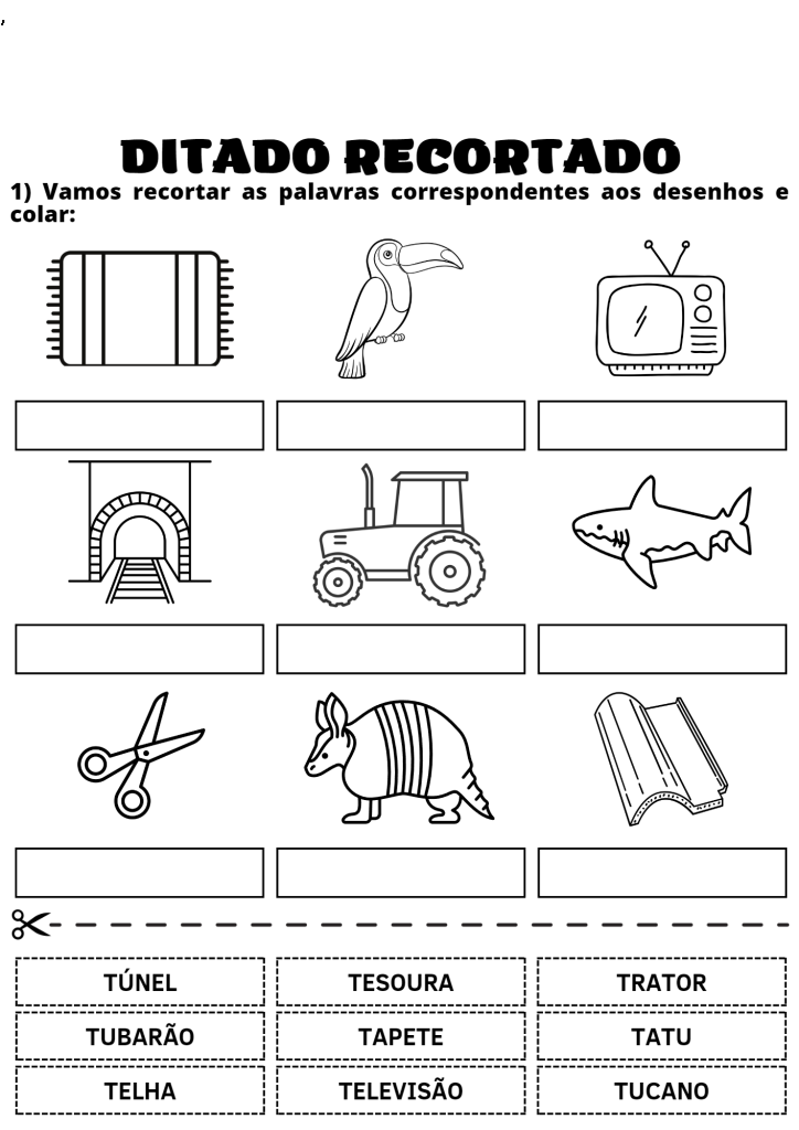 DITADO RECORTADO 1) Vamos recortar as palavras correspondentes aos desenhos e colar: V TÚNEL TESOURA TRATOR TUBARÃO TAPETE TATU TELHA TELEVISÃO TUCANO