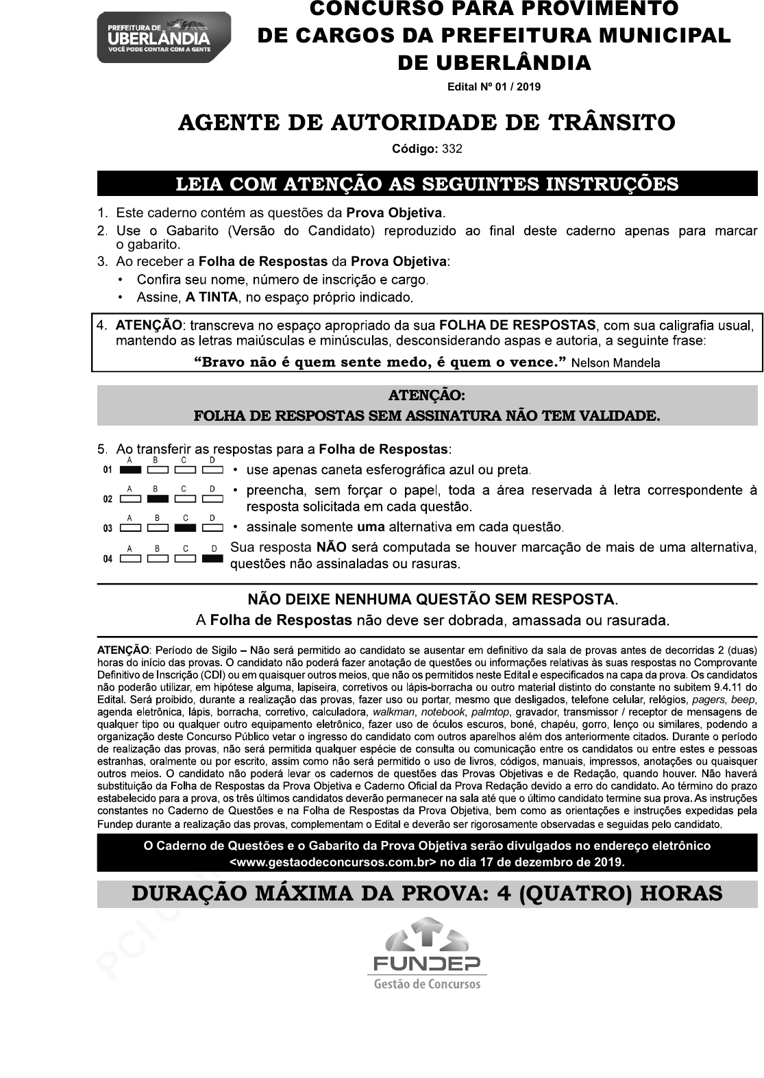 pcimarkpci MDAwMDowMDAwOjAwMDA6MDAwMDowMDAwOmZmZmY6Yzk0YjowMmFl:VHVlLCAwOSBKdWwgMjAyNCAyMTo0MjowNCAtMDMwMA== www.pciconcursos.com.br CONCURSO PARA PROVIMENTO DE CARGOS DA PREFEITURA MUNICIPAL DE UBERLÂNDIA Edital Nº 01 / 2019 AGENTE DE AUTORIDADE DE TRÂNSITO Código: 332 LEIA COM ATENÇÃO AS SEGUINTES INSTRUÇÕES 1. Este caderno contém as questões da Prova Objetiva. o gabarito. 3. Ao receber a Folha de Respostas da Prova Objetiva: A TINTA 4. ATENÇÃO FOLHA DE RESPOSTAS “Bravo não é quem sente medo, é quem o vence.” ATENÇÃO: FOLHA DE RESPOSTAS SEM ASSINATURA NÃO TEM VALIDADE. Folha de Respostas: uma Sua resposta NÃO NÃO DEIXE NENHUMA QUESTÃO SEM RESPOSTA. A Folha de Respostas ATENÇÃO pagers beep walkman notebook palmtop O Caderno de Questões e o Gabarito da Prova Objetiva serão divulgados no endereço eletrônico <www.gestaodeconcursos.com.br> no dia 17 de dezembro de 2019. DURAÇÃO MÁXIMA DA PROVA: 4 (QUATRO) HORAS pcimarkpci MDAwMDowMDAwOjAwMDA6MDAwMDowMDAwOmZmZmY6Yzk0YjowMmFl:VHVlLCAwOSBKdWwgMjAyNCAyMTo0MjowNCAtMDMwMA== www.pciconcursos.com.br ATENÇÃO 45 (quarenta e cinco) (dez) questões de Língua Portuguesa (dez) questões de Matemática / Raciocínio Lógico 5 (cinco) questões de Atualidades, 5 (cinco) questões de Legislação e 15 (quinze) questões de Conhecimentos Específicos imediatamente recursos posteriores. pcimarkpci MDAwMDowMDAwOjAwMDA6MDAwMDowMDAwOmZmZmY6Yzk0YjowMmFl:VHVlLCAwOSBKdWwgMjAyNCAyMTo0MjowNCAtMDMwMA== www.pciconcursos.com.br 3 LÍNGUA PORTUGUESA INSTRUÇÃO questões de 1 a 6. A fotografia está morrendo? The Guardian que o iPhone aqui também um pouco de amargura. Sabemos que o interatividade. a capacidade de apreciar uma imagem. Por isso que iPhone. Para iPhone QUESTÃO 1 apocalíptico A) B) C) D) pcimarkpci MDAwMDowMDAwOjAwMDA6MDAwMDowMDAwOmZmZmY6Yzk0YjowMmFl:VHVlLCAwOSBKdWwgMjAyNCAyMTo0MjowNCAtMDMwMA== www.pciconcursos.com.br 4 QUESTÃO 2 esse tema. A) B) iPhone C) D) QUESTÃO 3 sintetiza corretamente. A) como um todo. B) C) D) produzir arte. QUESTÃO 4 tema debatido. A) B) C) D) QUESTÃO 5 A) B) C) D) QUESTÃO 6 iPhone A) Ambos os trechos estão em desacordo com B) C) D) Ambos os trechos estão de acordo com a pcimarkpci MDAwMDowMDAwOjAwMDA6MDAwMDowMDAwOmZmZmY6Yzk0YjowMmFl:VHVlLCAwOSBKdWwgMjAyNCAyMTo0MjowNCAtMDMwMA== www.pciconcursos.com.br 5 INSTRUÇÃO questões 7 e 8. O de amendoim que se chamava midubim e não era torrado era cozido Dez ovos por uma pataca Língua certa do povo É macaquear bem (Evocação do Recife – QUESTÃO 7 incorreta. A) B) errada. C) D) QUESTÃO 8 A) B) C) D) presente no poema. QUESTÃO 9 Auto-Retrato Falado entortadas. nasci. gado. Os bois me recriam. A) autorretrato e do poema. B) C) D) pcimarkpci MDAwMDowMDAwOjAwMDA6MDAwMDowMDAwOmZmZmY6Yzk0YjowMmFl:VHVlLCAwOSBKdWwgMjAyNCAyMTo0MjowNCAtMDMwMA== www.pciconcursos.com.br 6 QUESTÃO 10 TEXTO I TEXTO II (Mãos Desenhando PORTANTO A) B) C) D) pcimarkpci MDAwMDowMDAwOjAwMDA6MDAwMDowMDAwOmZmZmY6Yzk0YjowMmFl:VHVlLCAwOSBKdWwgMjAyNCAyMTo0MjowNCAtMDMwMA== www.pciconcursos.com.br MATEMÁTICA / RACIOCÍNIO LÓGICO QUESTÃO 11 A) B) C) 11. D) 13. QUESTÃO 12 A) B) C) D) QUESTÃO 13 por Bruna é: A) cinema. B) C) D) QUESTÃO 14 primeira no ato da compra e a segundo trinta dias A) 5%. B) C) 13%. D) 15%. QUESTÃO 15 entregou 54 64 66 56 A) B) C) D) pcimarkpci MDAwMDowMDAwOjAwMDA6MDAwMDowMDAwOmZmZmY6Yzk0YjowMmFl:VHVlLCAwOSBKdWwgMjAyNCAyMTo0MjowNCAtMDMwMA== www.pciconcursos.com.br QUESTÃO 16 Tipo de plano: enfermaria coparticipativo Tipo de plano: apartamento coparticipativo Faixa etária Valor do plano (R$) Faixa etária Valor do plano (R$) Consultas: Exames do Grupo 1: Exames do Grupo 2: Exames do Grupo 3: Terapias: determinada terapia. A) B) C) D) QUESTÃO 17 A) 14 dias. B) 24 dias. C) D) 36 dias. pcimarkpci MDAwMDowMDAwOjAwMDA6MDAwMDowMDAwOmZmZmY6Yzk0YjowMmFl:VHVlLCAwOSBKdWwgMjAyNCAyMTo0MjowNCAtMDMwMA== www.pciconcursos.com.br QUESTÃO 18 do outro. dessa mesma empresa. A) B) C) D) QUESTÃO 19 A) B) C) D) Ari é o economista. QUESTÃO 20 A) B) C) D) ATUALIDADES QUESTÃO 21 Leia o trecho a seguir. Teatro Grande Otelo é tombado como patrimônio histórico e cultural de Uberlândia A) B) C) D) pcimarkpci MDAwMDowMDAwOjAwMDA6MDAwMDowMDAwOmZmZmY6Yzk0YjowMmFl:VHVlLCAwOSBKdWwgMjAyNCAyMTo0MjowNCAtMDMwMA== www.pciconcursos.com.br QUESTÃO 22 A) tipo de mosquito. B) da zika. C) D) os mosquitos transmissores da dengue e da zika QUESTÃO 23 Fake News Sobre fake news A) As fake news se restringem ao campo do B) redes sociais. C) fake news que podem ser D) de fake news de acesso. QUESTÃO 24 Leia o trecho a seguir. Empresários de Uberlândia já buscam alternativas aos canudos plásticos A) necessidade de se substituir os canudos mais baratos. B) C) D) QUESTÃO 25 apresenta o A) B) C) D) pcimarkpci MDAwMDowMDAwOjAwMDA6MDAwMDowMDAwOmZmZmY6Yzk0YjowMmFl:VHVlLCAwOSBKdWwgMjAyNCAyMTo0MjowNCAtMDMwMA== www.pciconcursos.com.br 11 LEGISLAÇÃO QUESTÃO 26 incorreta. A) período. B) C) D) QUESTÃO 27 A) B) C) D) QUESTÃO 28 A) nomeado em virtude B) C) D) QUESTÃO 29 seguir. cabe recurso aos tribunais superiores. A) B) C) D) QUESTÃO 30 suas respectivas características. COLUNA I COLUNA II ( ) Corresponde a um por cento do vencimento do correspondente. A) 3 4 1 2 B) 2 1 3 4 C) 3 2 4 1 D) 1 3 2 4 pcimarkpci MDAwMDowMDAwOjAwMDA6MDAwMDowMDAwOmZmZmY6Yzk0YjowMmFl:VHVlLCAwOSBKdWwgMjAyNCAyMTo0MjowNCAtMDMwMA== www.pciconcursos.com.br 12 CONHECIMENTOS ESPECÍFICOS AGENTE DE AUTORIDADE DE TRÂNSITO QUESTÃO 31 uma O agente de autoridade de trânsito deve A) administrativa. B) C) medida administrativa. D) QUESTÃO 32 agente de autoridade A) B) medida administrativa. C) D) QUESTÃO 33 A) grave e gravíssima. B) grave e média. C) gravíssima e grave. D) QUESTÃO 34 A) B) C) de derrapagem. D) INSTRUÇÃO questões 35 e 36. Categoria A e que a do QUESTÃO 35 de natureza A) condutores. B) C) D) QUESTÃO 36 seguintes medidas administrativas: A) B) C) D) apenas. QUESTÃO 37 Considere que uma condutora 