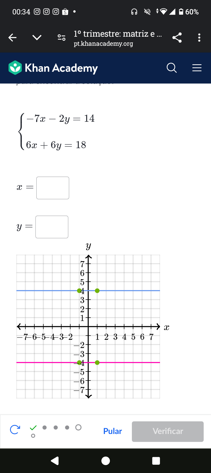 00:34 O S 60% 1° trimestre: matriz e V pt.khanacademy.org Khan Academy - 7x - 2y=14 6x by : 18 x = 7 6 5 4 3 2 1 1234567 2 3 4 5 6 7 C Pular Verificar