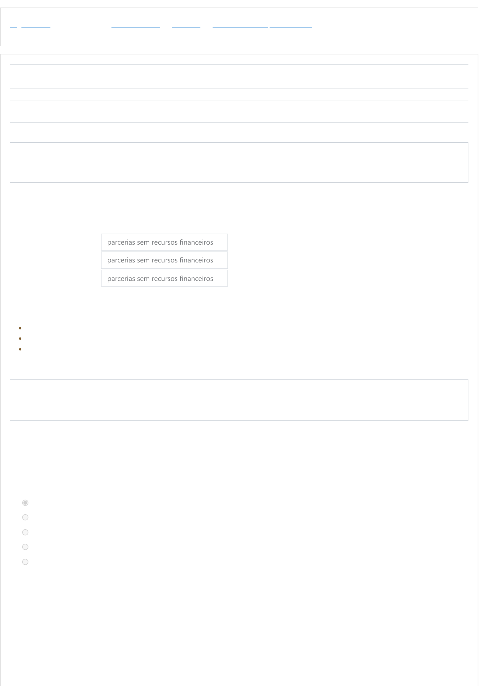 Página inicial / Meus cursos / MROSC-2024-1 / Módulo I / Exercícios de Fixação - Módulo I Iniciado em quarta, 10 jul 2024, 08:46 Estado Finalizada Concluída em quarta, 10 jul 2024, 08:46 Tempo empregado 31 segundos Avaliar 43,33 de um máximo de 100,00 Questão 1 Parcialmente correto Atingiu 3,33 de 10,00 Questão 2 Incorreto Atingiu 0,00 de 10,00 Com a Lei 13.019/2014, passa a ser estabelecido um novo regime jurídico das parcerias entre a administração pública e as organizações por meio de novos instrumentos jurídicos. RELACIONE esses instrumentos jurídicos com as suas respectivas características. a. Termo de Fomento b. Termo de Colaboração c. Acordo de Cooperação parcerias sem recursos financeiros parcerias sem recursos financeiros parcerias sem recursos financeiros Resposta: a. Termo de Fomento -> parcerias com recursos financeiros b. Termo de Colaboração -> parcerias com recursos financeiros c. Acordo de Cooperação -> parcerias sem recursos financeiros Assinale a alternativa que incorreta. Para a análise da regularidade prevista no Decreto nº 7.592/2011, os ministérios e órgãos públicos deveriam observar eventuais falhas a partir dos de critérios na avaliação de quais instrumentos celebrados? Escolha uma opção: a. Omissão no dever de prestar contas; b. Descumprimento da Lei nº8.666; c. Desvio de finalidade na aplicação dos recursos transferidos; d. Danos ao erário público; e. Prática de outros atos lícitos na execução dos instrumentos celebrados. Resposta: letra “b”. Resposta: Descumprimento injustificado do objeto de convênios, contratos de repasse ou termos de parceria. Módulo I, Unidade 1. 10/07/2024, 08:46 Exercícios de Fixação - Módulo I https://saberes.senado.leg.br/mod/quiz/review.php?attempt=8440587&cmid=67361 1/4 https://saberes.senado.leg.br/ https://saberes.senado.leg.br/course/view.php?id=2611 https://saberes.senado.leg.br/course/view.php?id=2611#section-2 https://saberes.senado.leg.br/mod/quiz/view.php?id=67361 Questão 3 Correto Atingiu 10,00 de 10,00 Questão 4 Incorreto Atingiu 0,00 de 10,00 Saber o que são organizações da sociedade civil (OSCs) é essencial ao trabalho das comunidades terapêuticas (CTs) porque as CTs são um tipo de OSC que têm contribuído com a sociedade brasileira. Com esse conhecimento indenitário, as CTs podem navegar de forma mais eficiente com a agenda política do Estado brasileiro (União, Estados, Municípios e Distrito Federal). Diante do exposto julgue a afirmativa como VERDADEIRO ou FALSO. Escolha uma opção: Verdadeiro Falso Resposta: Verdadeiro. As organizações da sociedade civil são entidades privadas sem fins lucrativos, ou seja, que desenvolvem ações de interesse público e não têm o lucro como objetivo. Tais organizações atuam na promoção e defesa de direitos e em atividades nas áreas de direitos humanos, saúde, educação, cultura, ciência e tecnologia, desenvolvimento agrário, assistência social, moradia, entre outras. Módulo I, Unidade 3. Quais mudanças estabelecidas pelo Decreto nº 7.568/2011 contribuíram para o aprimoramento das parcerias no governo federal? Escolha uma ou mais: a. Chamamento público; b. Sustentabilidade e certificação; c. Apresentação de diagnóstico; d. Tempo mínimo de três anos de existência e experiência prévia das organizações. Resposta: letras “a” e “d”. No mesmo decreto que instituiu o GTI, foram estabelecidas regras que contribuíram para o aprimoramento das parcerias no governo federal, como a exigência de chamamento público e o tempo mínimo de três anos de existência e experiência prévia das organizações. Módulo I, Unidade 1. 10/07/2024, 08:46 Exercícios de Fixação - Módulo I https://saberes.senado.leg.br/mod/quiz/review.php?attempt=8440587&cmid=67361 2/4 Questão 5 Correto Atingiu 10,00 de 10,00 Questão 6 Incorreto Atingiu 0,00 de 10,00 Questão 7 Incorreto Atingiu 0,00 de 10,00 Julgue a afirmativa abaixo como VERDADEIRO ou FALSO. Saber o que as organizações da sociedade civil (OSCs) têm feito é vital ao trabalho das comunidades terapêuticas (CTs) porque as CTs são um tipo de OSC que têm contribuído com a sociedade brasileira. Com esse conhecimento indenitário, as CTs podem navegar de forma mais eficiente com a agenda política do Estado brasileiro (União, Estados, Municípios e Distrito Federal). Escolha uma opção: Verdadeiro Falso Resposta: Verdadeiro. Do ponto de vista da incidência no ciclo das políticas públicas, as OSCs têm assumido diferentes papéis: sua presença pode ser observada tanto na etapa de formulação da política, por meio da participação em conselhos, comissões, comitês, conferências e compartilhamento de experiências de tecnologias sociais inovadoras; quanto na sua execução, por meio de parcerias com o poder público; além do monitoramento e avaliação, no exercício do controle social. Módulo I, Unidade 3. Conhecer o que é um marco regulatório é essencial para quem trabalha/vive a realidade das comunidades terapêuticas (CTs) aqui no Brasil, pois as CTs são organizações da sociedade civil (OSCs). Sabendo disso, julgue a afirmativa como VERDADEIRO ou FALSO. Escolha uma opção: Verdadeiro Falso Resposta: Verdadeiro. O Marco Regulatório das Organizações da Sociedade Civil (MROSC) é uma agenda política ampla, que tem como desafio aperfeiçoar o ambiente jurídico e institucional relacionado às organizações da sociedade civil (OSCs) e suas relações de parceria com o Estado. Módulo I, Unidade 1 Julgue o trecho abaixo com VERDADEIRO ou FALSO: A Lei 13.019/2014 visa promover a facilitação de acesso a recursos públicos à uma parcela da sociedade civil. Escolha uma opção: Verdadeiro Falso Resposta: Falso. A Lei 13.019/2014 visa promover regras mais claras, razoáveis e indutoras da colaboração para a promoção da igualdade de oportunidades no acesso aos recursos públicos, maior efetividade na execução e celeridade 