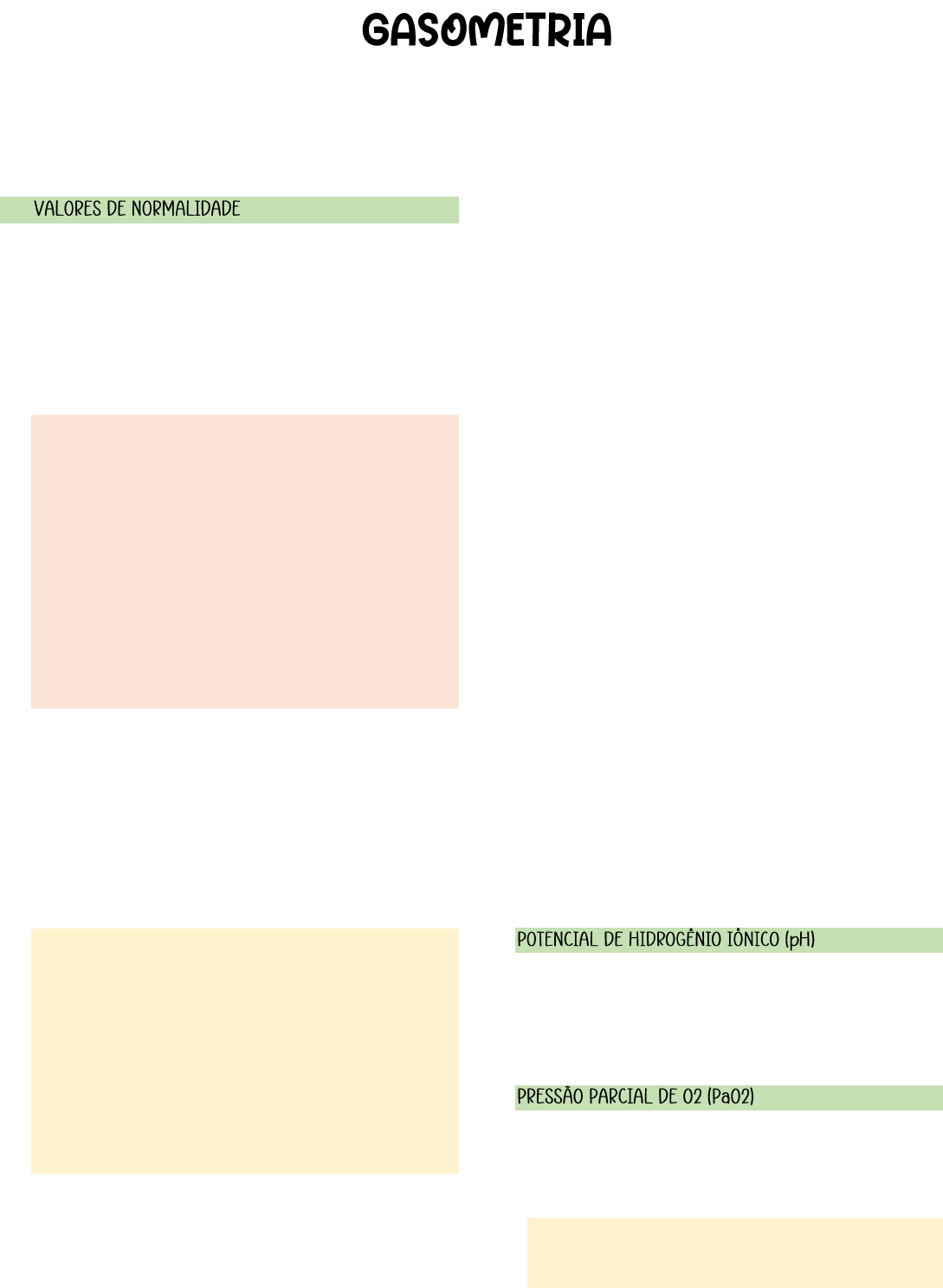 → Privativo do enfermeiro → → pH= 7,35- 7,45 → PaCO2= 35- 45 → HCO3= 22- 26 → PaO2= 80- 100 → BE= -2 a +2 ACIDEMIA= pH PaCO2= Acidose Respiratória HCO3= Acidose Metabólica ALCALEMIA= pH PaCO2= Alcalose Respiratória HCO3= Alcalose Metabólica ATENÇÃO!! HEPARINA Solução ácida (pode interferir) LACTATO: MARCADOR DE PERFUSÃO TECIDUAL Em situações em que há a diminuição de O2 no sangue, ocorre a distribuição da periferia/ outros órgãos para o cérebro e coração. A célula passa a produzir oxigênio por meio de metabolismo anaeróbico (ausência de O2) na qual o produto final é o ácido lático (lactato) AVALIAÇÃO DOS ESTADO ACIDOBÁSICO → Fornecer dados sobre a função respiratória e sobre as condições de perfusão tecidual → O resfriamento da amostra aumenta o pH e a SpO2 e diminui a PaO2 → A presença de leucocitose e grande número de plaquetas reduzirá o valor do pO2, dando falsa impressão de hipoxemia GASOMETRIA VENOSA → Não permite a análise da função respiratória e sua colheita está sujeita a erros → Para função metabólica pode ser utilizada- valores de HCO3 não difere da arterial → Fins científicos: deve ser colhida na artéria pulmonar onde o sangue venoso é misto ATENÇÃO!! pO2 venosa comparada com a pO2 arterial dá ideia do débito cardíaco → diferença arteriovenosa grande com pO2 venosa baixa indica DC → diferença arteriovenosa pequena com aumento da pO2 venosa indica um “shunt” sistêmico indicando agravamento das trocas teciduais → Controle do estado ácido ou alcalino → Indicação da pressão de O2 dissolvido no plama arterial (não no tecido) → Reflete na troca gasosa Aumento PaO2= hiperventilação (CO2) Diminuição PaO2= hipoventilação (CO2) → Indica a pressão de CO2, dissolvida no plasma arterial → Componente respiratório (troca gasosa) Aumento PaCO2= (hipercapnia) está associada e hipoventilação (retenção de CO2) Diminuição PaCO2=(hipocapnia) está associada a hiperventilação (eliminação excessiva de CO2) → Reflete função renal → Componente metabólico → Ion bicarbonato → Aumento do pH → Excesso ou déficit de bases dissolvidos no plasma → Comprova a acidose ou alcalose Valor negativo= déficit de base (acidose metabólica) Valor positivo= excesso de base (alcalose metabólica) Distúrbio pH PaCO2 HCO3 Acidose Respiratória Baixo Acima de 45 Normal ou alto (compens) Acidose Metabólica Baixo Normal ou baixa (compens) Abaixo de 22 Alcalose Metabólica Alto Normal ou alta (compens) Acima de 26 Alcalose Respiratória Alto Abaixo de 35 Normal ou abaixo de 22 ACIDOSE METABÓLICA Ganho de íons H+ ou perda de bicarbonato; → Cetoacidose diabética → Excesso de álcool/ aspirina → Acidose lática → Perda de bicarbonato ACIDOSE RESPIRATÓRIA Excreção inadequada de CO2 → DPOC, asma grave, pneumonia ou EAP → Distúrbios respiratórios do sono → Distúrbios de nervos ou músculos do tórax → Superdosagem de opioides ou sedativos ALCALOSE METABÓLICA Ganho de bicarbonato ou perda de H+ → Ingestão de antiácidos contendo bicarbonato → Hiperalimentação parenteral contendo bicarbonato → Perda excessiva de ácidos: vômitos, hipocalemia, terapia com diuréticos ATENÇÃO!!!! Alcalose Metabólica gerando Hipocalemia: Com a baixa de H+ na corrente sanguínea, os íons H+ dentro da célula vão para a corrente sanguínea e o potássio (K+) vai para a célula, diminuindo sua concentração na corrente sanguínea ALCALOSE RESPIRATÓRIA Eliminação excessiva de CO2 (hiperventilação) → Excitação do SNC → Hipoxia → Febre → Sepse → Choque → Hipertireoidismo MECANISMOS COMPENSATÓRIOS → Pacientes hipoventilando (CO2) → Rim aumenta a base (absorve HCO3) e libera H+ através da hiperventilação ALCALOSE METABÓLICA → Paciente hiperventilando (CO2) → Rim excreta HCO3 e retem H+ através da hipoventilação ACIDOSE METABÓLICA → Perda excessiva de HCO3 pelos rins e ganho de H+ (CAD, PCR, choque) → Pulmão hiperventila para diminuir CO2 e H+ ALCALOSE RESPIRATÓRIA → Através dos rins terá um ganho excessivo de HCO3 ou perda de H+ → Pulmões hipoventilam (CO2) ACIDOSE RESPIRATÓRIA NÃO COMPENSADO: → pH anormal e PaCO2 ou HCO3 normal EM COMPENSAÇÃO: → pH, PaCO2 e HCO3 anormais COMPENSADO: → pH normal e PaCO2/ HCO3 anormais cvc