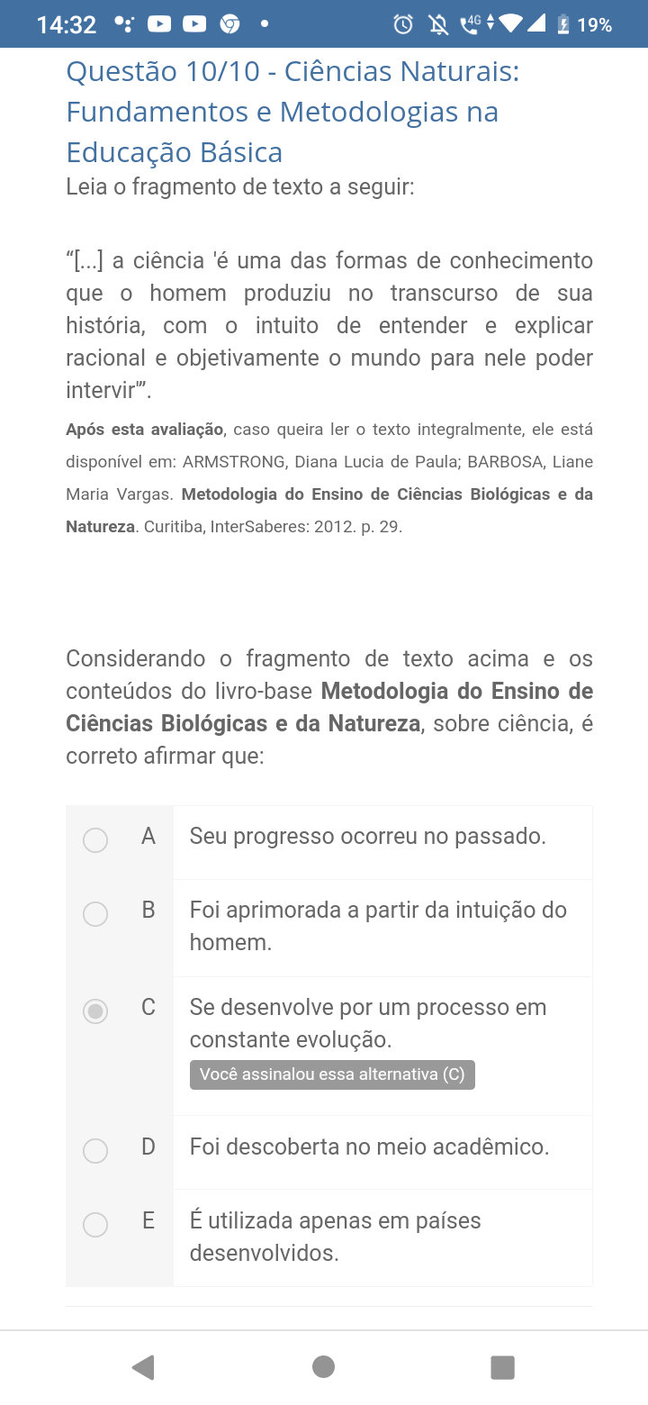 14:32 19% Questão 10/10 - Ciências Naturais: Fundamentos e Metodologias na Educação Básica Leia o fragmento de texto a seguir: "[...] a ciência 'é uma das formas de conhecimento que o homem produziu no transcurso de sua história, com o intuito de entender e explicar racional e objetivamente o mundo para nele poder intervir". Após esta avaliação, caso queira len texto integralmente, ele está disponível em: ARMSTRONG, Diana Lucia de Paula; BARBOSA, Liane Maria Vargas. Metodologia do Ensino de Ciências Biológicas e da Natureza. Curitiba, InterSaberes: 2012. p. 29. Considerando o fragmento de texto acima e os conteúdos do livro-base Metodologia do Ensino de Ciências Biológicas e da Natureza, sobre ciência, é correto afirmar que: A Seu progresso ocorreu no passado. B Foi aprimorada a partir da intuição do homem. C Se desenvolve por um processo em constante evolução. Você assinalou essa alternativa D Foi descoberta no meio acadêmico. E É utilizada apenas em países desenvolvidos.