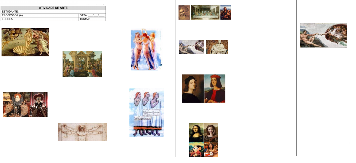 TEMA: ARTE RENASCENTISTA O Renascimento foi um movimento científico- cultural ocorrido, inicialmente na Itália e difundido pela Europa aproximadamente entre os anos de 1300 e 1650 marcando a transição da Idade Média para a Idade Moderna. No Renascimento, os artistas passaram a ser reconhecidos, assinavam suas obras, tornando-se famosos. Por sua característica humanista, o Renascimento trouxe a glorificação do homem e da natureza humana, em contraposição ao divino e ao sobrenatural. APROFUNDANDO-SE Chamou-se Renascimento em virtude da intensa revalorização das referências da Antiguidade Clássica, que nortearam um progressivo abrandamento da influência do dogmatismo religioso e do misticismo sobre a cultura e a sociedade, com uma concomitante e crescente valorização da racionalidade, da ciência e da natureza. Neste processo o ser humano foi revestido de uma nova dignidade e colocado no centro da Criação, e por isso deu-se à principal corrente de pensamento deste período o nome de humanismo. Fonte do trecho acima: Wikipédia O Renascimento surgiu na Itália graças à prosperidade das cidades de Veneza, Gênova, Florença, Roma com o desenvolvimento do comércio no Mediterrâneo. Surgiu uma rica burguesia mercantil que procurava ser o centro da nova sociedade e se transformava em "mecena", protetora da arte. O Mecenato foi uma espécie de patrocínio aos artistas. O RENASCIMENTO ARTÍSTICO (Fonte do trecho abaixo: Site Toda Matéria) Representou uma das vertentes do período renascentista com a profusão de diversas obras. Lembre-se que o Renascimento foi um movimento artístico, intelectual e cultural que teve início no século XV na Itália. Foi com o declínio do sistema feudal e de diversas caraterísticas associadas ao período medieval, que surgiu a Renascença, um período de efervescência cultural, artística e científica que se espalhou pela Europa. “O Humanismo foi a razão do Renascimento” IMPORTANTE DESTACAR: O pensamento predominante do Renascimento é o Antropocentrismo, o homem no centro do universo. Na Idade Média predominava o pensamento do Teocentrismo, Deus no centro do universo. OUTRAS CARACTERÍSTICAS: Racionalismo – a razão é o único caminho para se chegar ao conhecimento. Individualismo - artistas com um estilo pessoal, diferente dos demais, já que o período é marcado pelo ideal de liberdade. OBSERVE: No Renascimento, destacam-se as diferenças individuais, cada moça tem suas próprias características, são graciosas e atraentes. Na Idade Média, as três moças são praticamente idênticas, postura rígida, louras, mão direita levantada, roupa uniformizada. PRINCIPAIS PINTORES DO RENASCIMENTO Leonardo Da Vinci Foi cientista, pintor, urbanista, entre outros, dominou várias áreas do conhecimento científico. Suas pinturas que ficaram famosas, Mona lisa, A Última Ceia. Michelangelo Foi um genial artista, na escultura teve influência na escultura grega, pintou com muita genialidade o teto da capela Sistina da Criação do homem ao julgamento final. Rafael Santio É considerado o pintor que mais desenvolveu, na Renascença os ideais de beleza: Harmonia e regularidade de formas e cores. Tornou-se conhecido pintor das figuras de Maria e Jesus. CONCLUSÃO O Renascimento foi uma época importante para afirmação do artista como criador individual da obra de arte. ATIVIDADE SOBRE O QUE VOCÊ APRENDEU 1. Qual o país que foi o berço do Renascimento cultural? a) Inglaterra b) Portugal c) Itália d) Espanha 2. A característica que NÃO faz parte do pensamento renascentista é: a) Deus no centro do universo - Teocentrismo b) Razão no lugar da Fé – Racionalismo c) Valorização do talento e trabalho individual – Individualismo d) Valorização do homem - Humanismo 3. Por que no Renascimento os artistas começaram a ficar famosos? _______________________________________ _______________________________________ _______________________________________ _______________________________________ 4. Pintor, arquiteto, escultor, físico, engenheiro, entre outros. É autor, entre outras obras, da Mona Lisa e A Última Ceia. Quem é? a) Sandro Botticelli b) Galileu Galilei c) Leonardo da Vinci d) Michelangelo 5. Que movimento contribuiu para o surgimento do Renascimento? _______________________________________ _______________________________________ _______________________________________ _______________________________________ 6. Defina com suas palavras os seguintes pensamentos: a) Antropocentrismo: _______________________________________ _______________________________________ _______________________________________ _______________________________________ b) Teocentrismo: _______________________________________ _______________________________________ _______________________________________ _______________________________________ 7. Quem é o autor da obra abaixo? a) Michelangelo b) Rafael Santio c) Leonardo Da Vinci d) Galileu Galilei . 8. Qual o período é marcado pelo ideal de liberdade? _______________________________________ _______________________________________ _______________________________________ _______________________________________ 9. O que mais foi glorificado na Arte Renascentista? _______________________________________ _______________________________________ _______________________________________ _______________________________________ 10. Uma característica da pintura renascentista é fazer a obra se aproximar da imagem real. Observe a imagem abaixo: Faça uma releitura de uma obra famosa e apresente aos seus colegas e professor. Boa sorte!