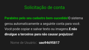 Solicitação de conta pelo seu cadastro bem-sucedido!O sistema gerou automaticamente a seguinte conta para você. Você pode copiar e salvar texto ou imagens.E não divulgue a terceiros para não causar prejuízos! Nome de Usuário: uao94695817