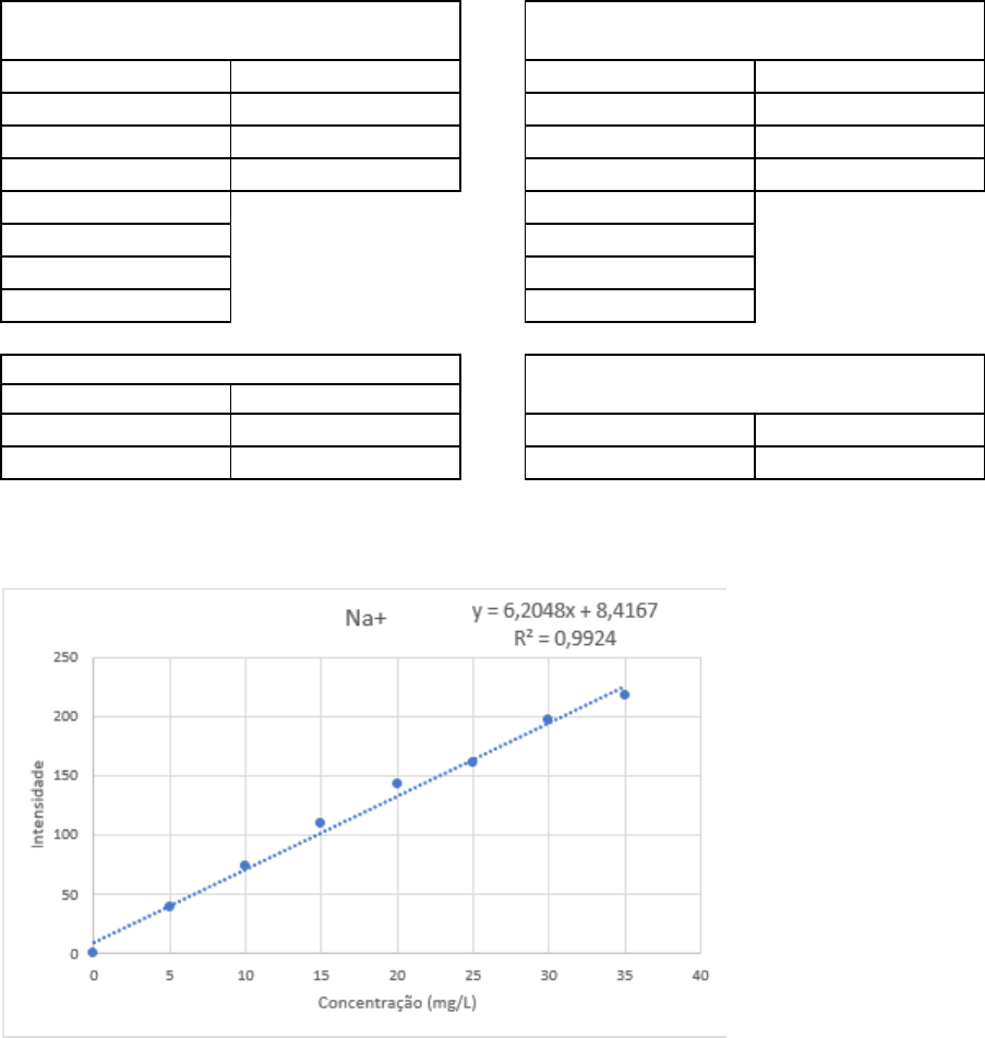 FICHA DE RELATÓRIO (EXP5) FOTOMETRIA DE EMISSÃO ATÔMICA EM CHAMA Determinação de sódio e potássio em bebida isotônica Alunos: Arthur Alves Nascimento (190084545) NOTA________ Pedro Henrique Vieira da Silva (190018933) Lucas de Barros Pereira (211017235) Data do experimento: 01/04/24 Sinais analíticos para determinação de sódio Sinais analíticos para determinação de potássio Padrões Amostras Padrões Amostras 38 131 1,3 5,3 73 133 2,4 5,4 109 133 3,7 5,2 142 5,6 161 6,3 196 8,4 217 9,4 Informações do rótulo Volumes tomados para preparo das amostras diluídas (mL) Porção (mL) 500 Na (mg) 269 Na 1,859 K (mg) 71 K 0,4226 1) Construa e apresente os gráficos das curvas analíticas com as equações das retas (inclinação e intercepto) obtidas a partir do método dos mínimos quadrados. Apresente também os coeficientes de determinação (R2). Gráfico 1: Curva analítica dos padrões para o analito Na+ Gráfico 2: Curva analítica dos padrões para o analito K+ 2) Para apenas uma das réplicas da amostra, demonstre os cálculos usados para determinar a concentração de Na ou K (memória do cálculo). Depois, apresente os resultados obtidos para as demais réplicas. Lembre-se de reportar a resposta de acordo com a unidade do valor de referência (rótulo). Para encontrar a concentração de K+ foi feita uma curva analítica através de uma solução padrão de K+ ( 150 mg/L),como visto no Gráfico 2. Posteriormente, um cálculo do volume necessário de isotônico para que a concentração de K+ esteja localizada no ponto médio das concentrações do padrão foi feita a partir da Equação 1 (tomando em relação ao valor da quantidade de K+ no rótulo), em que Vadc é o volume calculado para o preparo da solução para a analise, Cdil é a concentração desejada (1,2mg/L), mK a massa de K+ presente no rótulo e Vrotulo é o volume descrito no rótulo Gráfico 2: Curva analítica dos padrões para o analito K+ Dessa forma o foi obtido um volume de foi 0,422 mL. Que foi usado para medir a intensidade dessa solução e a calcular a concentração real da amostra pela equação de reta obtida pelos padrões. Assumindo (Equação 2) onde a= -0,15, b= 4,5595, y= intensidade emitida pelo analito e x= concentração da amostra. A primeira amostra do isotônico teve intensidade emitida de y= 5,3. Ao isolarmos o x obtemos: Ao trocarmos os valores temos: Ao resolver a equação obtemos que a concentração(x) da amostra 1 é x= 1,1953mg/L. Para o calculo da quantidade de K+ presente no isotonico foi preciso voltar a diluição feita, como mostra na Equação 3 Resultando assim em 70,72 mg de K+ Para gerar mediadas estatísticas o experimento foi realizado em triplicata e o cálculo da incerteza combinada (Equação 4) foi usado para determinar o intervalo de confiança, (assumindo t 2,571) Portanto obtendo assim um um intervalo de 70,7219±7,729 mg de K em 500 ml de isotônico 3) Sem demonstrar os cálculos, apresente uma tabela com a concentração média de sódio e potássio na amostra diluída, em mg/L, o desvio padrão dos resíduos de cada curva analítica, as incertezas obtidas pela curva analítica, a massa média de sódio e potássio na porção atestada no rótulo da bebida isotônica, em mg, o desvio padrão combinado sobre a massa das duas espécies na bebida isotônica considerando a propagação de incertezas, o coeficiente de variação, o intervalo de confiança a 95% de significância (bicaudal). Para todos estes parâmetros apresente os valores com, ao menos, 4 algarismos significativos. Na K Concentração média (mg/L) 19,97 1,196 Desv pad da concentração 0,1861 0,02193 Incerteza da reta 0,7706 0,04581 Massa média (mg) 268,6 70,72 Desv pad massa 2,449 0,1666 CV (%) 0,9116 0,4080 IC 268,6±27,42 70,72±7,729 4) Apresente a expressão correta dos resultados finais (número de algarismos significativos em função da incerteza). Na K Massa obtida (Intervalo de confiança) 268,6±27,42 70,72±7,729 5) Considere a massa de Na e K atestada no rótulo e compare seu resultado por meio de um teste t de Student apropriado. Para fins de tcal e ttab, considere os graus de liberdade restantes dos dados bivariados (curva analítica). Teste t Na K tcal 0,418 tcal 2,55 tcrit 2,57 tcrit 2,57 GL 5 GL 5 tcalc< tcrit, logo Ho é aceita e os dois valores são iguais estatisticamente a um nivel de confiança de 95% 6) Como é realizada a seleção do comprimento de onda no fotômetro de chama utilizado? Para isolar a linha de interesse do espectro emitido pela chama, são utilizados filtros de interferência. Esses filtros são dispositivos ópticos que permitem passar apenas a luz em um comprimento de onda específico, bloqueando todas as outras faixas de comprimento de onda. No caso da fotometria de chama, esses filtros são projetados para selecionar o comprimento de onda correspondente à linha espectral do elemento que está sendo analisado. 7) Por que a fotometria de chama é bastante utilizada para a determinação de elementos das famílias IA e IIA da tabela periódica, mas raramente empregada para outros elementos? A fotometria de chama é amplamente usada para elementos das famílias IA e IIA devido à baixa temperatura da chama de GLP/Ar, ideal para sua excitação sem ionização excessiva. Elementos alcalinos e alcalino-terrosos são facilmente ionizáveis e têm linhas espectrais distintas, simplificando a análise. Além disso, a técnica é simples e acessível. No entanto, para outros elementos, com pontos de fusão mais altos, a fotometria de chama pode não ser tão eficaz, exigindo técnicas mais sensíveis. 8) Discuta sobre as funções da chama neste experimento. A chama desempenha um papel multifuncional fundamental no experimento de análise. Além de aumentar a eficiência da atomização, ela é responsável pela dessolvatação da amostra, evaporando solventes e queimando materiais orgânicos. Durante a atomização, a amostra é transformada de mol