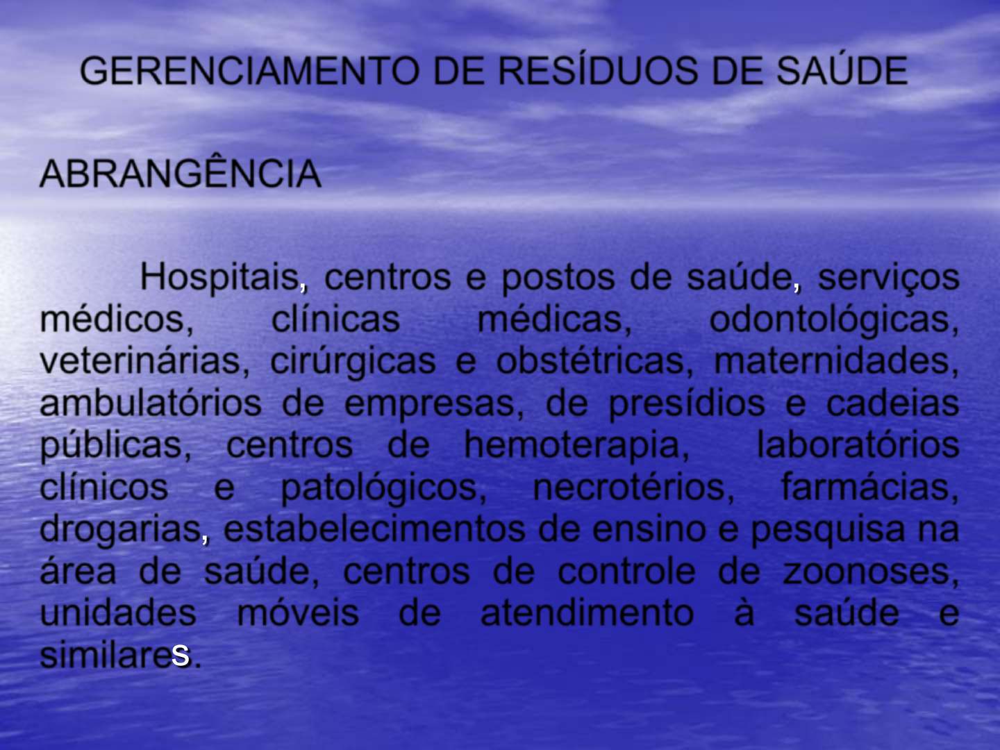 GERENCIAMENTO DE RESÍDUOS DE SAÚDE ABRANGÊNCIA Hospitais, centros e postos de saúde, serviços médicos, clínicas médicas, odontológicas, veterinárias, cirúrgicas e obstétricas, maternidades, ambulatórios de empresas, de presídios e cadeias públicas, centros de hemoterapia, laboratórios clínicos e patológicos, necrotérios, farmácias, drogarias, estabelecimentos de ensino e pesquisa na área de saúde, centros de controle de zoonoses, unidades móveis de atendimento à saúde e similares. ASPECTOS GERAIS E ORGANIZACIONAIS DO GERENCIAMENTO DE RSS. COMPETÊNCIAS DO GERENCIAMENTO Resolução do CONAMA – agosto de 1993: Compete ao estabelecimento de saúde, desde a etapa de geração até a disposição final. O gerenciamento dos RSS envolve duas fases: Intra-estabelecimento de saúde: iniciada com a geração dos RSS. Extra-estabelecimento de saúde: terminando com a disposição final. Gerenciamento de resíduos de serviço de saúde RSS Do volume gerado: 80% - podem ser equiparados aos resíduos domiciliares; 15% - patológico e potencialmente infectantes; 1% - perfuro cortantes; 3% - químicos e farmacêuticos; 1% - diversos – radioativo, citostático, Hg, baterias. Risco Mecânico Gerenciamento de resíduos de serviço de saúde – RSS RDC ANVISA 306/2004 RESOLUÇÃO CONAMA 358/2005 Aspectos Técnicos, Legais e Operacionais Gerenciamento de Resíduos de Serviço de Saúde – RSS COPAM – Conselho Estadual de Política Ambiental Deliberação Normativa COPAM nº 97, de 12 de Abril de 2006. Estabelecimentos de Saúde de Municípios com mais de 50.000 habitantes: • Adequação até 31 de dezembro de 2006. • Demais municípios: adequação até 04 de maio de 2007. ASPECTOS TÉCNICOS E OPERACIONAIS DO GERENCIAMENTO DE RESÍDUOS DE SERVIÇOS DE SAÚDE FLUXOGRAMA: FASE INTRA-ESTABELECIMENTO DE SAÚDE MINIMIZAÇÃO DA GERAÇÃO CLASSIFICAÇÃO SEGREGAÇÃO (TRATAMENTO PRÉVIO) ACONDICIONAMENTO (ARMAZENAMENTO INTERMEDIÁRIO) COLETA E TRANSPORTE INTERNOS ARMAZENAMENTO FINAL FLUXOGRAMA: FASE EXTRA-ESTABELECIMENTO DE SAÚDE COLETA E TRANSPORTE EXTERNOS TRANSBORDO TRATAMENTO DISPOSIÇÃO FINAL RESÍDUOS TRATADOS FASE INTRA-ESTABELECIMENTO DE SAÚDE 1. MINIMIZAÇÃO DA GERAÇÃO A minimização de RSS pode ser efetivada pela adoção de práticas que visem à redução, à reutilização, à recuperação ou à reciclagem dos RSS. FASE INTRA-ESTABELECIMENTO DE SAÚDE 1.1. MINIMIZAÇÃO – Objetivos principais Reduzir a geração de RSS e de custos de processamento. Incentivar a adoção de processos redutores da geração de resíduos químicos perigosos. Proporcionar a recuperação dos componentes recicláveis gerados nos serviços de saúde. FASE INTRA-ESTABELECIMENTO DE SAÚDE 1.1. MINIMIZAÇÃO – Objetivos principais Possibilitar a coleta seletiva de componentes inertes recicláveis de resíduos comuns. Permitir a formação de uma “bolsa de resíduos” para doação. FASE INTRA-ESTABELECIMENTO DE SAÚDE 2. CLASSIFICAÇÃO Consiste no agrupamento das classes de resíduos, em função dos riscos potenciais à saude e ao meio ambiente, para que tenham gerenciamento adequado. FASE INTRA-ESTABELECIMENTO DE SAÚDE 2.1 CLASSIFICAÇÃO – Objetivos principais: Conhecer as atividades desenvolvidas no estabelecimento de saúde e os resíduos nele gerados. Identificar o RSS gerado em cada local do estabelecimento de saúde. Possibilitar a implementação da segregação na origem visando aos processos e às instalações disponíveis para tratamento e as vias possíveis de minimização. CLASSIFICAÇÃO DOS RSS GRUPO A – RESÍDUO BIOLÓGICO Resíduos com a possível presença de agentes biológicos que, por suas características de maior virulência ou concentração, podem apresentar risco de infecção. CLASSIFICAÇÃO DOS RSS GRUPO B – RESÍDUO QUÍMICO Resíduo contendo substâncias químicas que podem apresentar risco à saúde pública ou ao meio ambiente, dependendo de suas características de inflamabilidade, corrosividade e toxicidade. CLASSIFICAÇÃO DOS RSS GRUPO C – REJEITO RADIOATIVO Quaisquer materiais resultantes de atividades humanas que contenham radionuclídeos em quantidades superiores aos limites de isenção especificados nas normas do CNEN e para os quais a reutilização é imprópria ou não prevista. CLASSIFICAÇÃO DOS RSS GRUPO D – RESÍDUO COMUM Resíduo comum, todos aqueles que não se enquadram nos tipos A, B, C e que, por sua semelhança aos resíduos domésticos, não oferecem risco adicional à saúde pública. CLASSIFICAÇÃO DOS RSS GRUPO E Materiais perfurocortantes ou escarificantes, tais como: lâmina de barbear, agulhas, escalpes, ampolas de vidro, brocas, limas endodônticas, pontas diamantadas, lâminas de bisturi, lancetas; tubos capilares; micropipetas; lâminas e lamínulas; espátulas e todos os utensílios de vidro quebrados no laboratório (pipetas, tubos de coleta sanguínea e placas de Petri) e outros similares. 3. SEGREGAÇÃO A segregação consiste na separação ou seleção apropriada dos resíduos de serviços de saúde, na unidade geradora, segundo a classificação adotada. 3.1 SEGREGAÇÃO – Objetivos principais Impedir que os resíduos infectantes e químicos contaminem os resíduos comuns Racionalizar recursos e reduzir custos financeiros. Prevenir acidentes ocupacionais ocasionados pela inadequada segregação e acondicionamento dos resíduos e materiais perfurocortantes. Intensificar as medidas de segurança apenas onde forem necessárias e facilitar a ação simultânea de limpeza e descontaminação, em caso de acidentes ou emergências. Possibilitar a reciclagem direta de alguns componentes inertes de resíduos comuns. 4. TRATAMENTO PRÉVIO Consiste na descontaminação, desinfecção ou esterilização de RSS na origem, para converter resíduo infectante em comum ou minimizar a periculosidade e toxicidade de resíduo químico. 4.1 TRATAMENTO PRÉVIO – Objetivos principais Descontaminar, desinfe