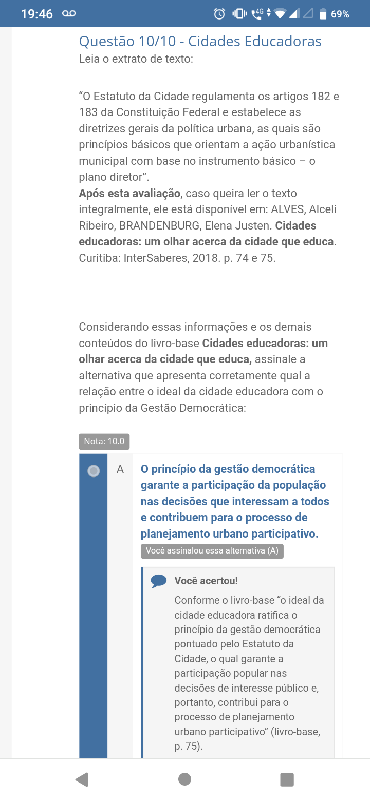 19:46 69% Questão 10/10 - Cidades Educadoras Leia o extrato de texto: "O Estatuto da Cidade regulamenta os artigos 182 e 183 da Constituição Federal e estabelece as diretrizes gerais da política urbana, as quais são princípios básicos que orientam a ação urbanística municipal com base no instrumento básico - o plano diretor". Após esta avaliação, caso queira ler o texto integralmente, ele está disponível em: ALVES, Alceli Ribeiro, BRANDENBURG, Elena Justen. Cidades educadoras: um olhar acerca da cidade que educa. Curitiba: InterSaberes, 2018. p. 74 e 75. Considerando essas informações e os demais conteúdos do livro-base Cidades educadoras: um olhar acerca da cidade que educa, assinale a alternativa que apresenta corretamente qual a relação entre o ideal da cidade educadora com o princípio da Gestão Democrática: Nota: 10.0 A o princípio da gestão democrática garante a participação da população nas decisões que interessam a todos e contribuem para processo de planejamento urbano participativo. Você assinalou essa alternativa (A) Você acertou! Conforme o livro-base "o ideal da cidade educadora ratifica o princípio da gestão democrática pontuado pelo Estatuto da Cidade, o qual garante a participação popular nas decisões de interesse público e, portanto, contribui para o processo de planejamento urbano participativo" (livro-base, p. 75).
