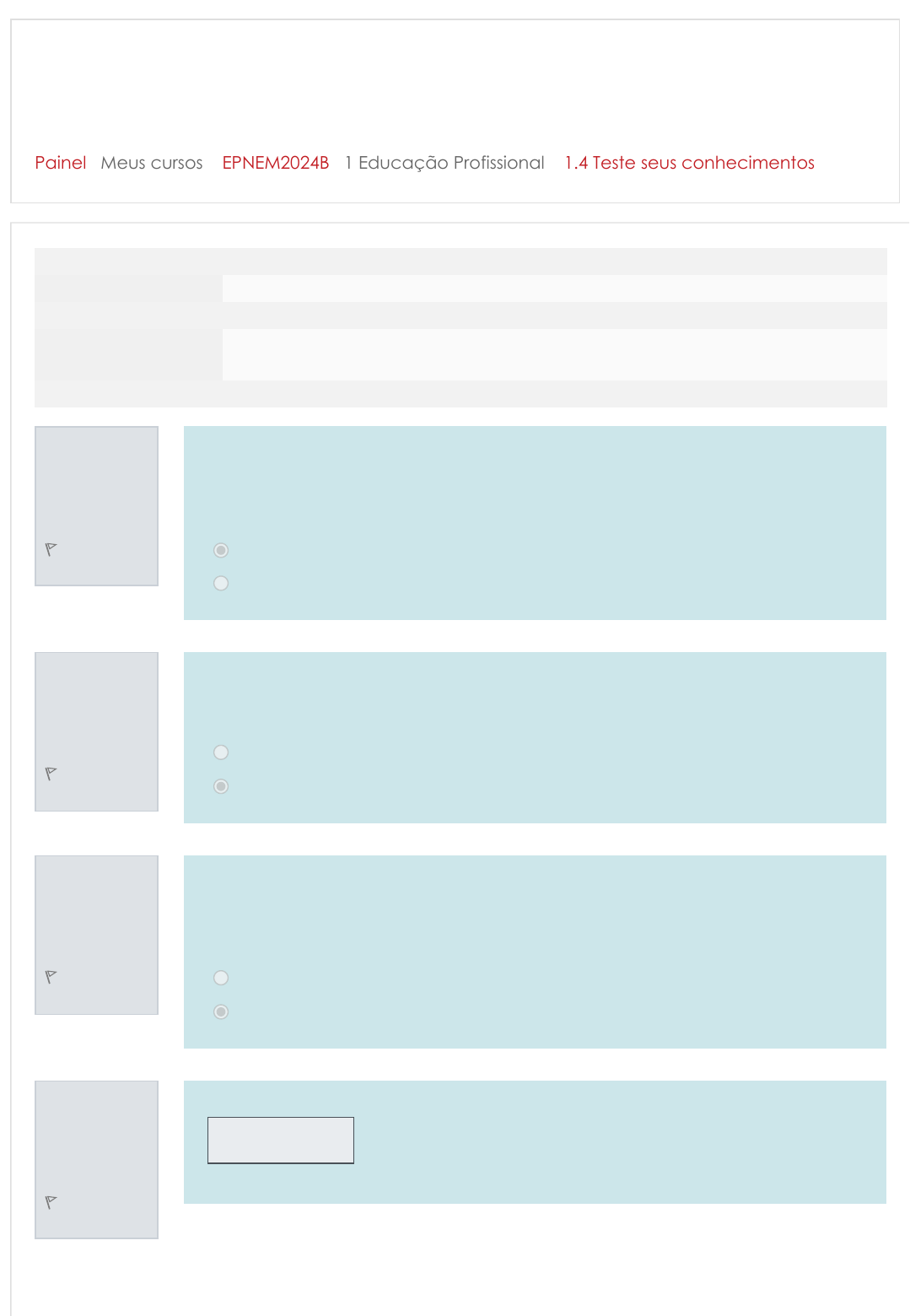 Painel Meus cursos EPNEM2024B 1 Educação Profissional 1.4 Teste seus conhecimentos Educação Profissional e o Novo Ensino Médio - Turma 2024B Questão 1 Correto Atingiu 1,00 de 1,00 Marcar questão Questão 2 Correto Atingiu 1,00 de 1,00 Marcar questão Questão 3 Incorreto Atingiu 0,00 de 1,00 Marcar questão Questão 4 Incorreto Atingiu 0,00 de 1,00 Marcar questão Iniciado em quarta, 10 jul 2024, 20:00 Estado Finalizada Concluída em quarta, 10 jul 2024, 20:09 Tempo empregado 8 minutos 58 segundos Avaliar 8,00 de um máximo de 10,00(80%) A educação profissional prevê a integração com a modalidade da educação de jovens e adultos. Escolha uma opção: Verdadeiro Falso A educação profissional é útil apenas para o setor industrial. Escolha uma opção: Verdadeiro Falso A modalidade concomitante costuma ser feita em duas instituições diferentes. Escolha uma opção: Verdadeiro Falso A educação profissional cumpre um papel muito importante na indústria , já que forma técnicos para áreas específicas. 10/07/2024, 20:09 1.4 Teste seus conhecimentos: Revisão da tentativa https://moodle.ifrs.edu.br/mod/quiz/review.php?attempt=16748055&cmid=428725 1/3 https://moodle.ifrs.edu.br/my/ https://moodle.ifrs.edu.br/course/view.php?id=8892 https://moodle.ifrs.edu.br/mod/quiz/view.php?id=428725 Questão 5 Correto Atingiu 1,00 de 1,00 Marcar questão Questão 6 Correto Atingiu 1,00 de 1,00 Marcar questão Questão 7 Correto Atingiu 1,00 de 1,00 Marcar questão Questão 8 Correto Atingiu 1,00 de 1,00 Marcar questão Questão 9 Correto Atingiu 1,00 de 1,00 A educação profissional possibilita a articulação da educação básica no nível do ensino médio, na forma articulada de oferta (integrada e concomitante) e na forma subsequente. Escolha uma opção: Verdadeiro Falso Qual é o objetivo da educação profissional? a. Formar apenas indivíduos para profissões em indústrias de alto nível, como engenharia aeroespacial. b. Formar apenas indivíduos para profissões acadêmicas, como professores e pesquisadores. c. Formar indivíduos para qualquer tipo de profissão, como eletricista, mecânico, engenheiro, etc. d. Proporcionar uma formação básica geral, sem foco em uma profissão específica. No Pronatec, o aluno faz o Ensino Médio em qualquer escola e, no contra turno, realizava os estudos relacionados ao ensino técnico em outra instituição. Escolha uma opção: Verdadeiro Falso O estudante pode cursar as unidades relacionadas à formação geral básica em uma escola de Ensino Médio regular e, na parte destinada aos itinerários, realizar cursos técnicos ou FICs em instituições parceiras, considerando as possibilidades de oferta das redes e os critérios para estabelecimentos dessas parcerias definidos pelos sistemas de ensino. Escolha uma opção: Verdadeiro Falso A educação profissional tem enfoque só em pesquisa, livros e conteúdos teóricos. 10/07/2024, 20:09 1.4 Teste seus conhecimentos: Revisão da tentativa https://moodle.ifrs.edu.br/mod/quiz/review.php?attempt=16748055&cmid=428725 2/3 Marcar questão Questão 10 Correto Atingiu 1,00 de 1,00 Marcar questão Escolha uma opção: Verdadeiro Falso Quais são as duas vertentes do Ensino Médio mencionadas no texto? a. A primeira alia a educação profissional com o Ensino Médio e a segunda é o Ensino Médio tradicional, com a formação geral. b. A primeira é o Ensino Médio para estudantes superdotados e a segunda é o Ensino Médio para estudantes com dificuldades de aprendizagem. c. A primeira é o Ensino Médio para estudantes de tempo integral e a segunda é o Ensino Médio para estudantes de meio período. d. A primeira é o Ensino Médio regular e a segunda é o Ensino Médio noturno. 10/07/2024, 20:09 1.4 Teste seus conhecimentos: Revisão da tentativa https://moodle.ifrs.edu.br/mod/quiz/review.php?attempt=16748055&cmid=428725 3/3