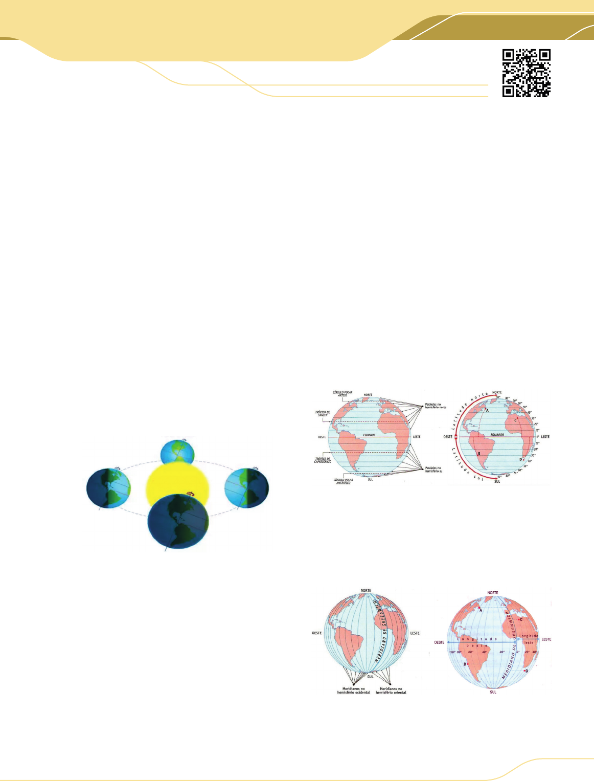 GEOGRAFIA II PRÉ-VESTIBULAR 295SISTEMA PRODÍGIO DE ENSINO CARTOGRAFIA: MOVIMENTOS, COORDENADAS E FUSOS14 MOVIMENTOS DA TERRA O movimento de rotação da Terra é o giro que o planeta realiza ao redor de si mesmo, ou seja, ao redor do seu próprio eixo. Esse movimento ocorre no sentido anti-horário, ou seja, de oeste para leste, e tem duração aproximada de 24 horas. Esse movimento faz com que, progressivamente, a luz solar ilumine diferentes áreas do planeta. Ou seja, a rotação é a responsável pela existência e alternâncias dos dias e das noites. Já o movimento de translação é aquele que a Terra realiza ao redor do Sol, junto com os outros planetas. Em seu movimento de translação, a Terra percorre um caminho (órbita) que tem a forma de uma elipse. O tempo necessário para uma translação completa é de 365 dias, 5 horas e cerca de 48 minutos. Esse tempo gasto para uma volta completa em torno do Sol é chamado de “ano”. O ano civil, adotado por convenção, tem 365 dias. Como o ano sideral, ou seja, o tempo real do movimento de translação é de 365 dias e 6 horas (aproximadamente), a cada quatro anos temos um ano de 366 dias, que é chamado de ano bissexto. Esse movimento de translação é o responsável pela existência das estações do ano, já que o sol incide de maneira diferente sobre a Terra ao longo do ano, influenciando diretamente nas temperaturas. As datas que marcam o início das estações do ano determinam também a maneira e a intensidade com que os raios solares atingem a Terra em seu movimento de translação. Essas datas recebem a denominação de equinócio e solstício. Para se observar onde e com que intensidade os raios solares incidem sobre os diferentes locais da superfície terrestre, toma-se como ponto de referência a Linha do Equador. Translação e estações do ano Março equinócio Setembro equinócio Junho solstício Dezembro solstício As estações do ano estão diretamente ligadas a diversas atividades humanas como a agricultura e a pecuária. Além disso, influenciam na dinâmica climato-botânica do mundo inteiro. É importante lembrar que, quando no hemisfério Norte é verão, no hemisfério Sul é inverno. Da mesma forma, quando é outono em um dos hemisférios, é primavera no outro. Isso ocorre justamente em função da inclinação do eixo terrestre, que faz com que a quantidade de irradiação solar recebida seja diferente em cada um dos hemisférios. • Solstício (21 de Junho) - Início de inverno e o dia mais curto no hemisfério Sul. Início de verão e o dia mais longo no hemisfério Norte. • Equinócio (23 de Setembro) - Início da primavera no hemisfério Sul. Início do outono no hemisfério Norte. Os dias e noites têm durações iguais nos hemisférios. • Solstício (21 de Dezembro) - Início de verão e o dia mais longo no hemisfério Sul. Início de inverno e o dia mais curto no hemisfério Norte. • Equinócio (20 de Março) - Início do outono no hemisfério Sul. Início da primavera no hemisfério Norte. Os dias e noites têm durações iguais nos hemisférios. COORDENADAS GEOGRÁFICAS São linhas imaginárias que passam pelo planeta Terra de norte a sul (ou sul a norte) e de leste a oeste (ou oeste a leste), servindo para a localização de qualquer ponto na superfície terrestre. As coordenadas geográficas são medidas em graus, minutos e segundos. Um grau corresponde a 60 minutos, e um minuto corresponde a 60 segundos. Para obter a coordenada geográfica (localização) de um ponto da superfície terrestre, é preciso saber qual é a latitude e qual é a longitude do local em questão. Latitude é a distância de um ponto qualquer em relação à linha do Equador. Varia de 0° (no Equador) até 90° (Polo Norte ou Polo Sul). Para ajudar a identificar latitudes, utilizamos linhas imaginárias chamadas de paralelos. Os paralelos mais famosos são a linha do Equador, os trópicos e os círculos polares. Além de servir para localização geográfica, é uma variável importante para estudar os tipos de clima da Terra, pois a incidência de raios solares no planeta é maior nos lugares com latitudes menores, isto é, mais próximas à linha do Equador. Longitude é a distância de um ponto qualquer em relação ao meridiano de Greenwich. Varia de 0° (em Greenwich) a 180° (para leste ou para oeste). Para ajudar a identificar longitudes, utilizamos linhas imaginárias chamadas de meridianos. Como padronização internacional, adotou-se o Meridiano de Greenwich como ponto de partida, a longitude de 0°. Assim, tal meridiano divide a Terra em Ocidental (a Oeste) e Oriental (a leste). Foi a partir das longitudes que se criaram os fusos horários. Todos os meridianos se encontram e se cruzam nos polos Norte e Sul. PRÉ-VESTIBULAR296 GEOGRAFIA II 14 CARTOGRAFIA: MOVIMENTOS, COORDENADAS E FUSOS SISTEMA PRODÍGIO DE ENSINO FUSOS HORÁRIOS Uma vez que a Terra faz um movimento de rotação, girando em torno de si mesma, o Sol não consegue iluminar todos os locais do mundo ao mesmo tempo. Por isso, enquanto em alguns locais é dia, em outros já é noite. Logo, não existe a possibilidade de usar o mesmo horário no planeta inteiro. Portanto, para estabelecer uma padronização dos horários do mundo foi criado um sistema, chamado de sistema de fusos horários. Para tal, foi feita uma conta simples: se a Terra possui uma circunferência de 360°; e se 24h é o tempo que o planeta demora para girar por completo em torno de si mesmo; a divisão desses dois números nos aponta que o planeta pode ser separado em 24 fusos de 15° cada. Foi determinado, portanto, que todos os locais situados dentro de um mesmo fuso teriam o mesmo horário. E que ao se deslocar de um fuso para outro, haveria uma mudança de 1h no relógio – uma hora a mais, caso o deslocamento fosse para leste; ou uma hora a menos, caso o deslocamento fosse para oeste. Contudo, uma vez que as linhas dos fusos não consideram as divisões polític
