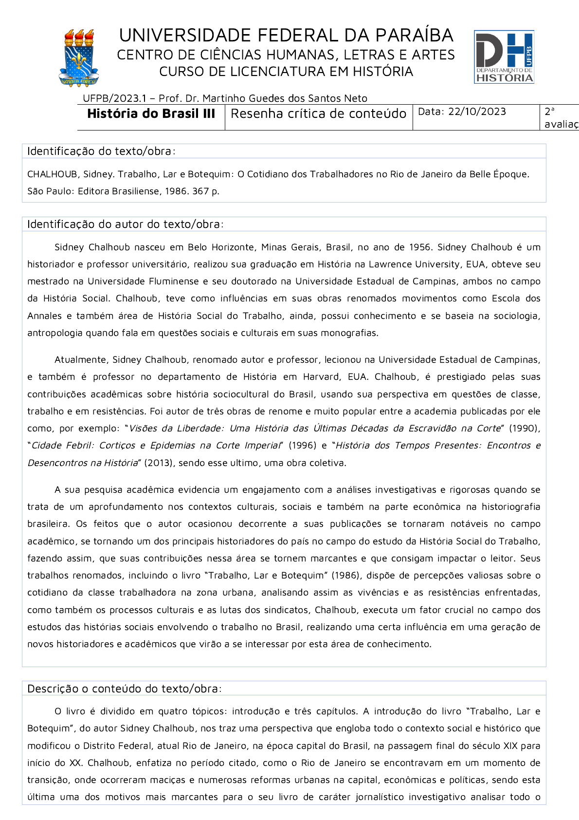 UNIVERSIDADE FEDERAL DA PARAÍBA CENTRO DE CIÊNCIAS HUMANAS, LETRAS E ARTES CURSO DE LICENCIATURA EM HISTÓRIA UFPB/2023.1 – Prof. Dr. Martinho Guedes dos Santos Neto História do Brasil III Resenha crítica de conteúdo Data: 22/10/2023 2ª avaliaç Identificação do texto/obra: CHALHOUB, Sidney. Trabalho, Lar e Botequim: O Cotidiano dos Trabalhadores no Rio de Janeiro da Belle Époque. São Paulo: Editora Brasiliense, 1986. 367 p. Identificação do autor do texto/obra: Sidney Chalhoub nasceu em Belo Horizonte, Minas Gerais, Brasil, no ano de 1956. Sidney Chalhoub é um historiador e professor universitário, realizou sua graduação em História na Lawrence University, EUA, obteve seu mestrado na Universidade Fluminense e seu doutorado na Universidade Estadual de Campinas, ambos no campo da História Social. Chalhoub, teve como influências em suas obras renomados movimentos como Escola dos Annales e também área de História Social do Trabalho, ainda, possui conhecimento e se baseia na sociologia, antropologia quando fala em questões sociais e culturais em suas monografias. Atualmente, Sidney Chalhoub, renomado autor e professor, lecionou na Universidade Estadual de Campinas, e também é professor no departamento de História em Harvard, EUA. Chalhoub, é prestigiado pelas suas contribuições acadêmicas sobre história sociocultural do Brasil, usando sua perspectiva em questões de classe, trabalho e em resistências. Foi autor de três obras de renome e muito popular entre a academia publicadas por ele como, por exemplo: “Visões da Liberdade: Uma História das Últimas Décadas da Escravidão na Corte” (1990), “Cidade Febril: Cortiços e Epidemias na Corte Imperial” (1996) e “História dos Tempos Presentes: Encontros e Desencontros na História” (2013), sendo esse ultimo, uma obra coletiva. A sua pesquisa acadêmica evidencia um engajamento com a análises investigativas e rigorosas quando se trata de um aprofundamento nos contextos culturais, sociais e também na parte econômica na historiografia brasileira. Os feitos que o autor ocasionou decorrente a suas publicações se tornaram notáveis no campo acadêmico, se tornando um dos principais historiadores do país no campo do estudo da História Social do Trabalho, fazendo assim, que suas contribuições nessa área se tornem marcantes e que consigam impactar o leitor. Seus trabalhos renomados, incluindo o livro “Trabalho, Lar e Botequim” (1986), dispõe de percepções valiosas sobre o cotidiano da classe trabalhadora na zona urbana, analisando assim as vivências e as resistências enfrentadas, como também os processos culturais e as lutas dos sindicatos, Chalhoub, executa um fator crucial no campo dos estudos das histórias sociais envolvendo o trabalho no Brasil, realizando uma certa influência em uma geração de novos historiadores e acadêmicos que virão a se interessar por esta área de conhecimento. Descrição o conteúdo do texto/obra: O livro é dividido em quatro tópicos: introdução e três capítulos. A introdução do livro “Trabalho, Lar e Botequim”, do autor Sidney Chalhoub, nos traz uma perspectiva que engloba todo o contexto social e histórico que modificou o Distrito Federal, atual Rio de Janeiro, na época capital do Brasil, na passagem final do século XIX para início do XX. Chalhoub, enfatiza no período citado, como o Rio de Janeiro se encontravam em um momento de transição, onde ocorreram maciças e numerosas reformas urbanas na capital, econômicas e políticas, sendo esta última uma dos motivos mais marcantes para o seu livro de caráter jornalístico investigativo analisar todo o processo de modificação da sociedade pobre como também das classes mais abastadas que ali predominava durante o período da Primeira República no Brasil. O autor consegue expor em sua introdução dando certa ênfase ao contexto da Belle Époque carioca, onde esse contexto trazia consigo incertezas e inseguranças, como também distinções no quesito social em que a capital estava inserida, um processo rápido de modernização tanto na urbanização como na industrialização ocasionou para a classe trabalhadora problemáticas como também reformulou o seu cotidiano. A estrutura temática que Sidney Chalhoub defende em sua tese está inserida em três pilares centrais no texto que vem a sentido a sua obra: trabalho, lar e botequim. A argumentação de que os elementos citados foram cruciais para desempenhar papéis de edificações na identidade social de uma classe subalterna e em sua fisionomia cultural, a classe trabalhadora. Chalhoub, adentra seu livro com temáticas que se conectam e se complementam, consegue fornecer um panorama da rotina dos operários cariocas servindo como uma base estável a fim de garantir ao leitor a compreensão dos processos sociais e culturais durante a Belle Époque no centro do Brasil, Rio de Janeiro. No primeiro do capítulo do livro intitulado como “Sobrevivendo”, o autor aborda com precisão conflitos que envolvem a questão da moradia e do material, o capítulo consegue exemplificar com exatidão que várias indagações sobre o quesito habitação, sendo o palco de vários conflitos e discussões durante a modernização do Rio de Janeiro. Neste capítulo, Chalhoub, debate sobre questões de rivalidades não só no contexto de moradias, mas também no mercado de trabalho, vale ressaltar que durante a Belle Époque, o Distrito Federal, se encontrava com mãos de obras a perder de vista, pois tanto os Não-brancos se encontravam atrás de emprego, como também os imigrantes recém-chegados à capital. No segundo capítulo do livro, intitulado como “Amando”, o autor aborda os relacionamentos das mulheres e dos homens desprevenidos, família e seu cotidiano social. Essa análise das relações da população consegue expor as divisões dos espaços, seus princípios que guiavam suas relações pessoais, e as relações entre diversas fam