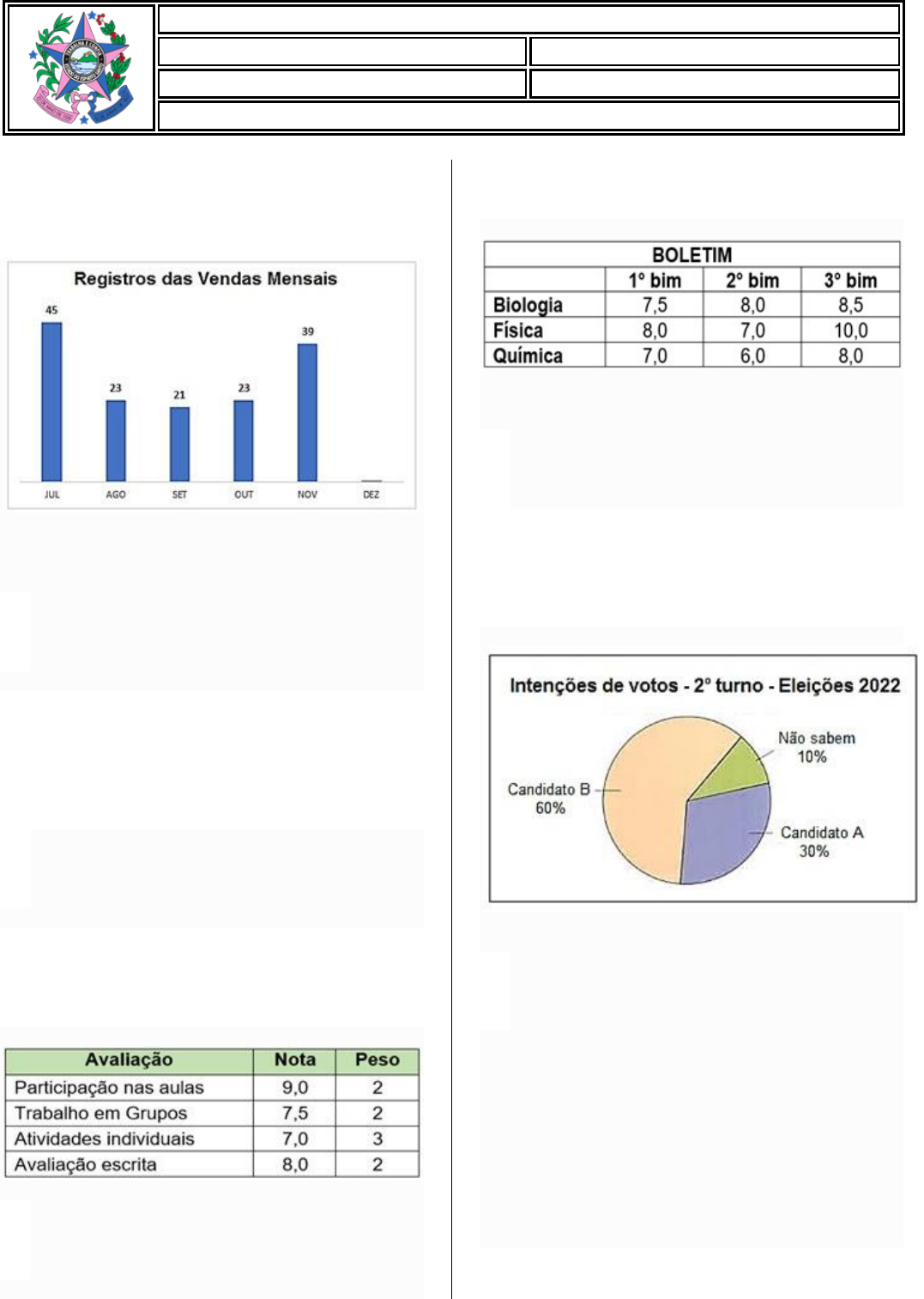 1. Socorro é consultora de beleza e traçou uma meta de vendas para o segundo semestre de 2022 que consiste em vender uma média de 32 produtos mensais. A partir da análise da tabela que representa o consolidado de vendas por mês, o número mínimo de produtos que Socorro precisa vender em dezembro para atingir sua meta é: a) 42. b) 41. c) 39. d) 23. 2. Em uma pesquisa realizada com os comerciantes de uma comunidade para saber quantos tinham CNPJ (Cadastro Nacional de Pessoas Jurídicas) foi constatado que dos 24 comerciantes entrevistados, apenas 3 possuem sua empresa registrada. O percentual de microempreendedores dessa região é a) 12,5%. b) 18,5%. c) 20%. d) 24%. 3. O professor de Luizinho propôs 4 atividades com pesos diferentes ao longo do terceiro período para gerar a média de Matemática de seus alunos. Na tabela a seguir, constam as notas de Luizinho no decorrer do bimestre. Qual a média de Luizinho neste período? a) 8,5. b) 8,2. c) 7,7. d) 7,0. 4. Observe o boletim de Samuel nas disciplinas de Ciências da Natureza, no final do terceiro período letivo. Considerando as notas dos três bimestres, qual a média de Samuel nas disciplinas de Biologia, Física e Química, respectivamente? a) 7,0; 8,0 e 8,3. b) 8,0; 8,0 e 7,0. c) 7,5; 8,0 e 8,3. d) 8,0; 8,3 e 7,0. 5. Os alunos do 9° ano de uma escola realizaram uma pesquisa in lócus a fim de saber as intenções de votos para os candidatos à presidência do seu país no segundo turno. Os dados obtidos condensaram no gráfico a seguir. Sabendo que foram entrevistados um total de 150 estudantes, quantos alunos optaram pelo candidato B? a) 90 estudantes. b) 80 estudantes. c) 60 estudantes. d) 40 estudantes. Utilize o texto e a tabela para responder às questões 6, 7 e 8. Mário é assessor financeiro de uma empresa e ao contabilizar os gastos mensais com pagamentos de salários organizou a seguinte planilha: EEEM GUARAPARI DISCIPLINA: MATEMÁTICA PROFESSORA: DAIANE PIRES DATA: ___/ ___/ 2024 SÉRIE: NOME COMPLETO: https://blogger.googleusercontent.com/img/b/R29vZ2xl/AVvXsEinJol-xt40NWceqFPEyyRQRTDH0N0rVpZ1iYUDDdnWHROMnZzuhDU4fC2KyrKCqS4ARaSsHwTSqjZ826ELgHRcYkdM32d49MJwgOnvN0DShgKllPMcZIp_Pe9IbEesHILI1CiZitrBP1wv9_Tly5Myq8LNX9cnFRTSjAwXvCFIYbtMKr9OorwXIDcffw/s340/3.jpg https://blogger.googleusercontent.com/img/b/R29vZ2xl/AVvXsEgEs9V3N9SYZHlIfNS9dhe8D4f4NST6q9xJBQyvUblaBChUMOKH5BxWMIZkuBYyRJFYNAk3rWAIblvW6dt0IjX0AfvpyIZKzrzKk-vbXpZjPD6ysAJSY39Wxt46kFwDuV69e6bAvM5zTijV2Fg81lf8dvFvyAzLj-SOae7M0vK0QleBees78r0dzCrHig/s333/1.jpg https://blogger.googleusercontent.com/img/b/R29vZ2xl/AVvXsEg7YVa9nQTKFhs5XfSvnzadHwdWACIUR9CRH5pV7J6zJ-aZSFxLq07RwOxSpu38j3nfz_M71wY-nZOyIPGo10YesYx9W5ZQTILCRdBbWDkXxuPjlMYUVh8Skbv2rxsaSMIfvMilPzyXjVP2hB3n8n1-nf2PaYxzp0rrKaEzst97Fc6plT4HsxxOdM9YzQ/s350/2.jpg https://blogger.googleusercontent.com/img/b/R29vZ2xl/AVvXsEimIDZZvCQvaaCkDsUSWX37hwVzw_qRYIimhu6-cfuBcNMDBaSX-_U9EKGSanhiw0NWZo1ZSpsquJPyzcwUZr10UVfxwuAVdGIBgTWgwa8-e8iJH2VeqgBYTrurCXNcbBWDD5JxN9U_5OLSxDo3AI-2vSJm1fwMKXMVQ13FtFbsjHreOq1wlQZVaF6bDw/s349/3.jpg 6. Qual o valor do montante gasto com pagamento de salários nesta empresa mensalmente? a) R$ 17.474,00. b) R$ 20.806,00. c) R$ 22.926,00. d) R$ 26.426,00. 7. Os valores que representam a moda e a mediana dos salários da empresa, nessa ordem, são: a) 1212,00 e 2120,00. b) 1818,00 e 1818,00. c) 2120,00 e 2120,00. d) 2120,00 e 1818,00. 8. O valor que mais se aproxima da média dos salários desta empresa é a) R$ 2.402,00. b) R$ 2.642,00. c) R$ 3.303,00. d) R$ 3.775,00. 9. Na preparação para o Conselho de Classe o Diretor de Turma realizou a assembleia de turma com uma amostra de 13 alunos. Veja gráfico do resultado da avaliação do professor de Geografia segundo o critério metodologias utilizadas nas aulas. De acordo com o gráfico, o percentual de alunos que considera o professor ótimo está mais próximo de: a) 44%. b) 46%. c) 50%. d) 51%. 10. Maurício é professor de Língua Portuguesa de uma escola e utiliza como critérios para obtenção da média bimestral a média ponderada de três tipos de avaliação (qualitativa, trabalho parcial e prova bimestral), cujos pesos são 1, 2 e 3, respectivamente. Se um aluno obteve nota 7,0 na qualitativa, 7,0 na parcial e 8,0 na bimestral, qual foi a média desse aluno? a) 7,0. b) 7,5. c) 8,0. d) 8,2. https://blogger.googleusercontent.com/img/b/R29vZ2xl/AVvXsEjAgupuXZaCTQ5eoyCxjBheSpcBDTKTJ3wjbSNSfMTgytjTvQtyBilRjgXjv-gJnJ_kdbCA3QKvZGnVibmQTIRtxootE_aOHj-6yDHUHL9PISjEAudwXcfHPJmXu4HniegTl9OcZiYgD3-WmNF3VE2O9Lqna314Ad6N1OnMQa4cvSzYwJiGBWc-CbMTBQ/s319/3.jpg https://blogger.googleusercontent.com/img/b/R29vZ2xl/AVvXsEgLMIb--esAL-fwzJgOE_2Z0WgW04zNzRo2Fi7HEiKEsfu_k0EA41i9Xs1aEXvDy9Q9tZuT-Lw9fKE3codaZK-BtWJFh-uT_O_xW2JSWCrUMZgZetMl4gXhs3i_6YNF9utTWKrMczg_l-3jGXCK09Qxerm1tu5EH2FaflgY8YgeuRj4qnQm-funFzy66Q/s311/4.jpg